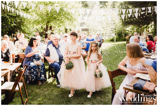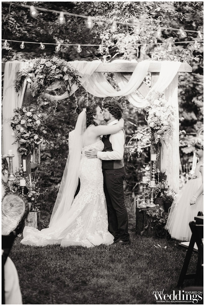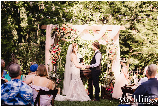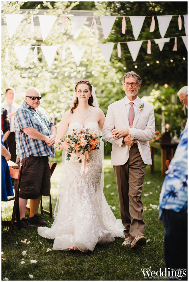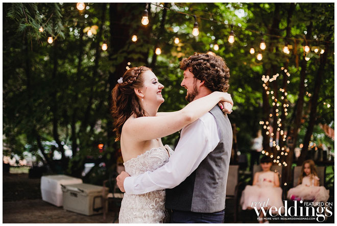 For the ceremony, they transformed the bride’s parents’ back yard. Lights were strung up and small pennant flags blew in the wind. “Nik and I chose not to have a bridal party and it worked out perfectly,” Jen says. “The ceremony started with Nik’s former church pastor opening in prayer, and then my dad took over to officiate the wedding. It was so special to have him not only walk me down the aisle but to marry us as well.”