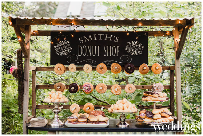 All the tables, which were made by the bride’s father, were placed in such a way that they shaped the aisle for the ceremony so guests did not have to relocate for the reception. Attendees dined on wood-fired pizza, drank wine and enjoyed a donut bar.