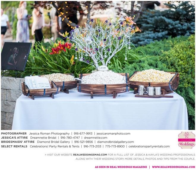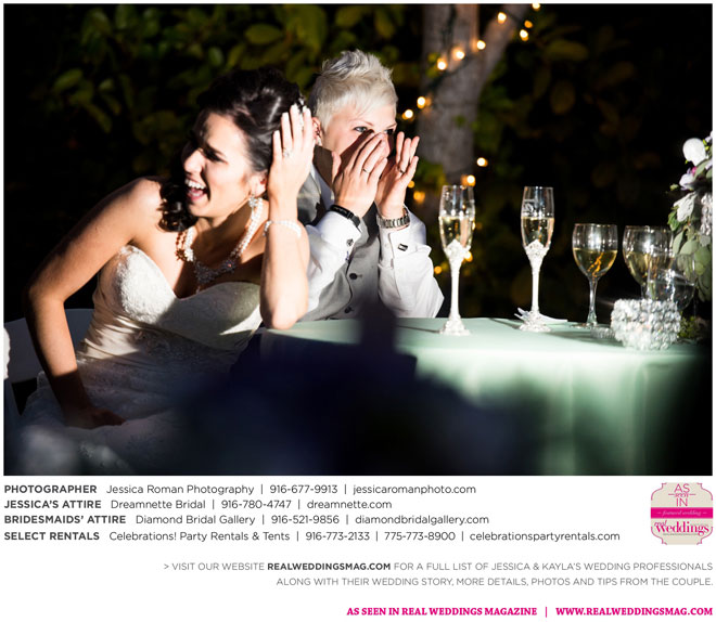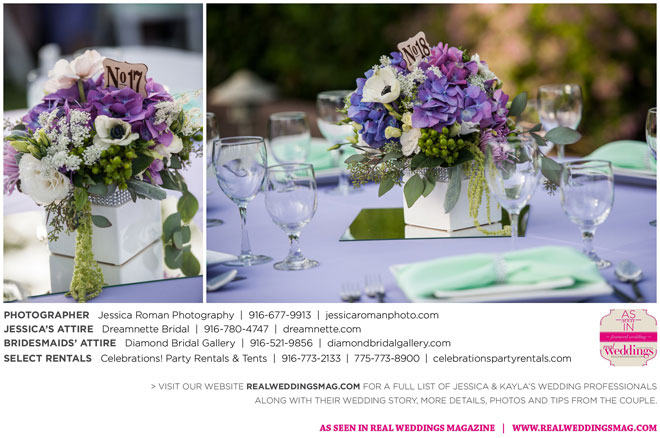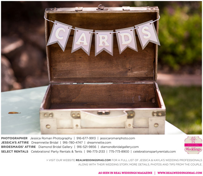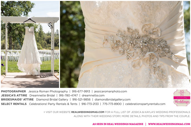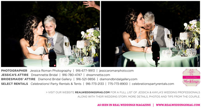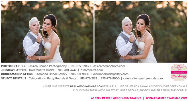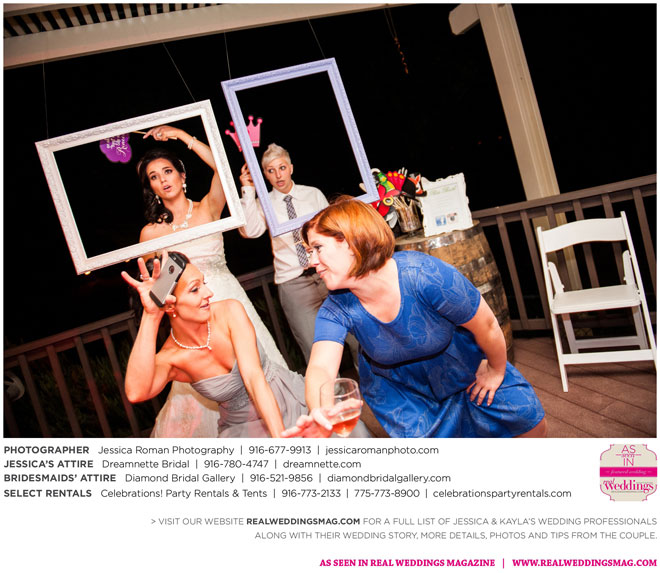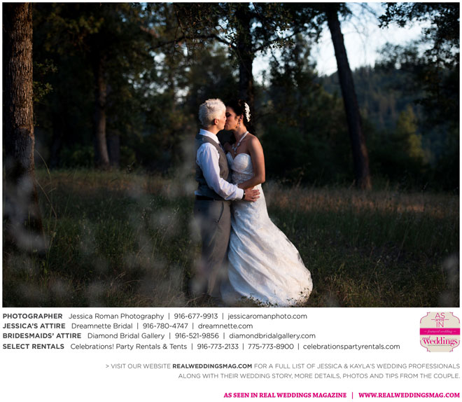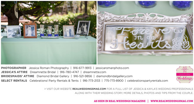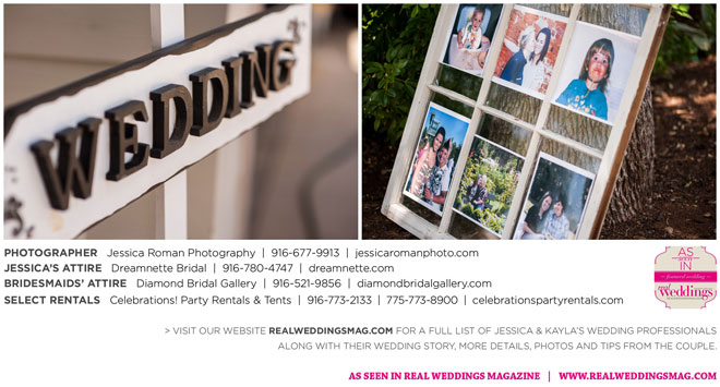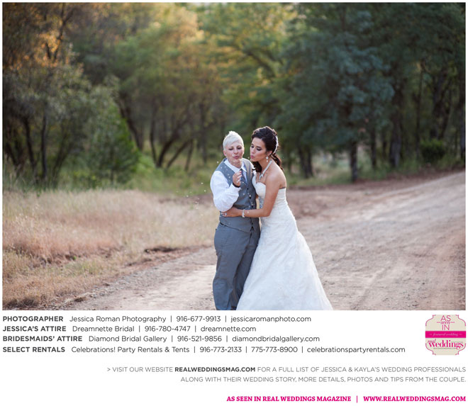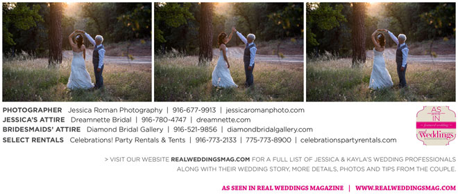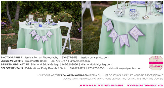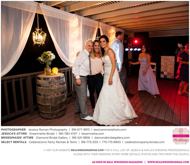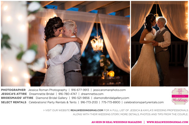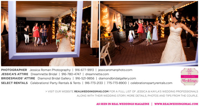 Overall, the wedding was a mix of both vintage and modern styles, with a nice touch of glamour. “We incorporated chandeliers and shabby chic items, along with our custom pieces,” says Jessica. “We also had tons of lighting wrapped around the trees. Everything just glowed at night! Both Kayla and I felt it was the perfect celebration and incorporated everything we wanted.”