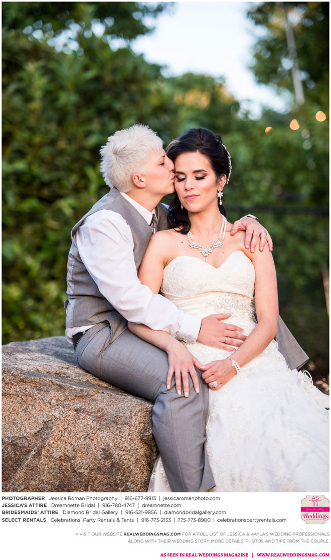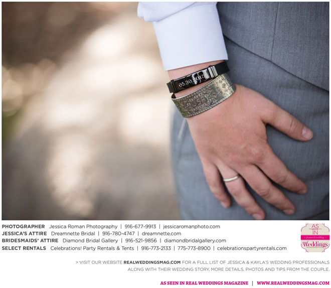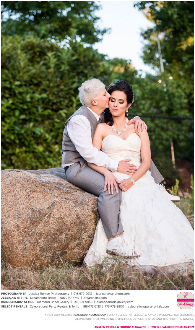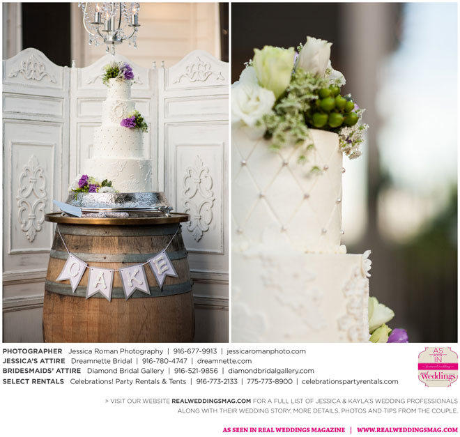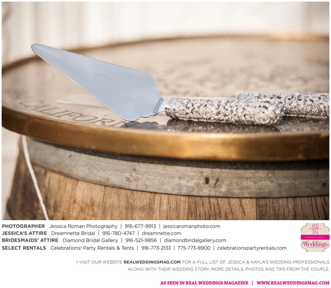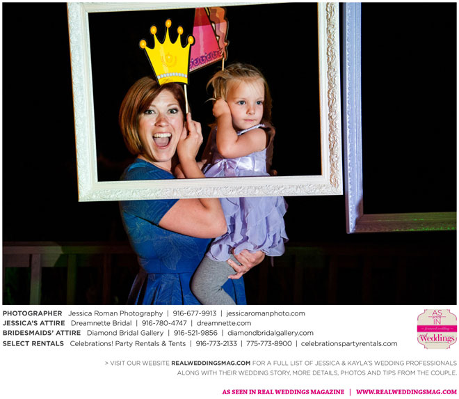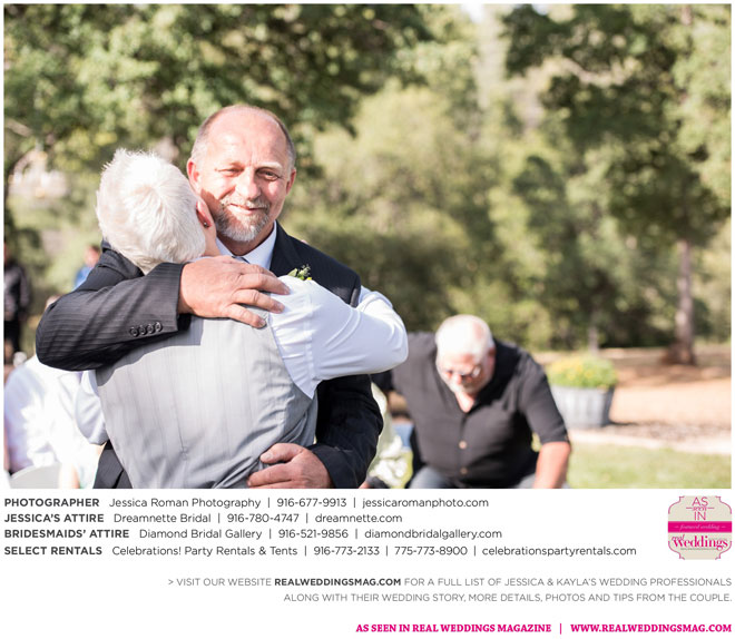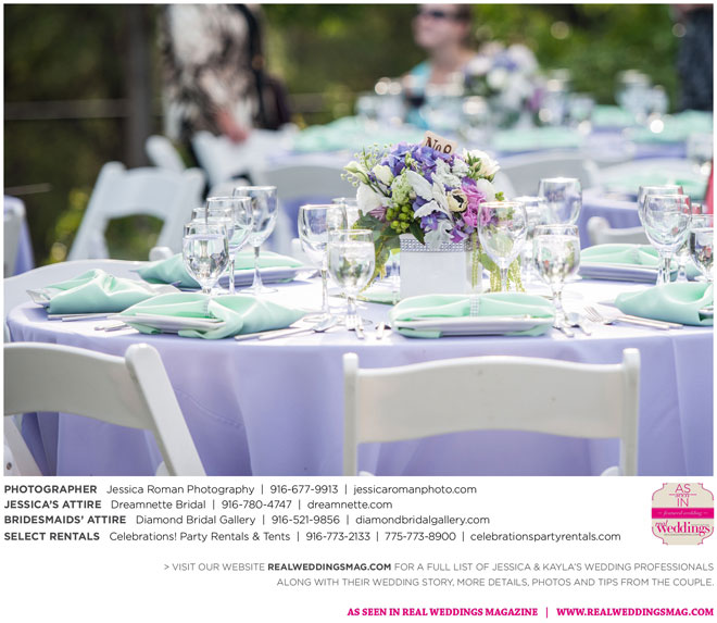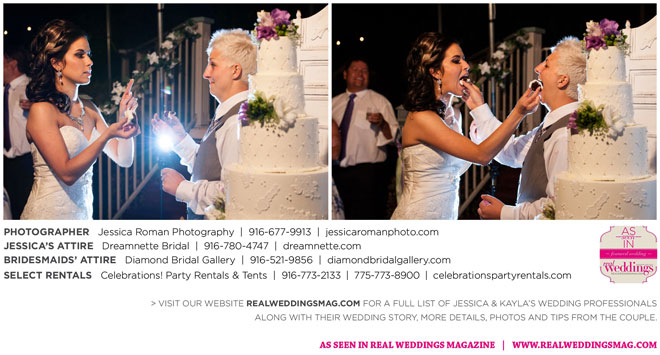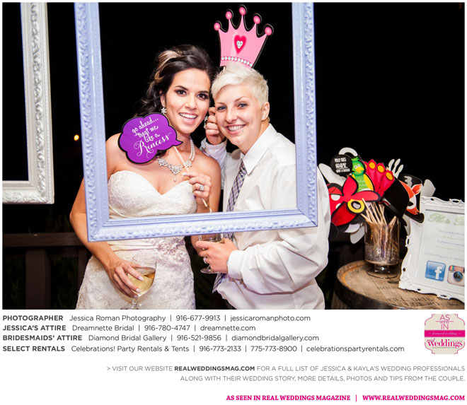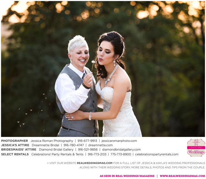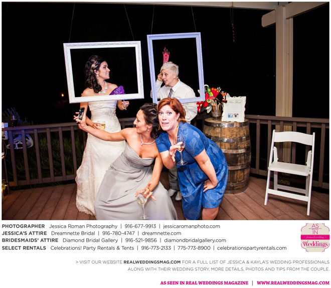Overall, the wedding was a mix of both vintage and modern styles, with a nice touch of glamour. “We incorporated chandeliers and shabby chic items, along with our custom pieces,” says Jessica. “We also had tons of lighting wrapped around the trees. Everything just glowed at night! Both Kayla and I felt it was the perfect celebration and incorporated everything we wanted.”