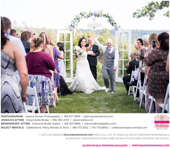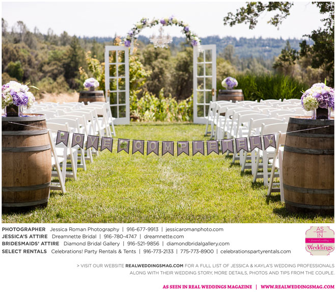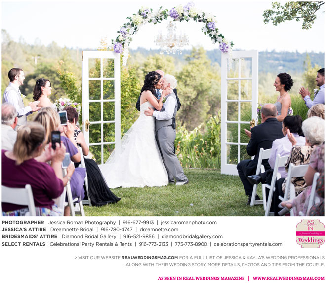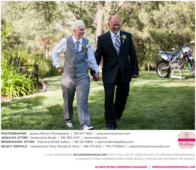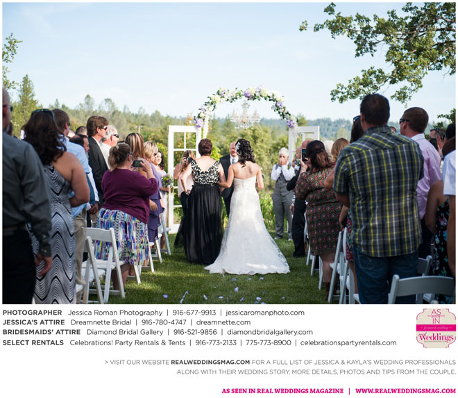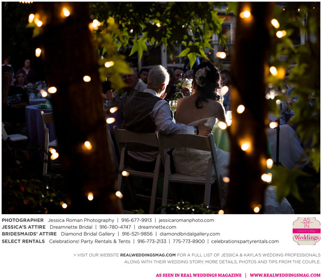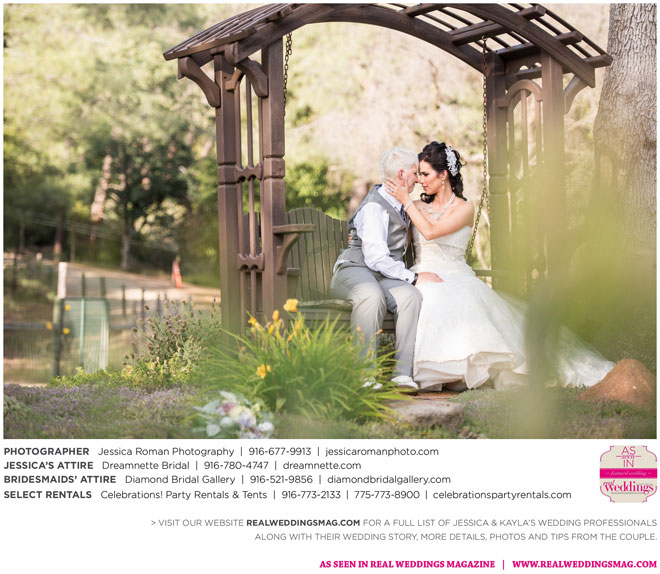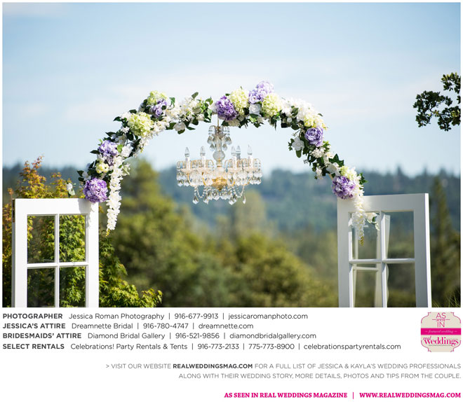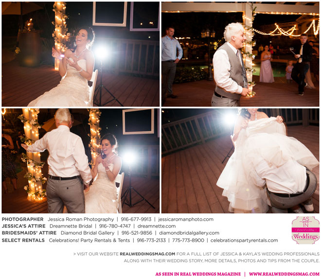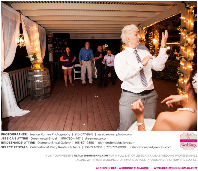 The duo also took on many DIY projects for the décor. “Kayla and her father put stands on French doors and attached wood pieces to form an arch that could hold a chandelier, and I decorated the arch with flowers,” Jessica says. “We also made a custom garden arbor with old doors for our guests to walk through into the ceremony. It almost had a secret garden feel.” They had different visions for decorating the dance floor, but with compromise came up with something they both loved. “Let’s just say by the end of it, I learned to say, ‘Yes, dear’ very well,” Kayla says.