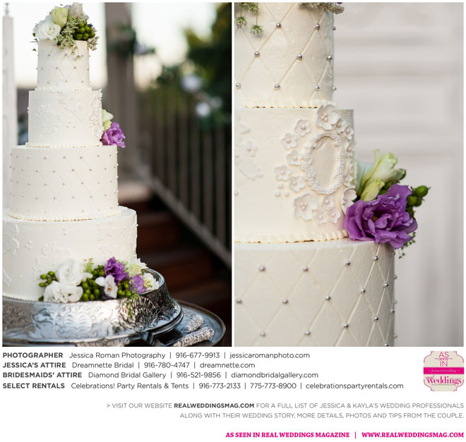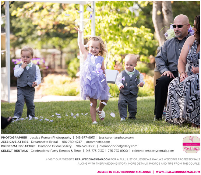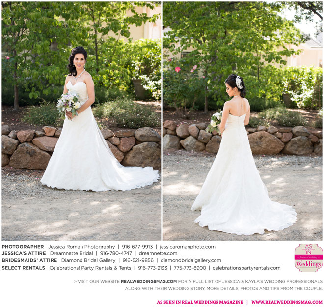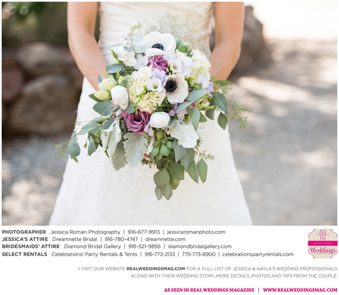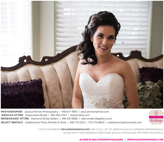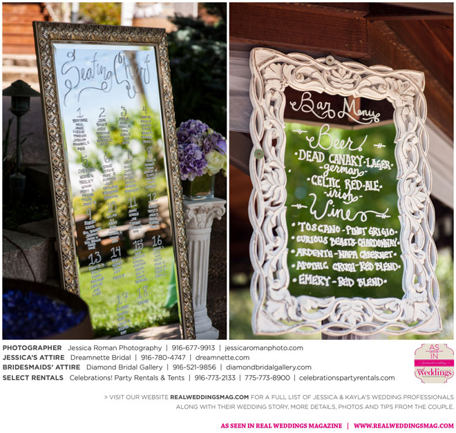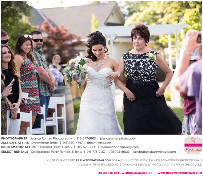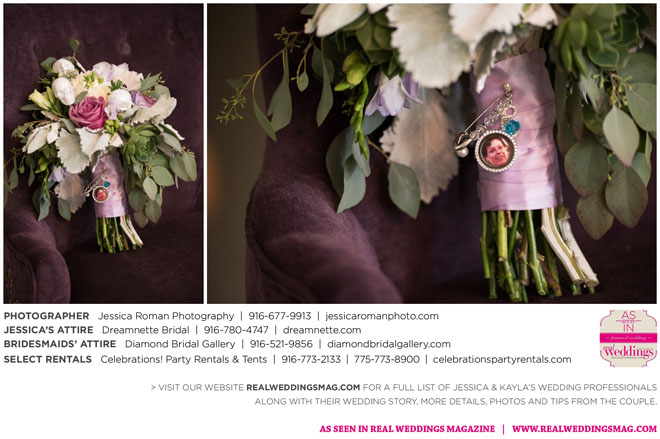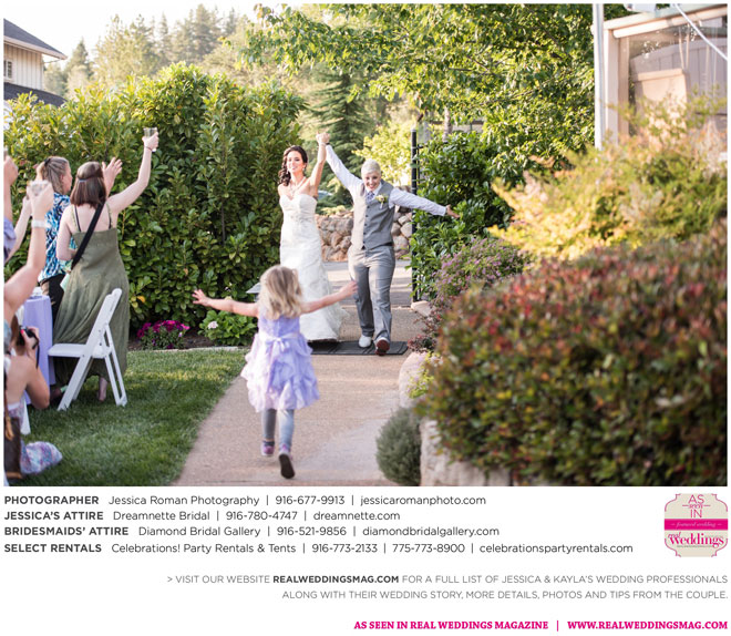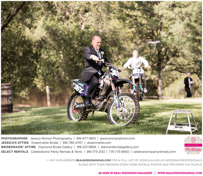 The duo also took on many DIY projects for the décor. “Kayla and her father put stands on French doors and attached wood pieces to form an arch that could hold a chandelier, and I decorated the arch with flowers,” Jessica says. “We also made a custom garden arbor with old doors for our guests to walk through into the ceremony. It almost had a secret garden feel.” They had different visions for decorating the dance floor, but with compromise came up with something they both loved. “Let’s just say by the end of it, I learned to say, ‘Yes, dear’ very well,” Kayla says.