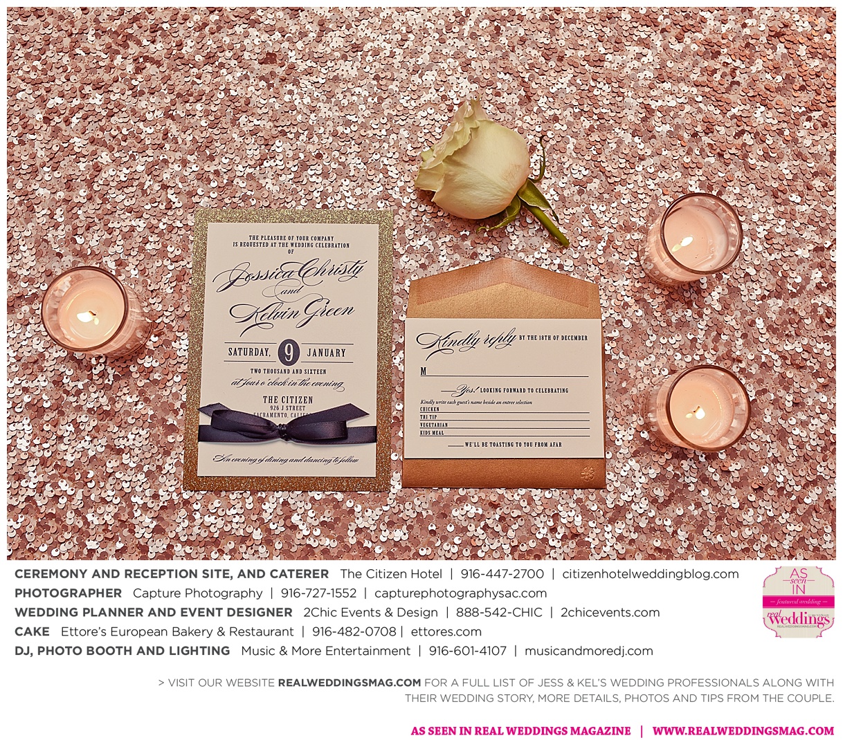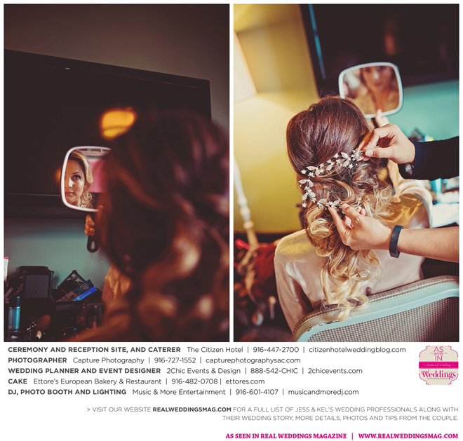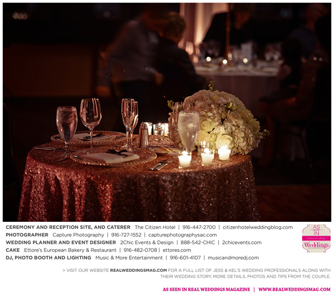 The couple took into account each other’s wishes and vision when planning out the wedding. “Kel wanted a winter wedding, and so I felt like I needed it to be season appropriate with colors and décor,” says the bride. “I wanted to walk into my ceremony space and reception space and be blown away.” She got plenty of inspiration from Pinterest and engaged the help of wedding planner, Aimee Wendell with 2Chic Events & Design. “She was able to take our vision from our description and exceed any expectations we may have had,” says Jess.