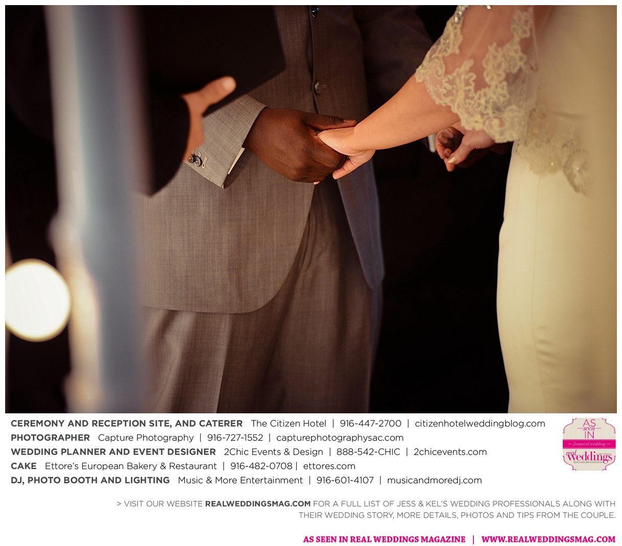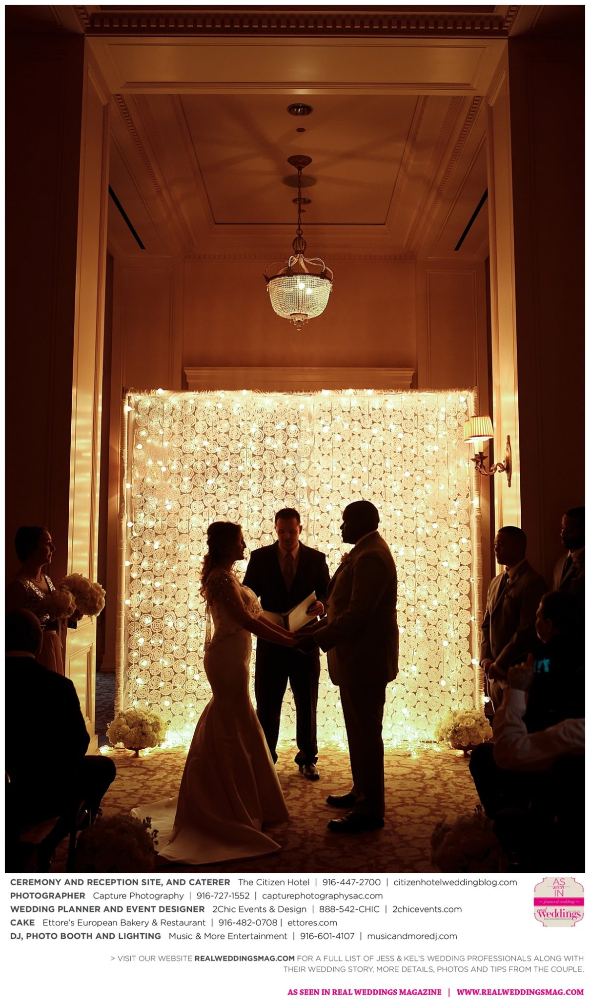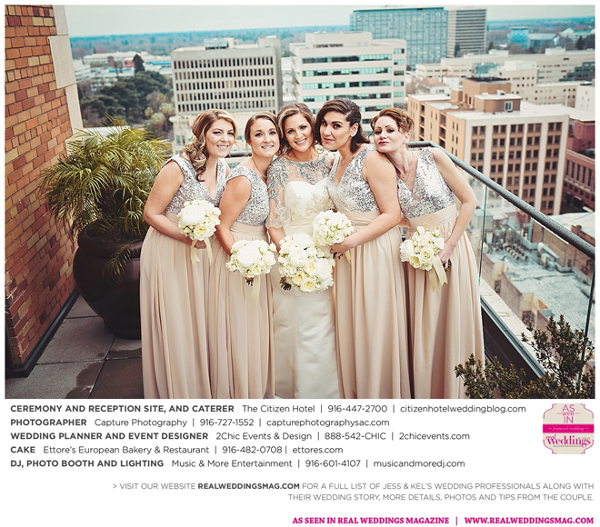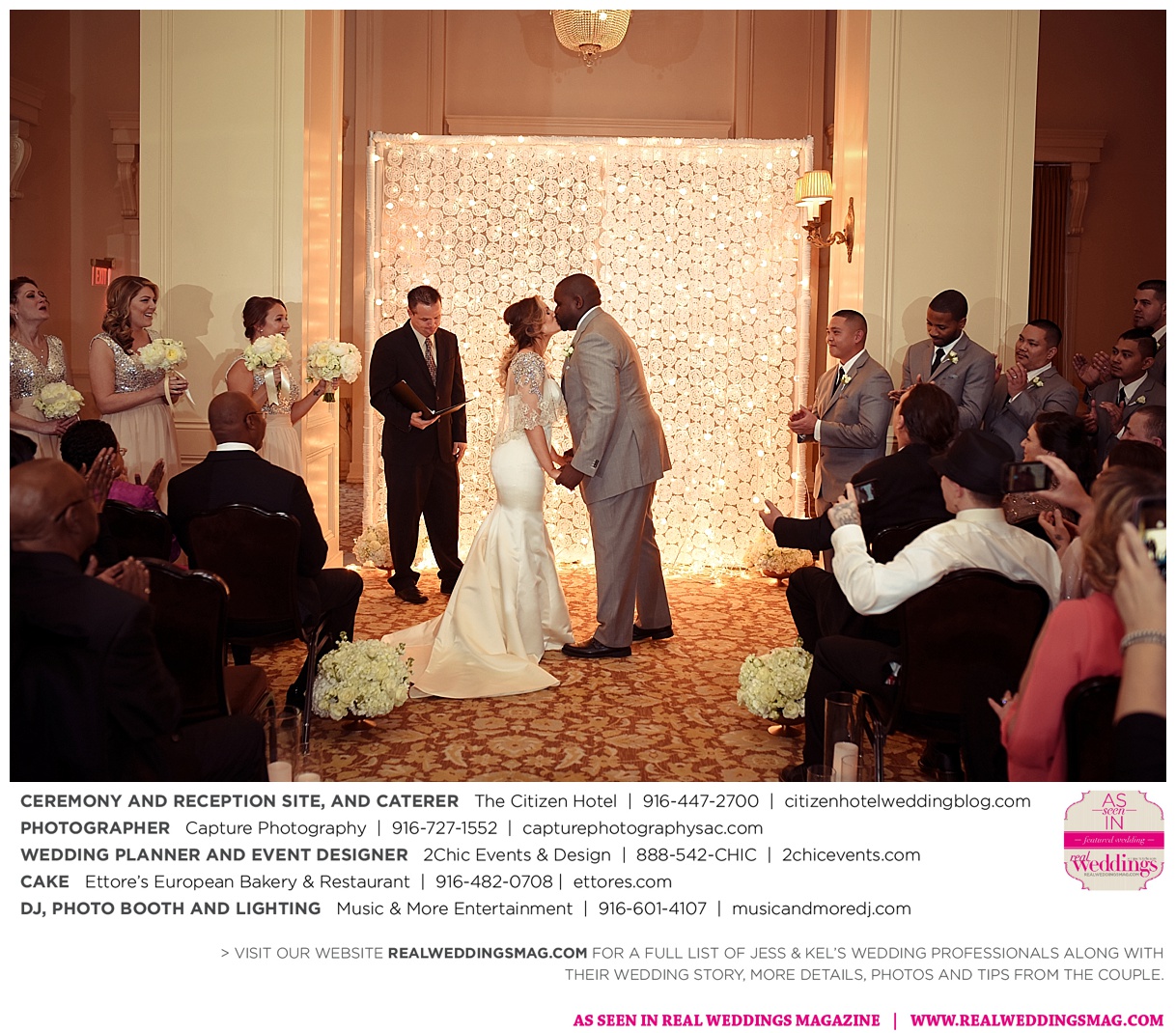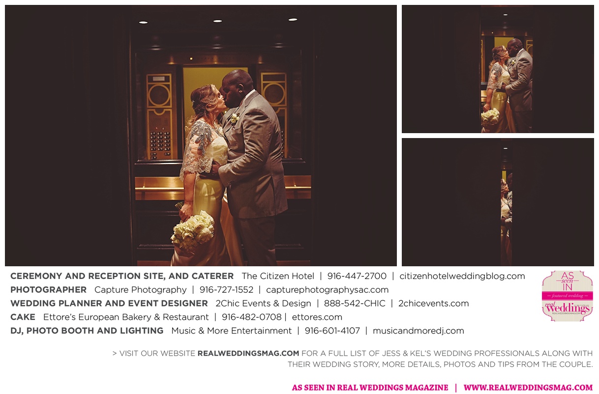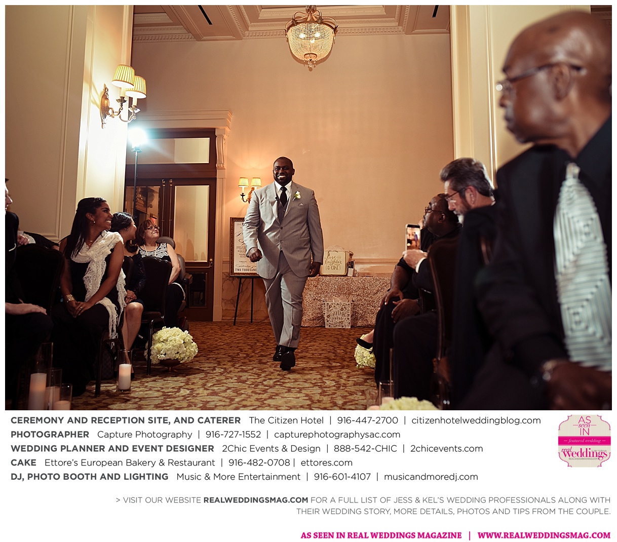 The couple exchanged vows in a romantic ceremony in The Citizen Hotel’s Plaza Park Ballroom surrounded by friends and a backdrop of soft white lights. “I was very nervous prior to coming in from the lobby,” recalls Kel. “I was trying to shake the nerves out by hyping myself up as if I was getting ready to step on a football field. As the door opened and everyone rose to their feet, all I did was hope I wouldn’t trip while walking down the aisle.”