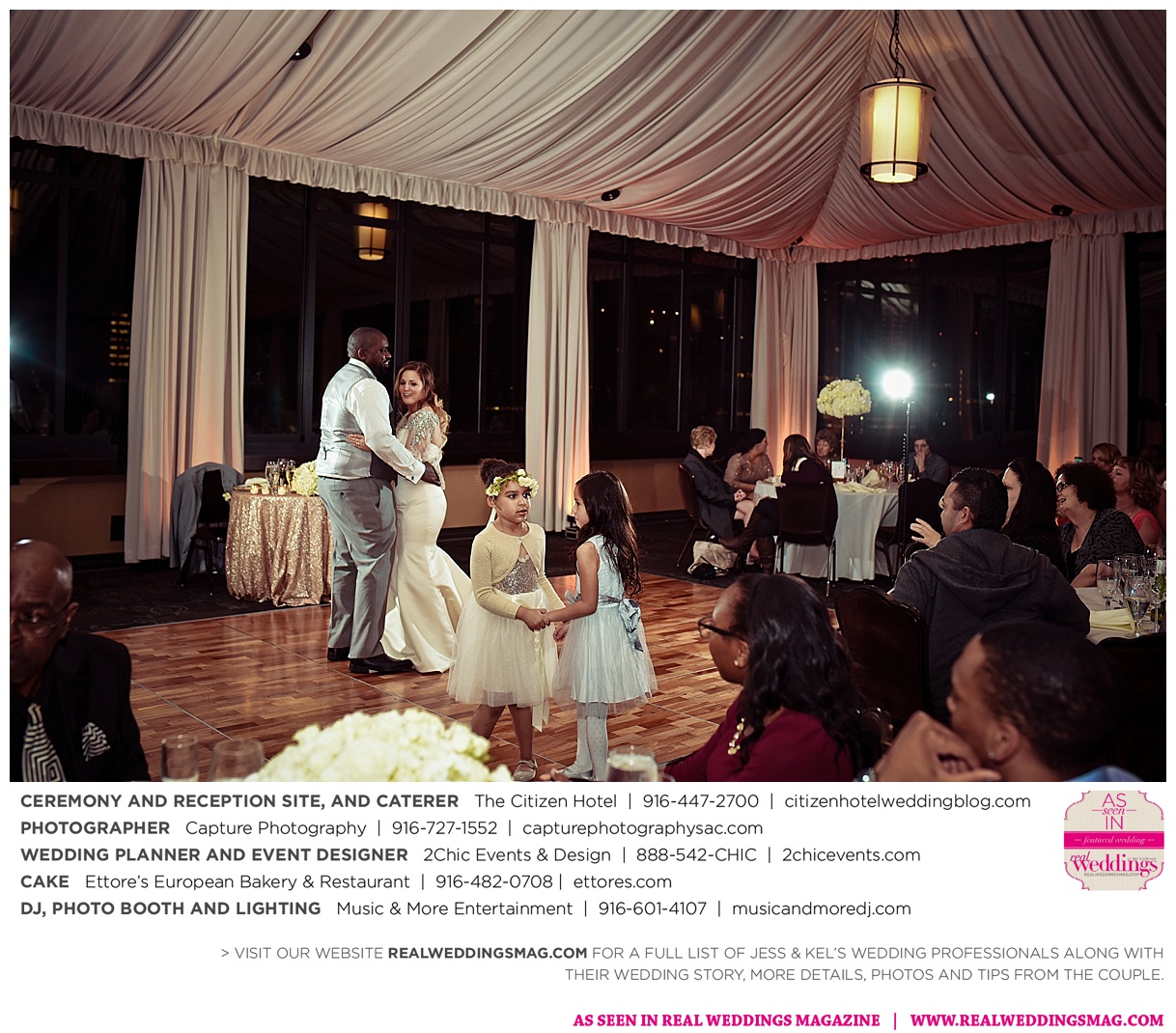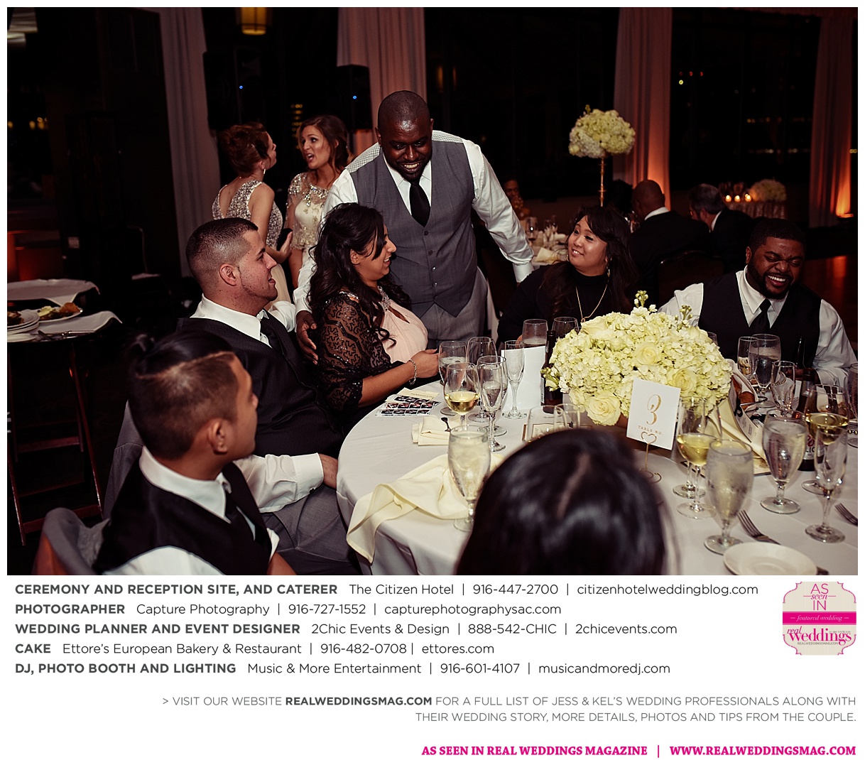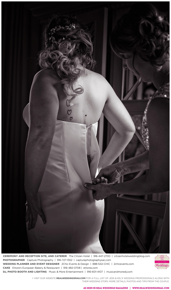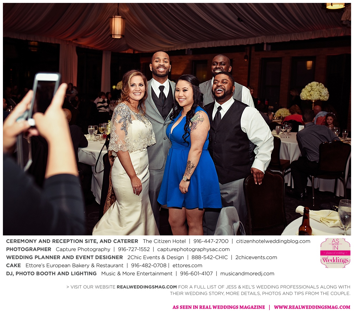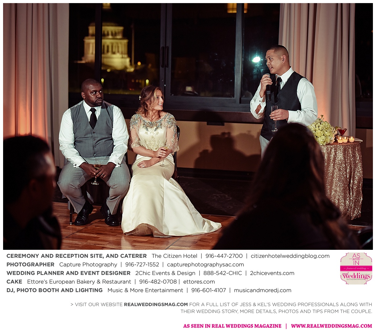 The couple exchanged vows in a romantic ceremony in The Citizen Hotel’s Plaza Park Ballroom surrounded by friends and a backdrop of soft white lights. “I was very nervous prior to coming in from the lobby,” recalls Kel. “I was trying to shake the nerves out by hyping myself up as if I was getting ready to step on a football field. As the door opened and everyone rose to their feet, all I did was hope I wouldn’t trip while walking down the aisle.”