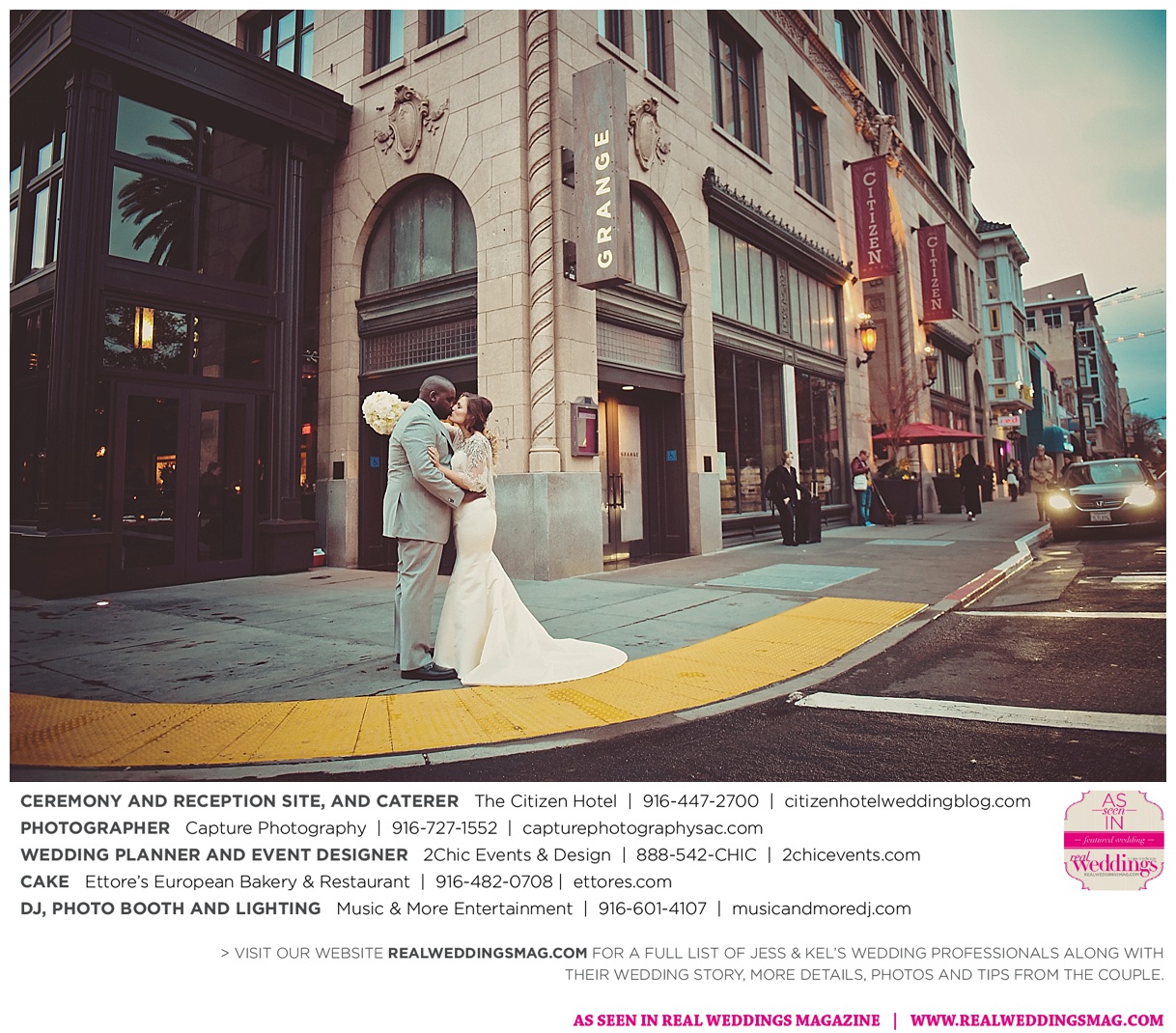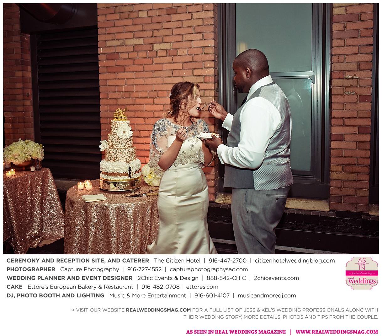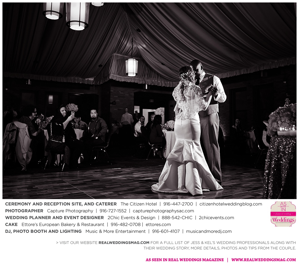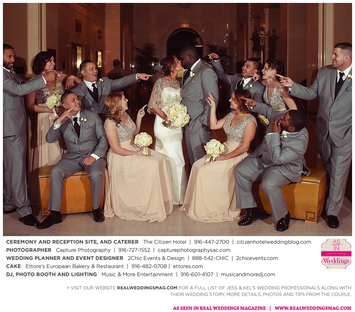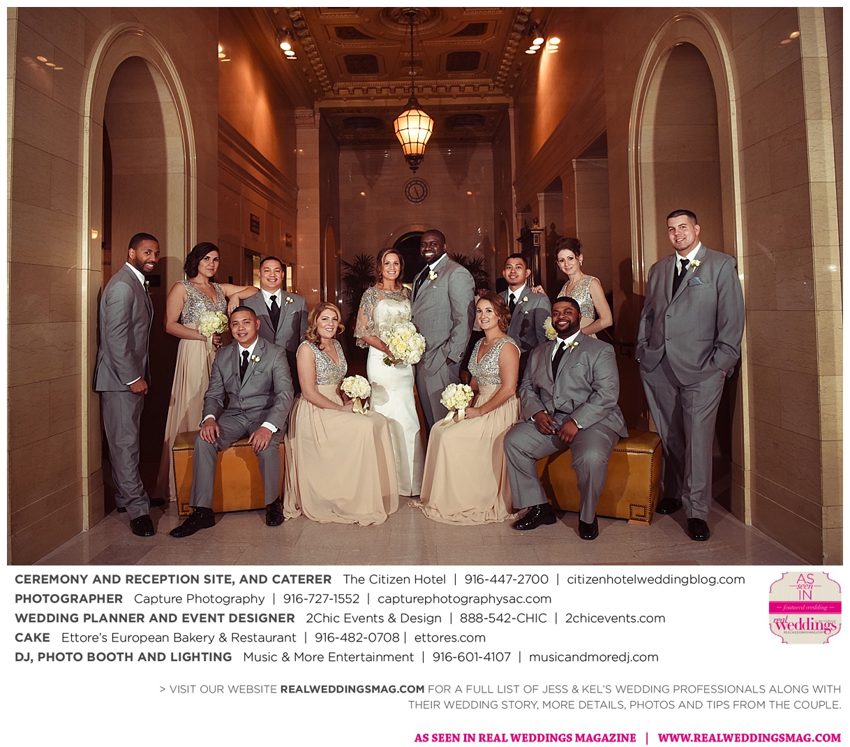 The couple exchanged vows in a romantic ceremony in The Citizen Hotel’s Plaza Park Ballroom surrounded by friends and a backdrop of soft white lights. “I was very nervous prior to coming in from the lobby,” recalls Kel. “I was trying to shake the nerves out by hyping myself up as if I was getting ready to step on a football field. As the door opened and everyone rose to their feet, all I did was hope I wouldn’t trip while walking down the aisle.”