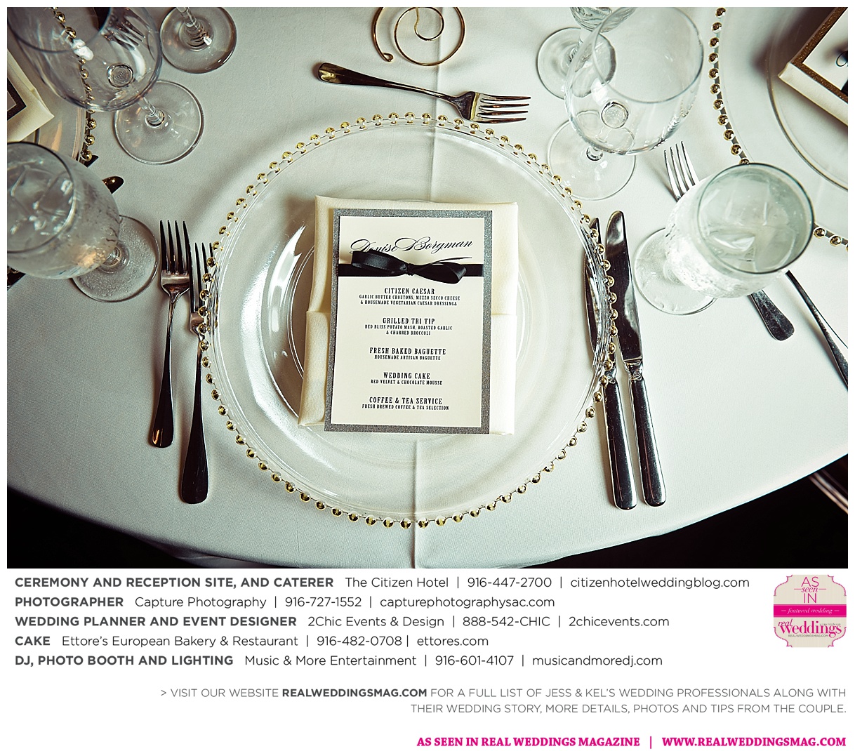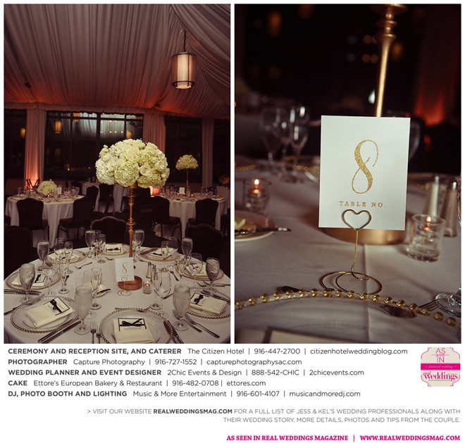 The reception was held upstairs in the hotel’s Metropolitan Terrace. “We wanted the ceremony space to be a little on the simple but elegant side so that our reception space would be a surprise and leave an everlasting impression,” says Jess. “The table settings, linens, flowers and lighting captured everything beautifully.