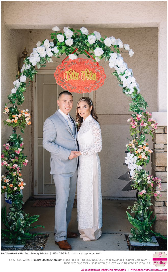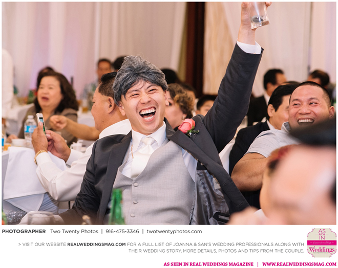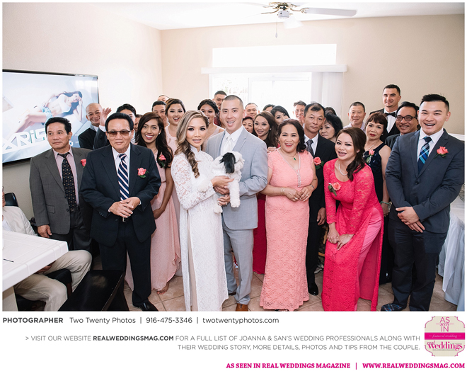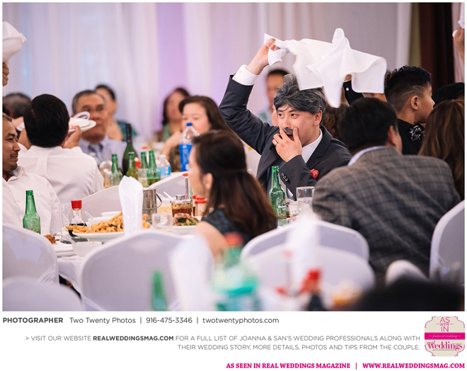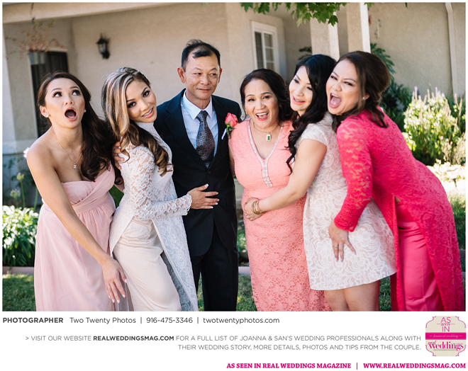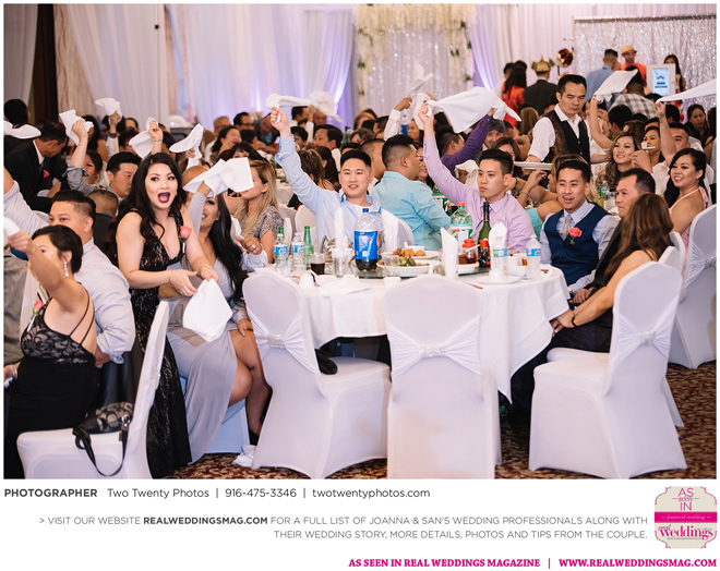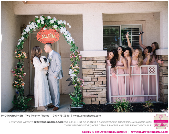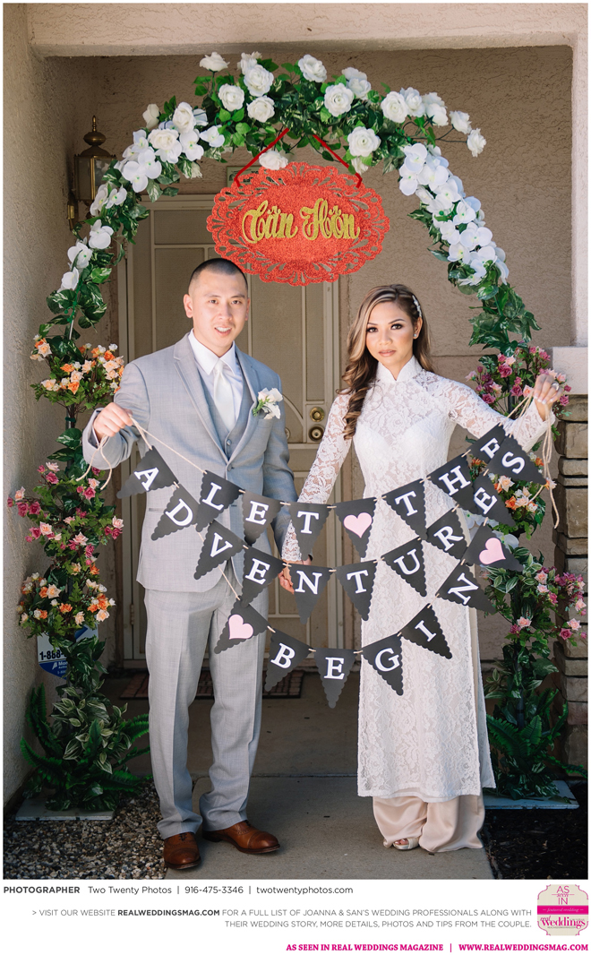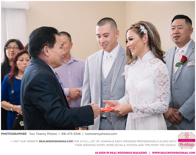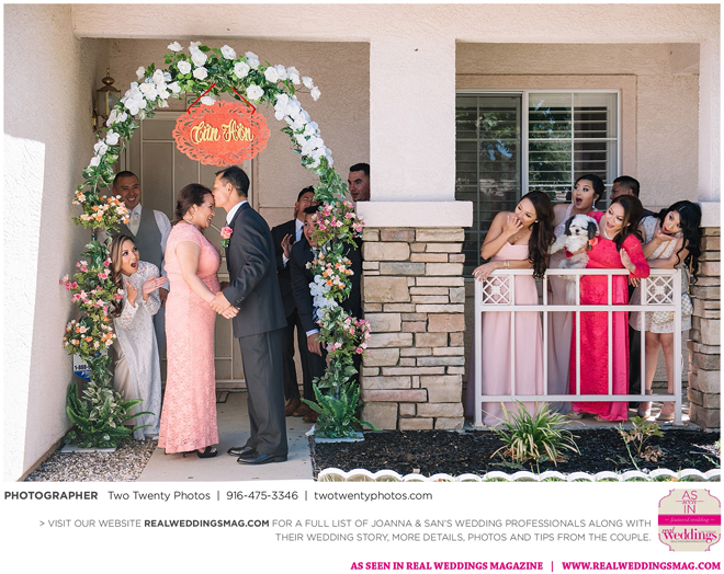 The Vietnamese celebration started in the morning with a traditional tea ceremony at the bride’s home. The groom’s family visited Joanna and her parents, offering gifts. Following tradition, the groomsmen had to play games to enter the house. Cue the silly moments with pink balloons; guys wearing colorful underwear over their formal suits; and passing a piece of seaweed by mouth, groomsman-to-groomsman, until they reached the groom.