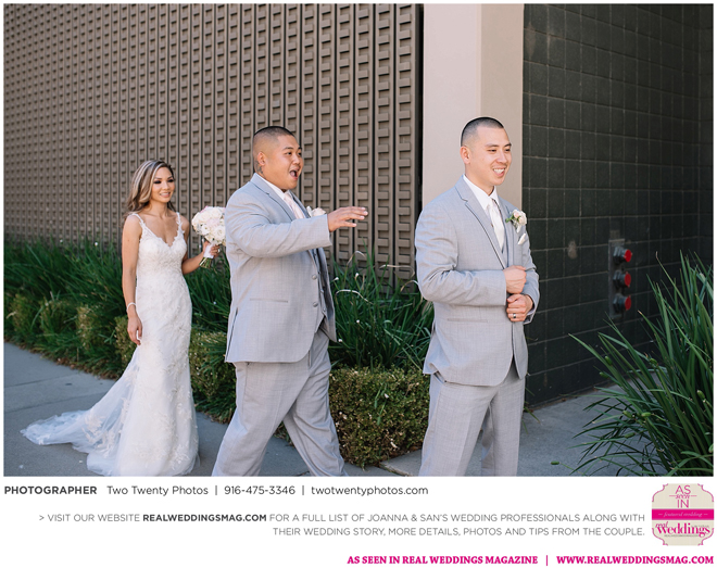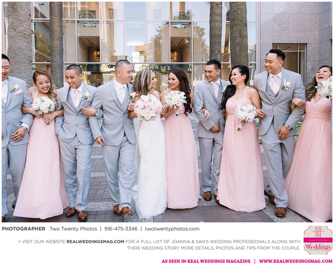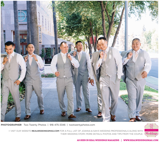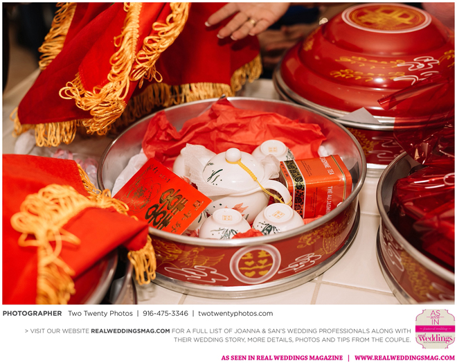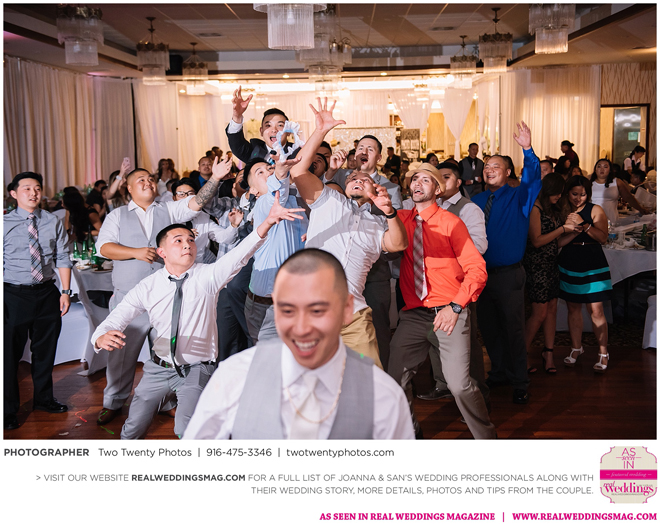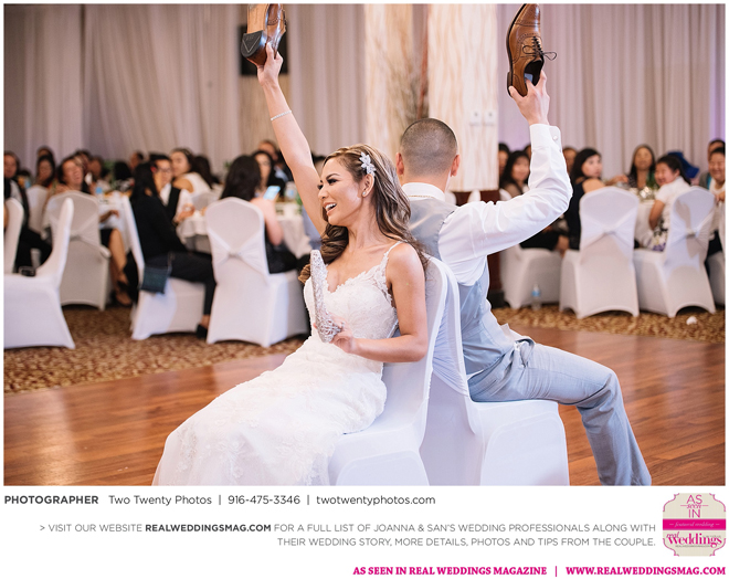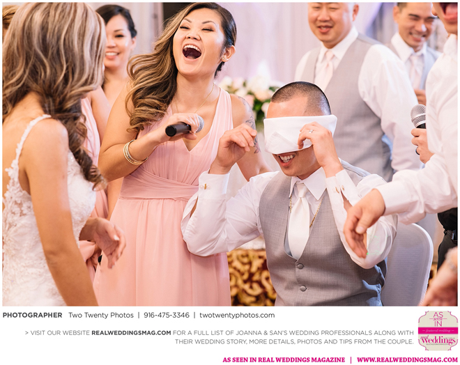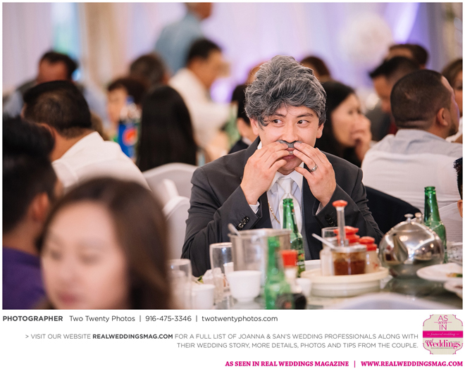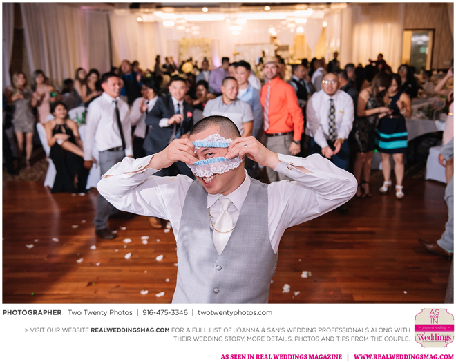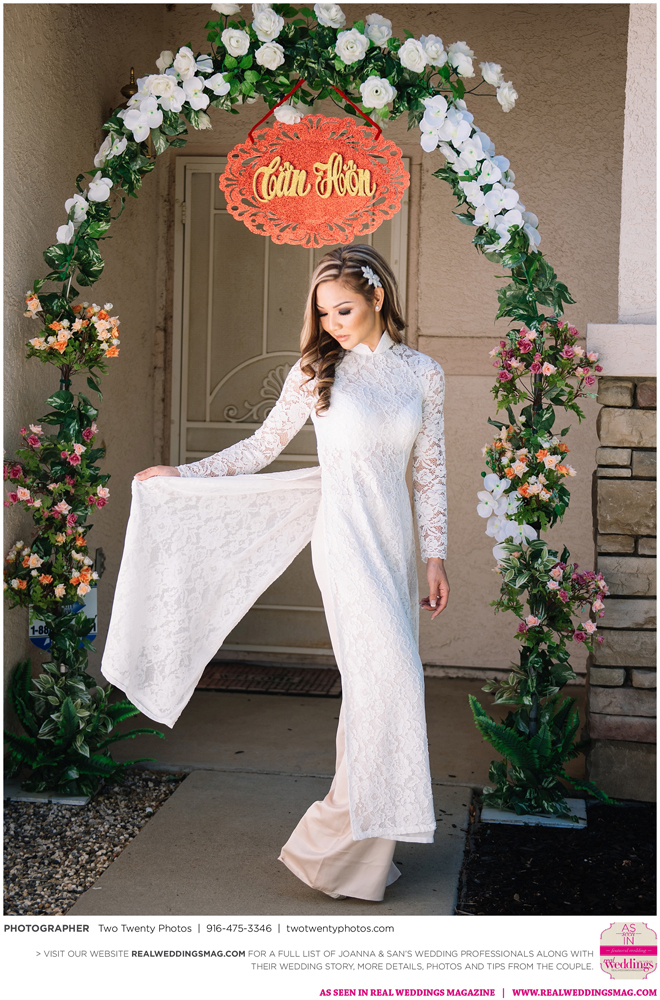 The Vietnamese celebration started in the morning with a traditional tea ceremony at the bride’s home. The groom’s family visited Joanna and her parents, offering gifts. Following tradition, the groomsmen had to play games to enter the house. Cue the silly moments with pink balloons; guys wearing colorful underwear over their formal suits; and passing a piece of seaweed by mouth, groomsman-to-groomsman, until they reached the groom.