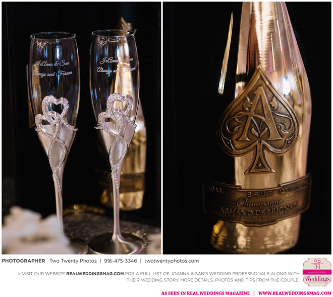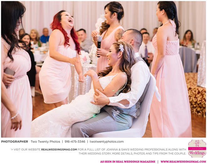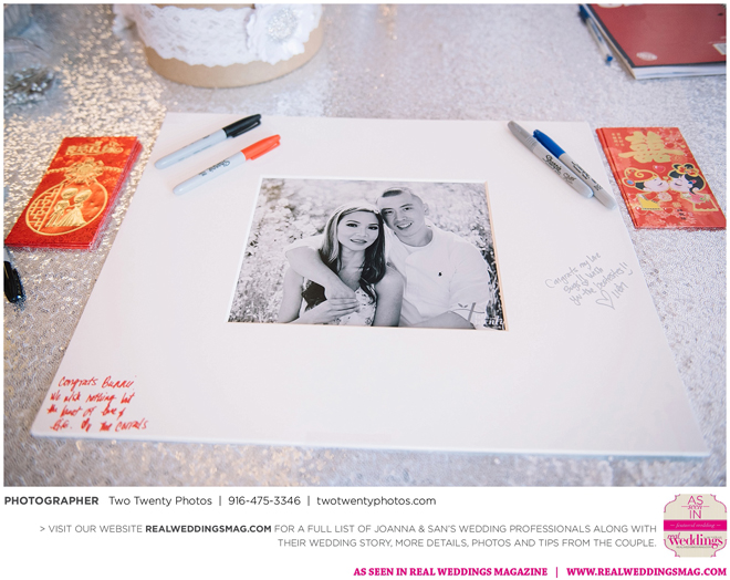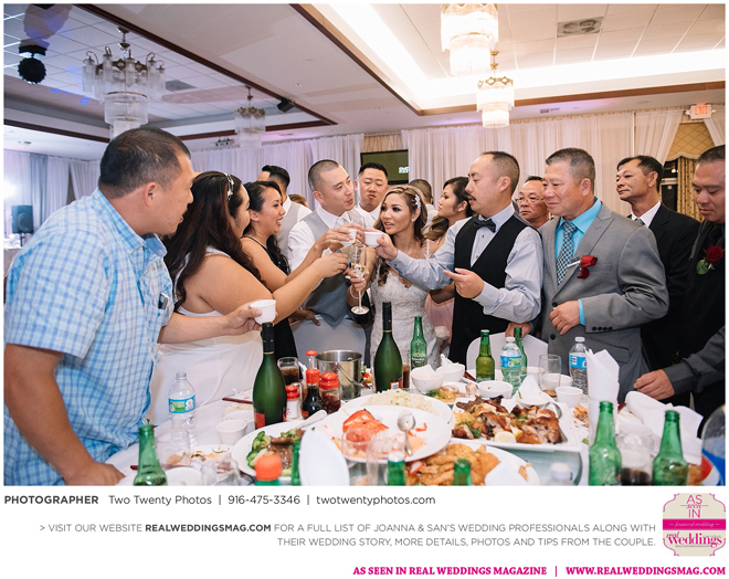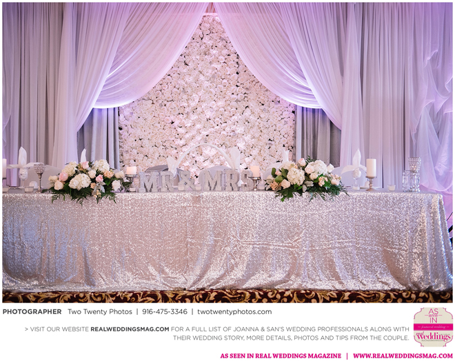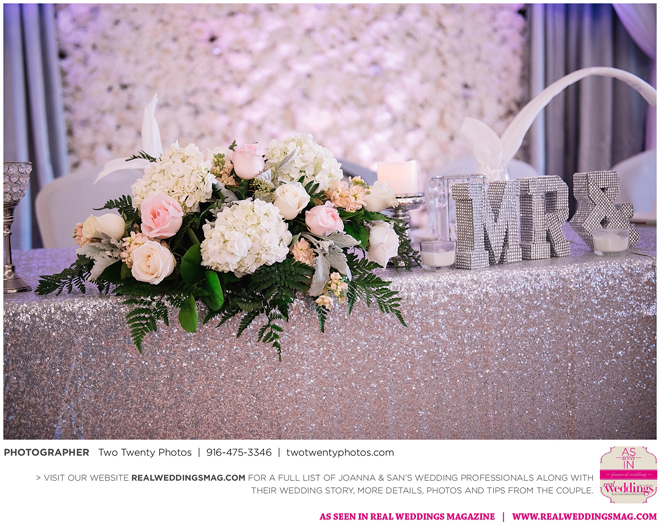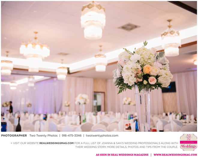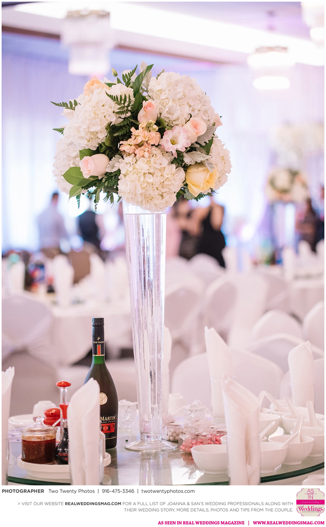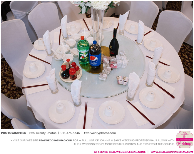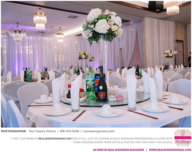 The reception, held at the Asian Pearl restaurant, featured a 10-course meal complete with a BBQ platter, steak cube stir-fry, shark fin scallop soup, deep friend shrimp balls and Peking duck with buns. The meal finished with a four-tier vanilla cake. The glam design and color scheme were impeccable with pink and white styling and touches of sparkle.
