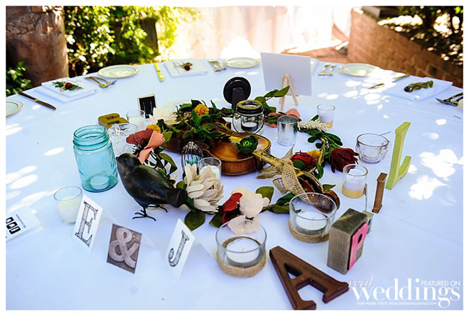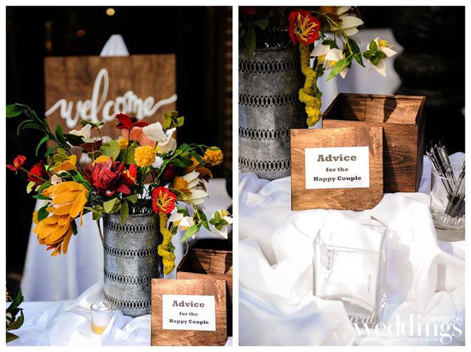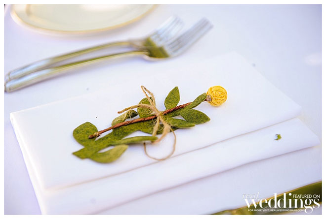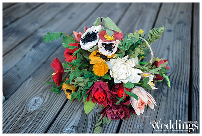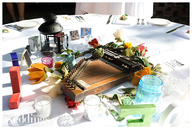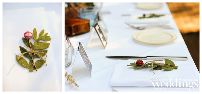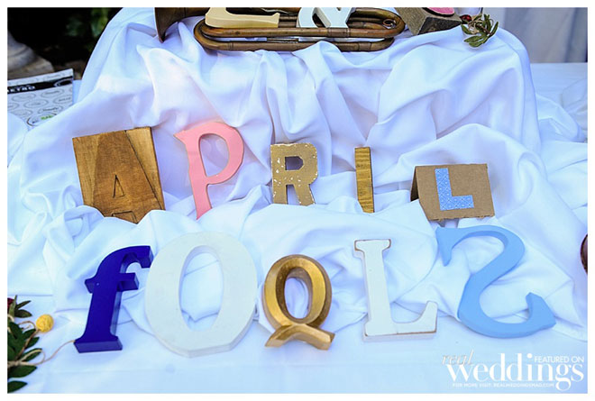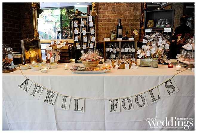 Much of the décor came from the couple’s home. They did a lot of DIY projects too. They printed “April Fools” banners and letters for the tables; and they hand made the welcome sign. Johanna made all the flowers from wire and felt; Eric made wooden candleholders for the tables and he built the photo booth, including programming the screen interface from scratch. They also created clipboard activity kits for their youngest guests.
