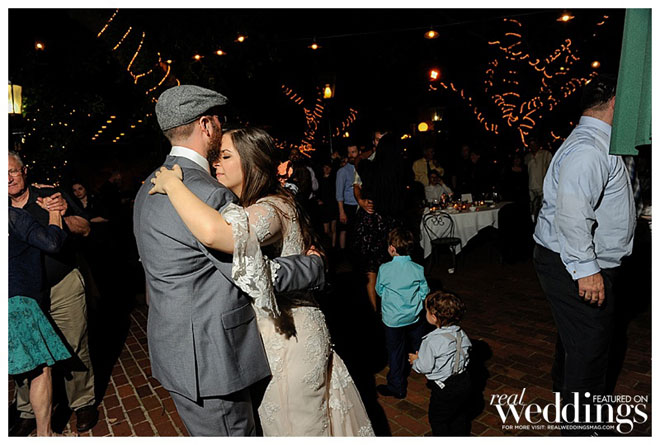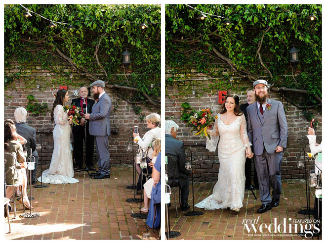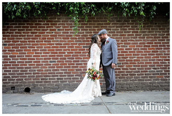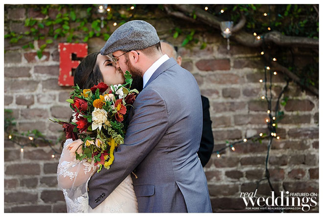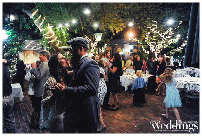 The newlyweds’ favorite moment came at the end of the ceremony, when they walked to the cobblestone alley behind the restaurant for pictures. “While we were there, we held and kissed each other,” says Eric. “I felt extremely happy and had so much love in my heart at that moment. I did not want to let her go.”