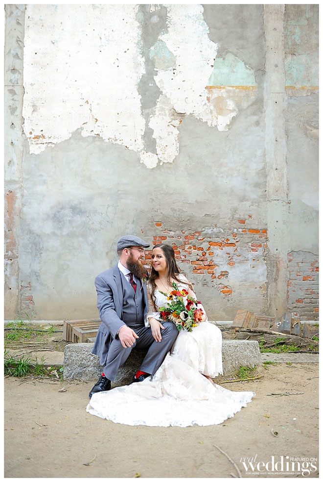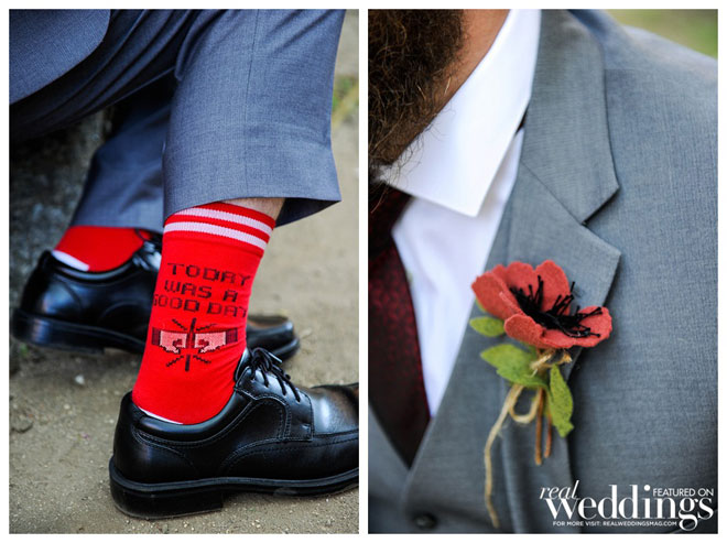 The bride and groom showcased their personalities in their attire. Johanna wore gold flats for the ceremony and then went mostly barefoot the rest of the celebration. Eric wore socks reading, “Today was a good day” that he bought the morning of the wedding!