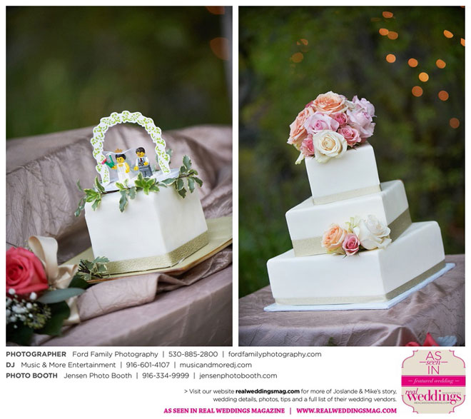 After a dinner of lamb and salmon, Joslande, Mike and their 77 guests enjoyed a traditional wedding cake with buttercream fondant and topped with fresh roses. Mike had a gluten- and dairy-free groom’s cake, which had a LEGO bride and groom topper. Mike also loved another detail: having pewter superhero pins on the groomsmen’s boutonnieres.