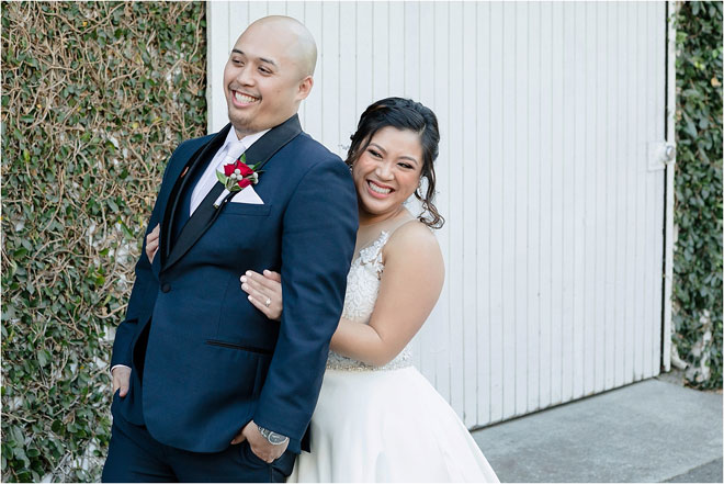 “Doing the first look beforehand was great because we got to really enjoy the last few hours before our wedding together,” says Edward, who liked having the entire bridal party lined up before the ceremony. “The anticipation and excitement of knowing all our friends and family were waiting just around the corner, the music setting the mood, it was great build up to a memorable night.”