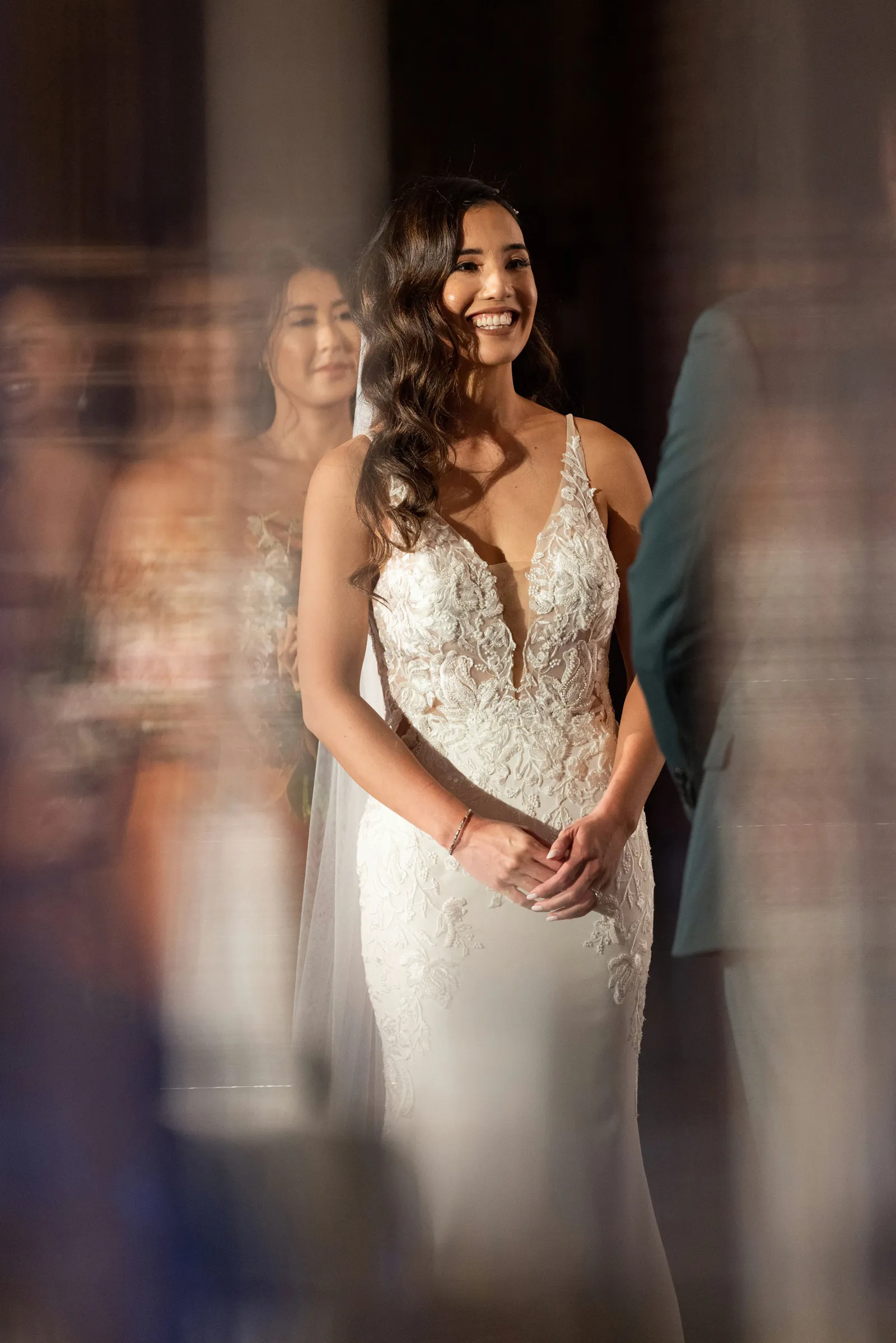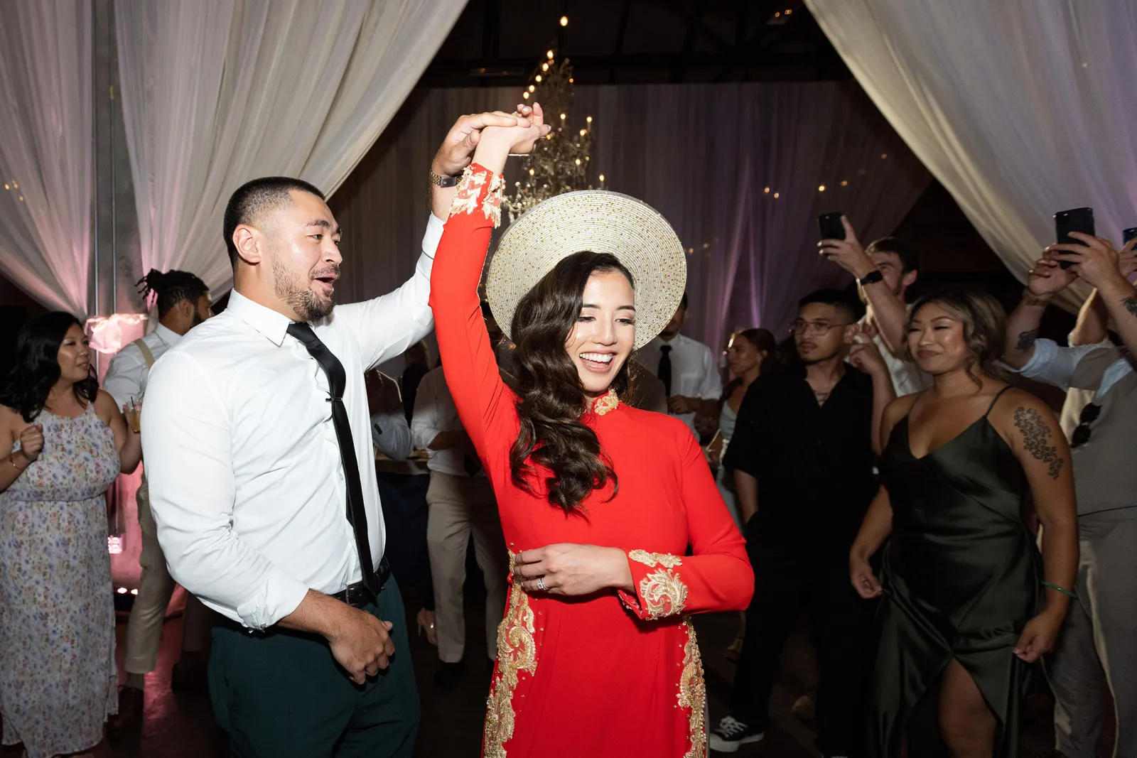 During part of the reception, I wore a red lace Vietnamese dress called ao dai, which is a tight-fitting long silk dress with long sleeves that is worn over long pants—I’m half Vietnamese and half Chinese and wanted to celebrate my heritage.