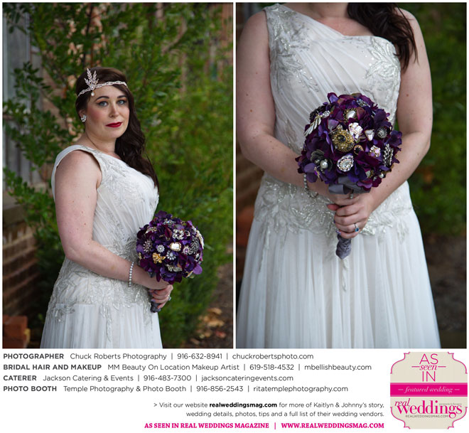 As a unique touch, Kaitlyn’s friend, Victoria Mak, made a brooch bouquet for her―she started with family brooches and augmented with inexpensive glittery jewelry from a flea market.