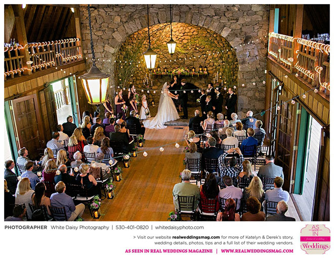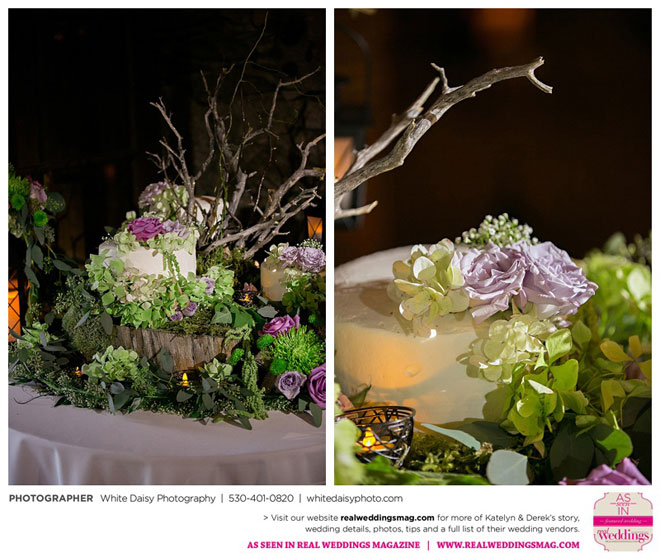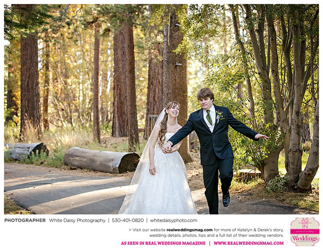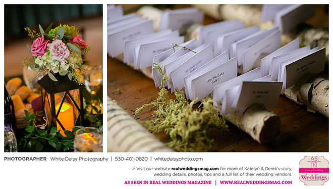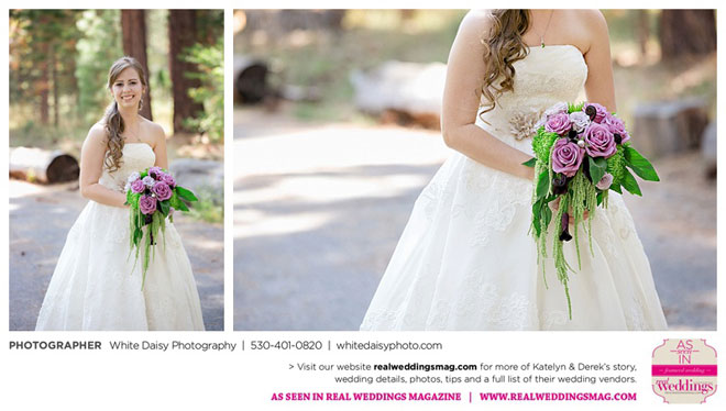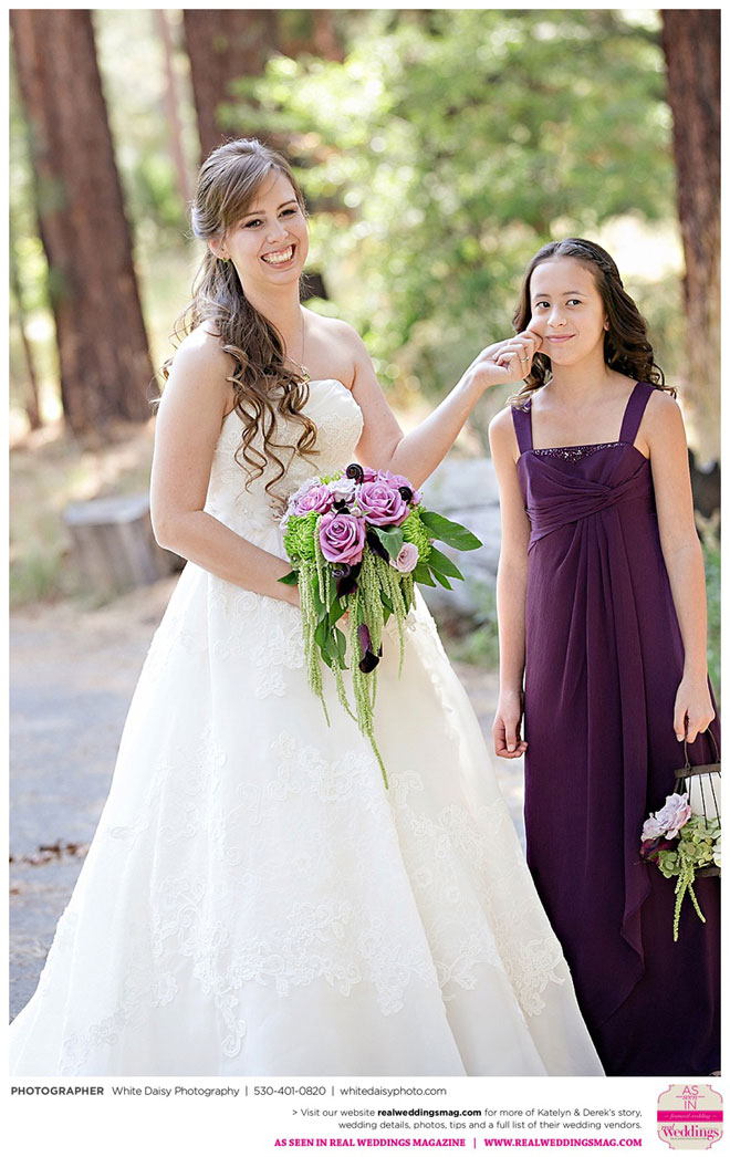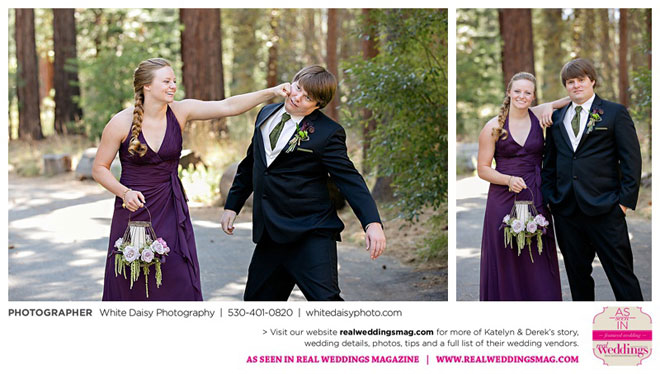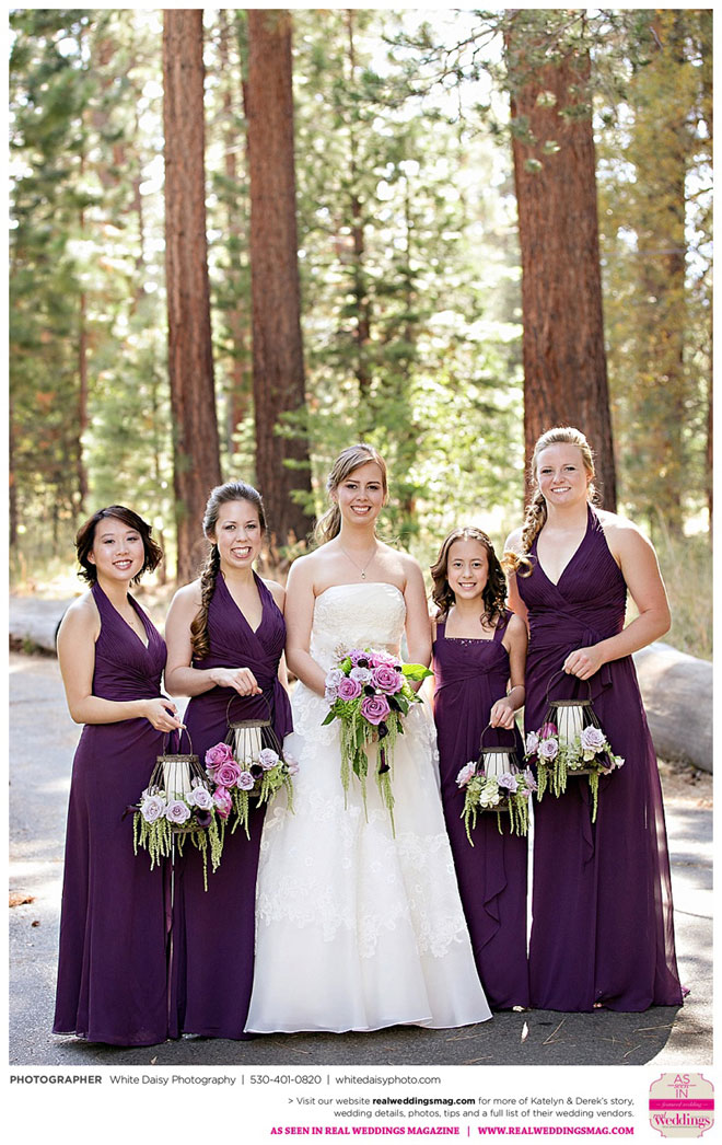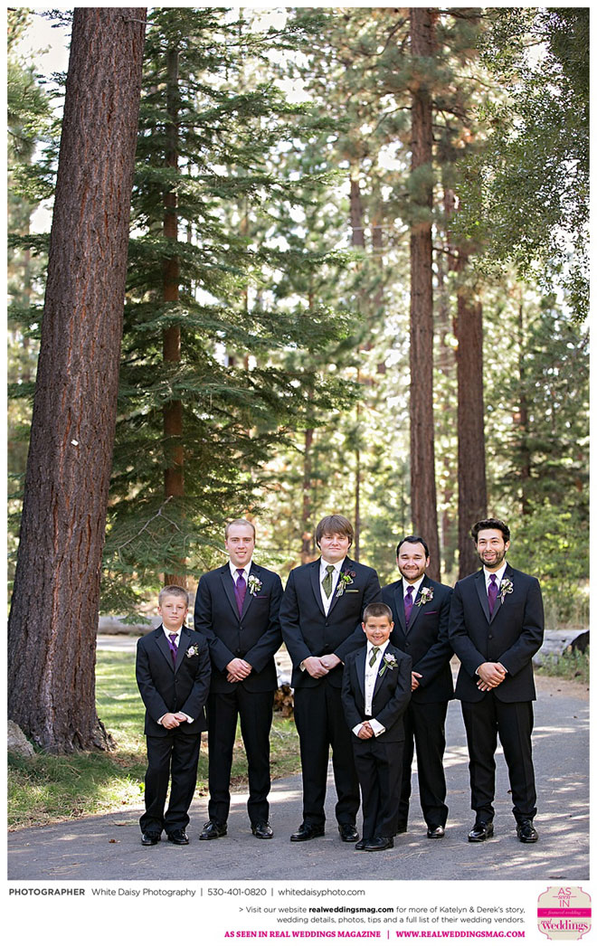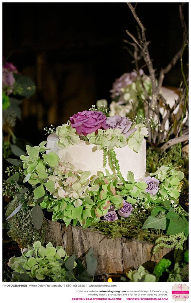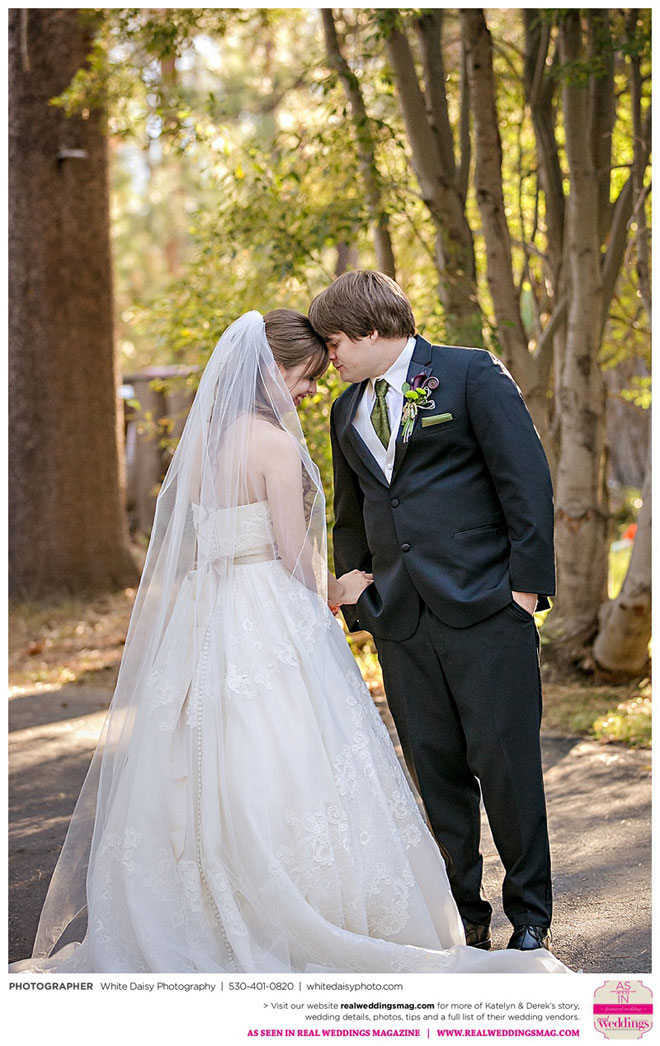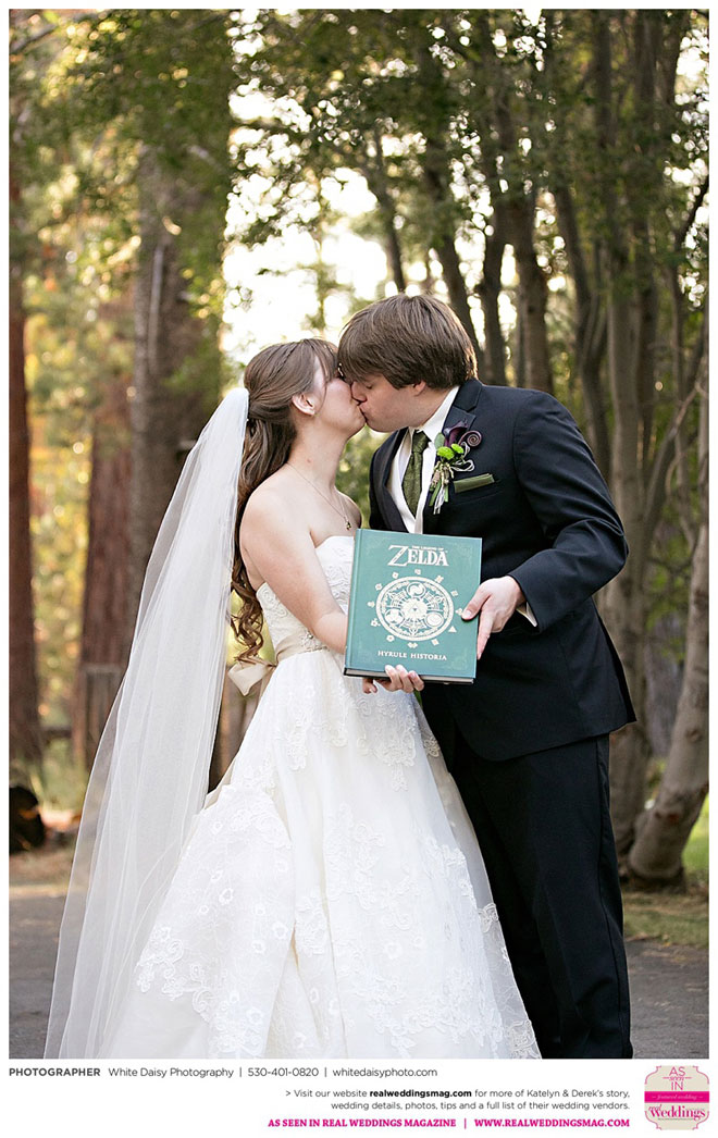 Surprisingly, Katelyn was “hands off” during the planning process, as she was either working or going to school full-time. With help from various family members, especially Katelyn’s mother, the couple chose to incorporate the feel of the video game they first played together into their wedding, along with their interest in Norse mythology, hence the Valhalla Grand Hall in Camp Richardson, South Lake Tahoe as the wedding venue. “We wanted something that felt whimsical and woodsy,” describes Katelyn. Their colors were purple, dark olive green (the duo’s favorite colors, respectively) and ivory. The wood in the surrounding area gave guests an enchanting feeling, which was just what the couple desired.