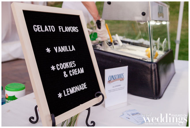 The reception tent was beautifully decorated with lush blooms and greenery, and romantic twinkling lights strung up overhead, while guests enjoyed a full bar, dinner, dancing and games like Jenga, cornhole, and a photo booth with fun props, along with an impressive dessert bar and gelato station.