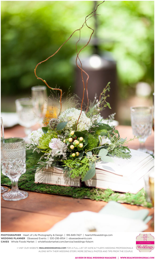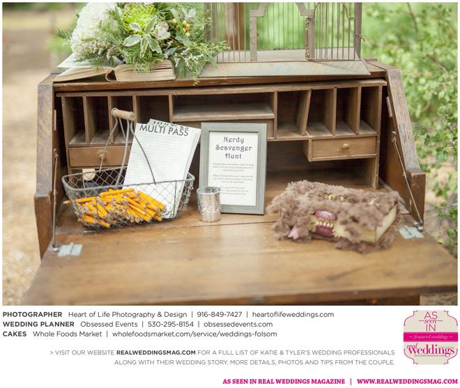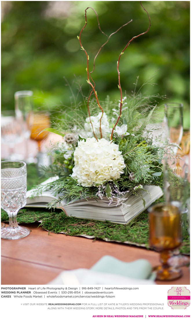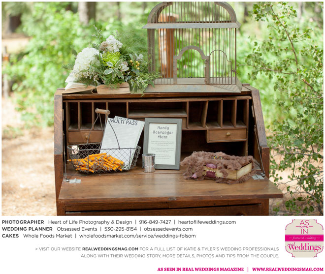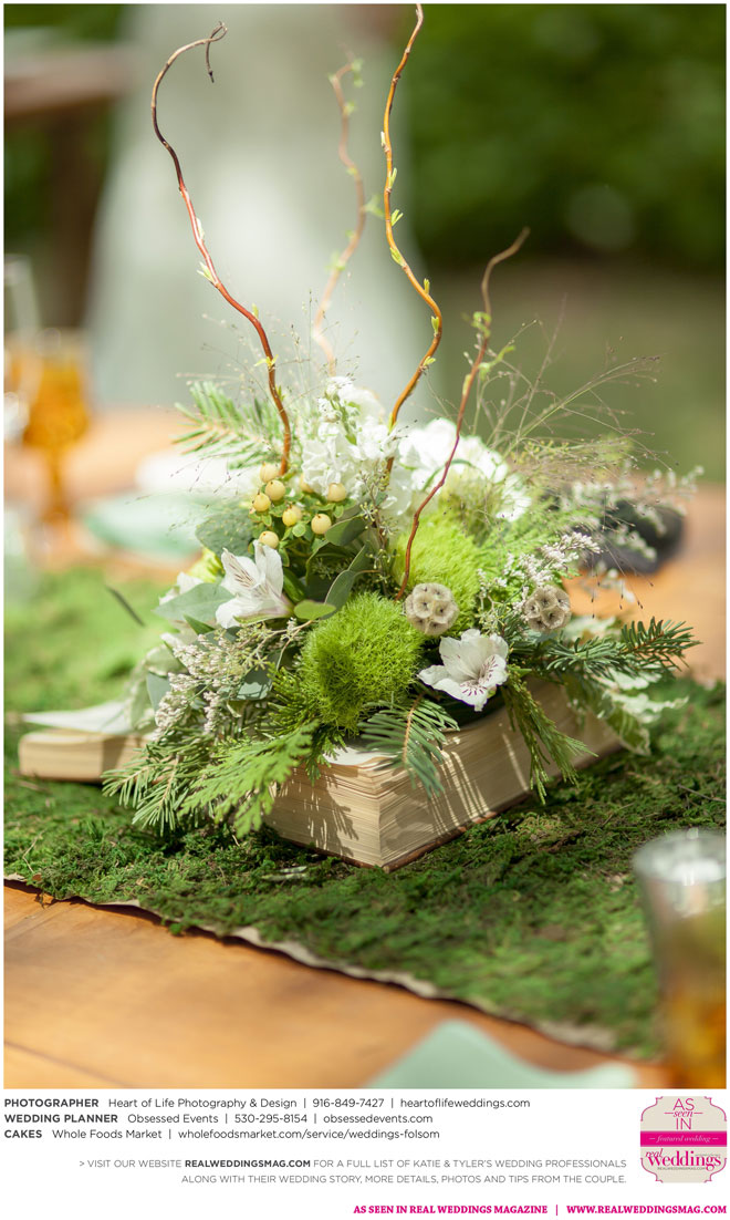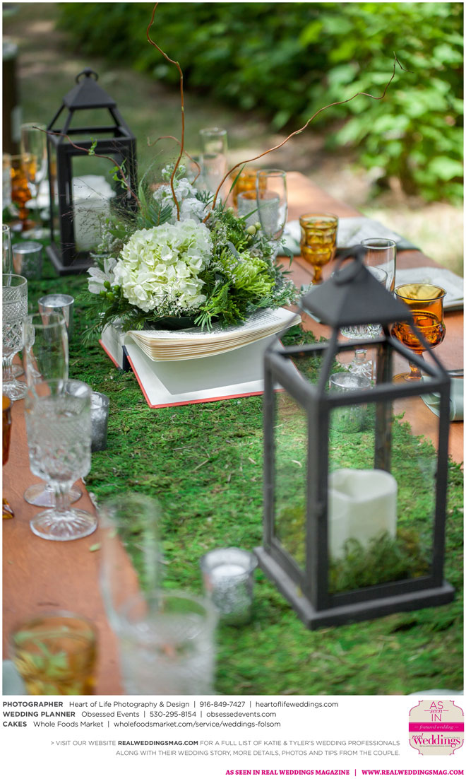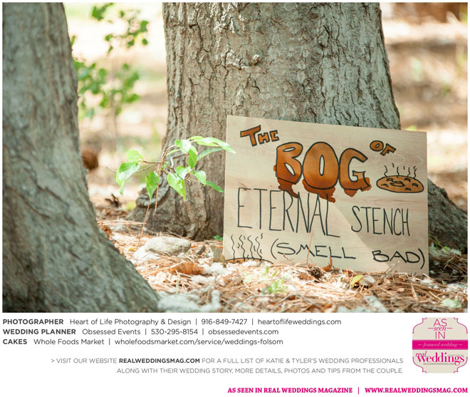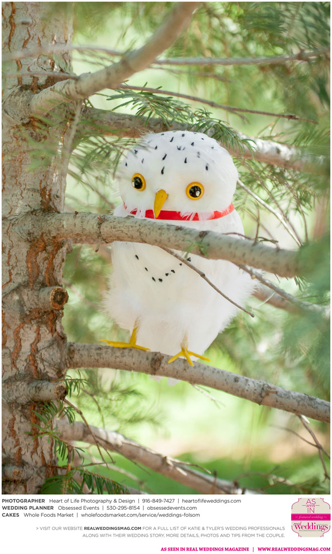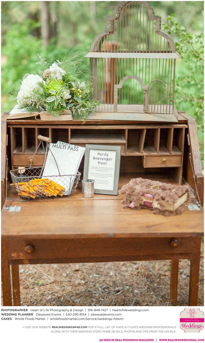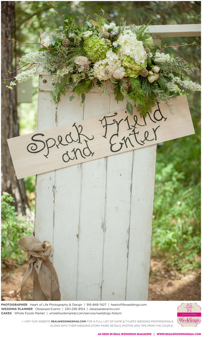 Sprinkled among the natural beauty of their ethereal and woodsy venue were little nods to the couple’s nerdy nuances—like Hedwig (Harry Potter’s owl) tucked away on a tree branch, the phrase “Speak Friend and Enter” on an archway (from The Lord of the Rings) and a mockingjay pin on one of the caterers (The Hunger Games)—that guests were encouraged to find in a scavenger hunt.