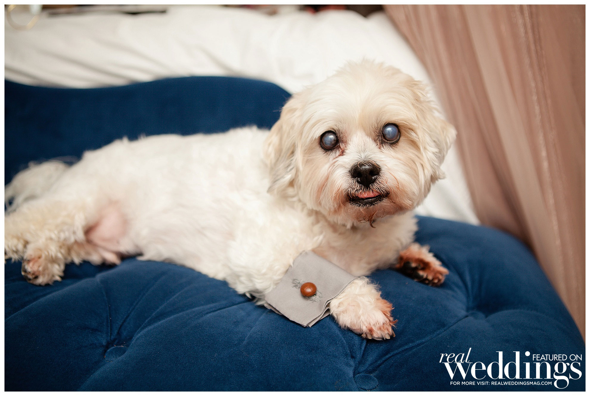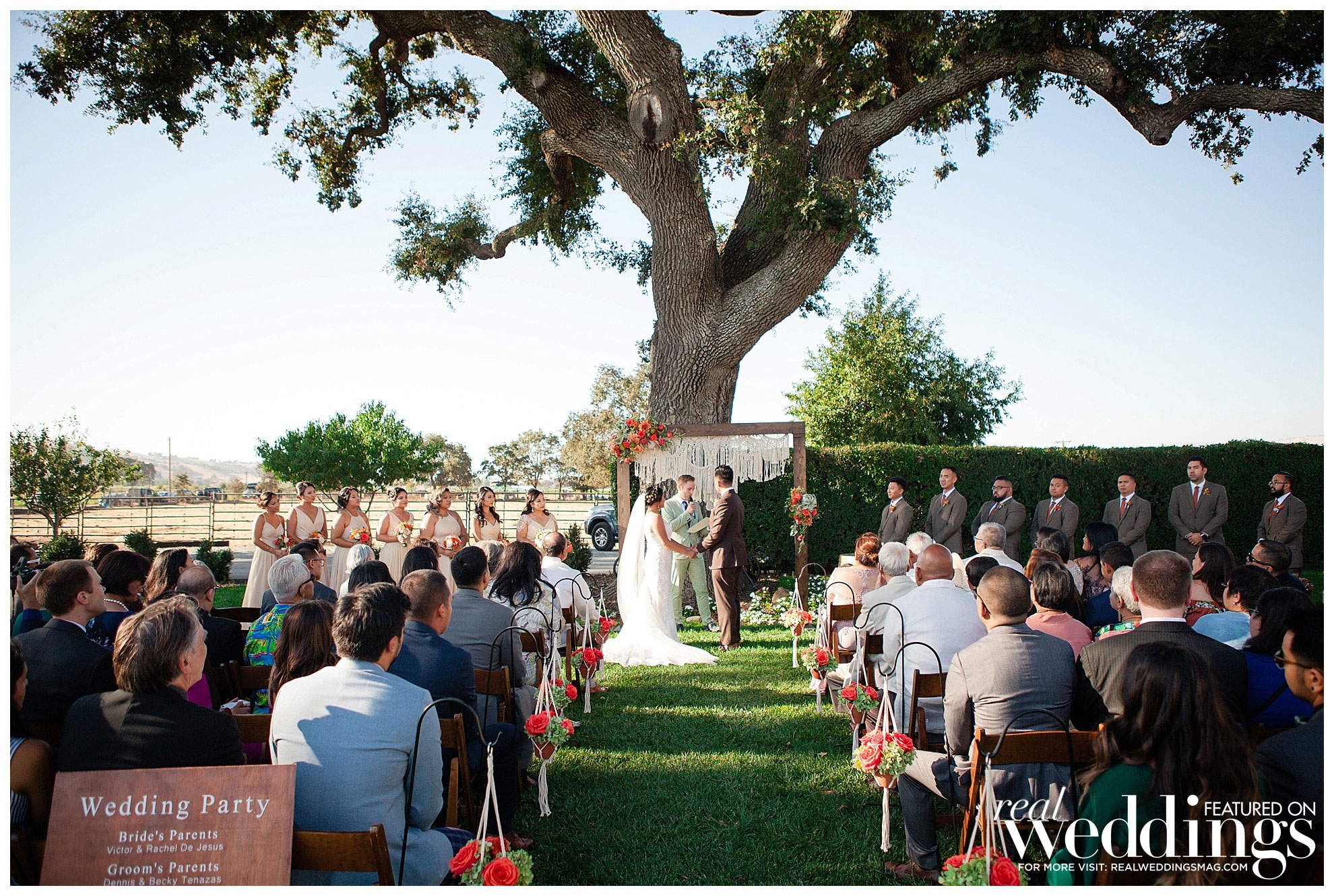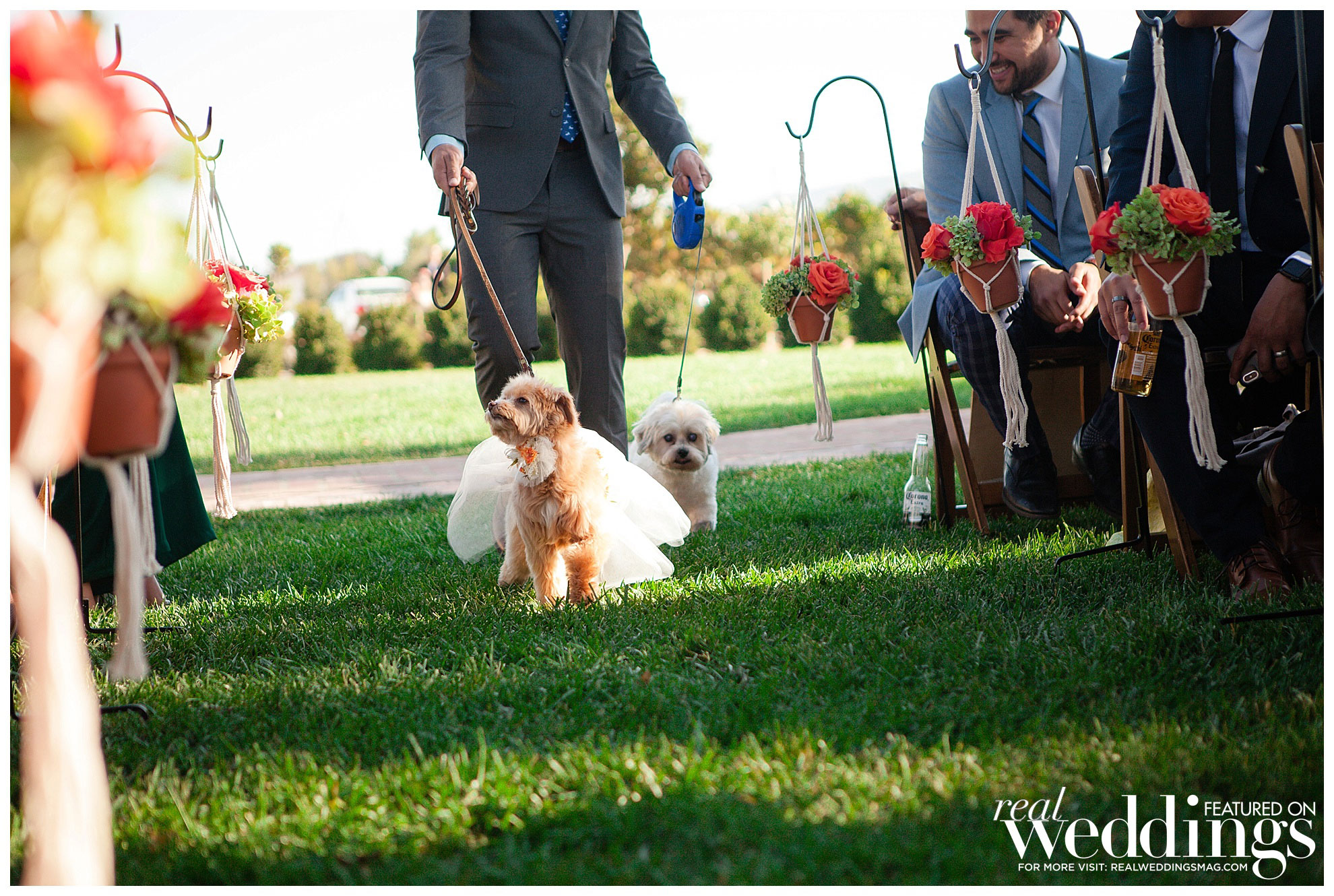 The laid back, Bohemian-themed ceremony was held under an old oak tree and included a guest appearance from Ellie, the couple’s maltipoo, and Brady, Katrina’s sister’s dog. They were both dressed to the nines in custom outfits handmade by Katrina’s mother.