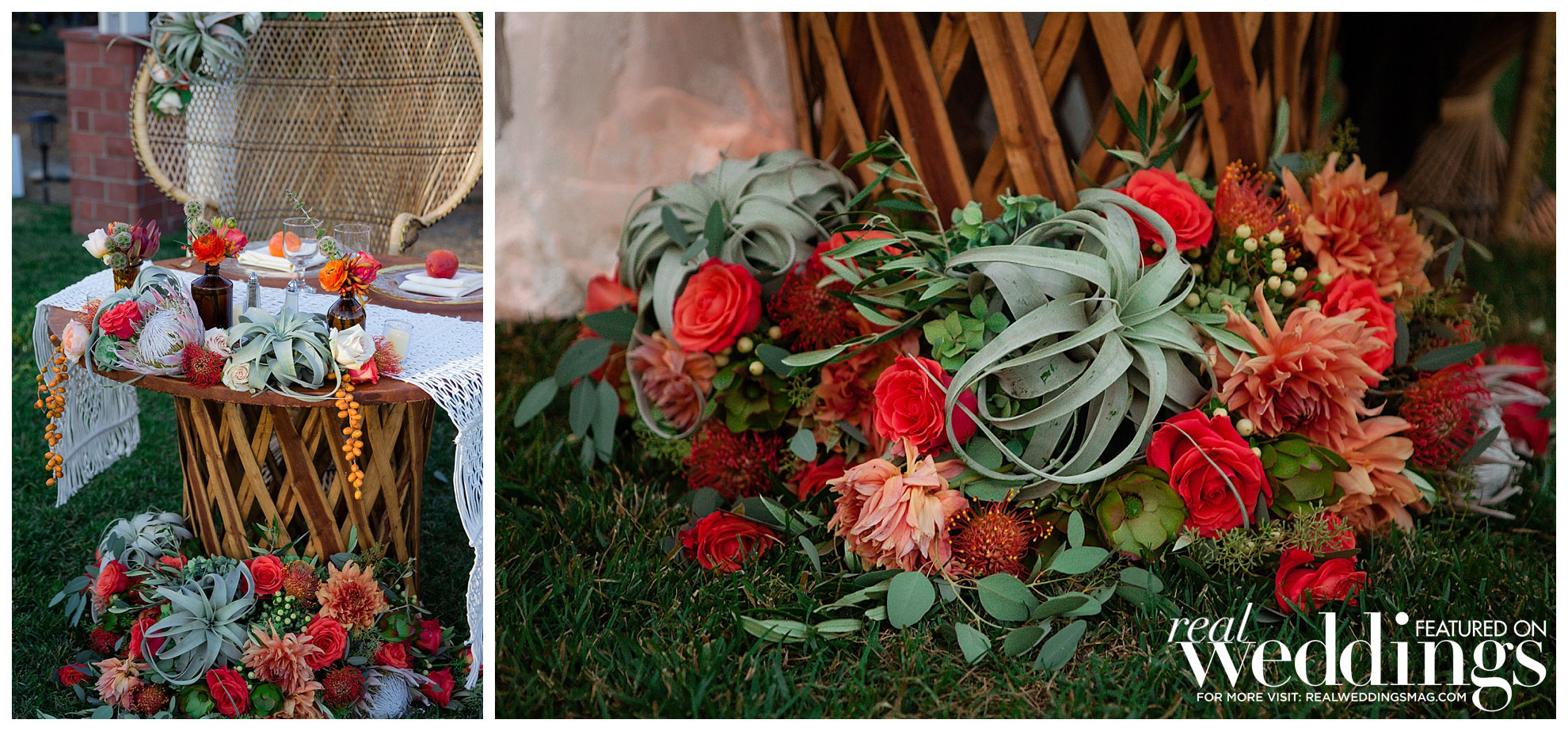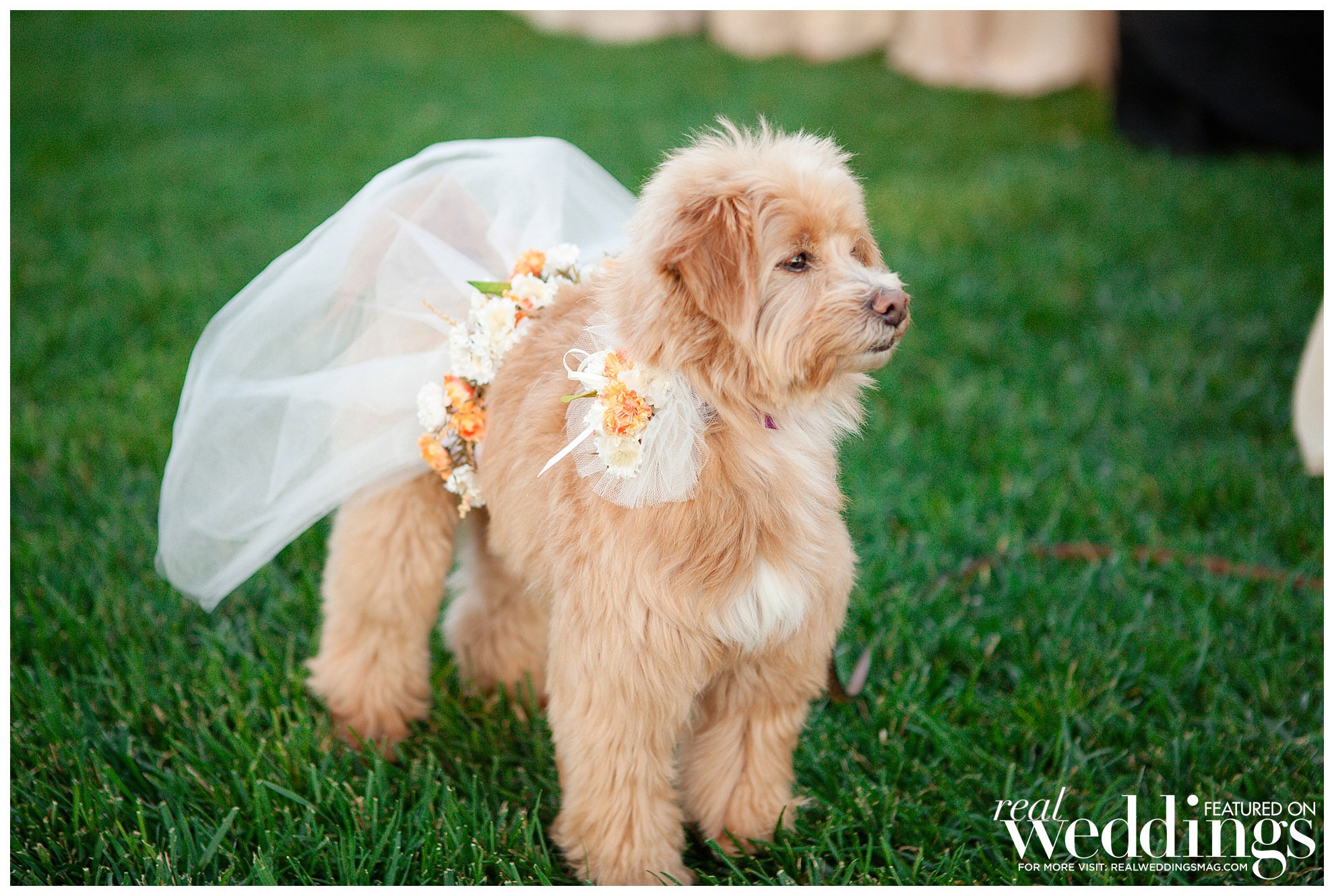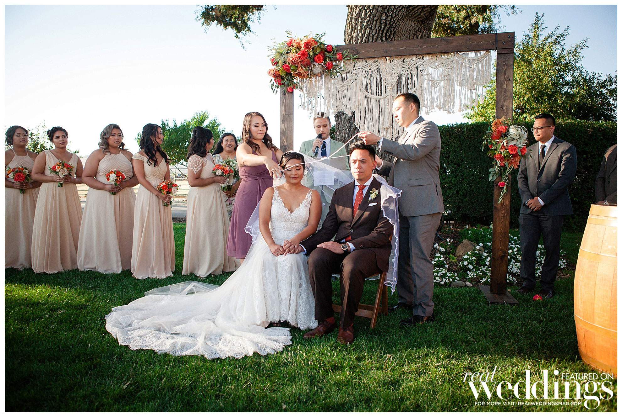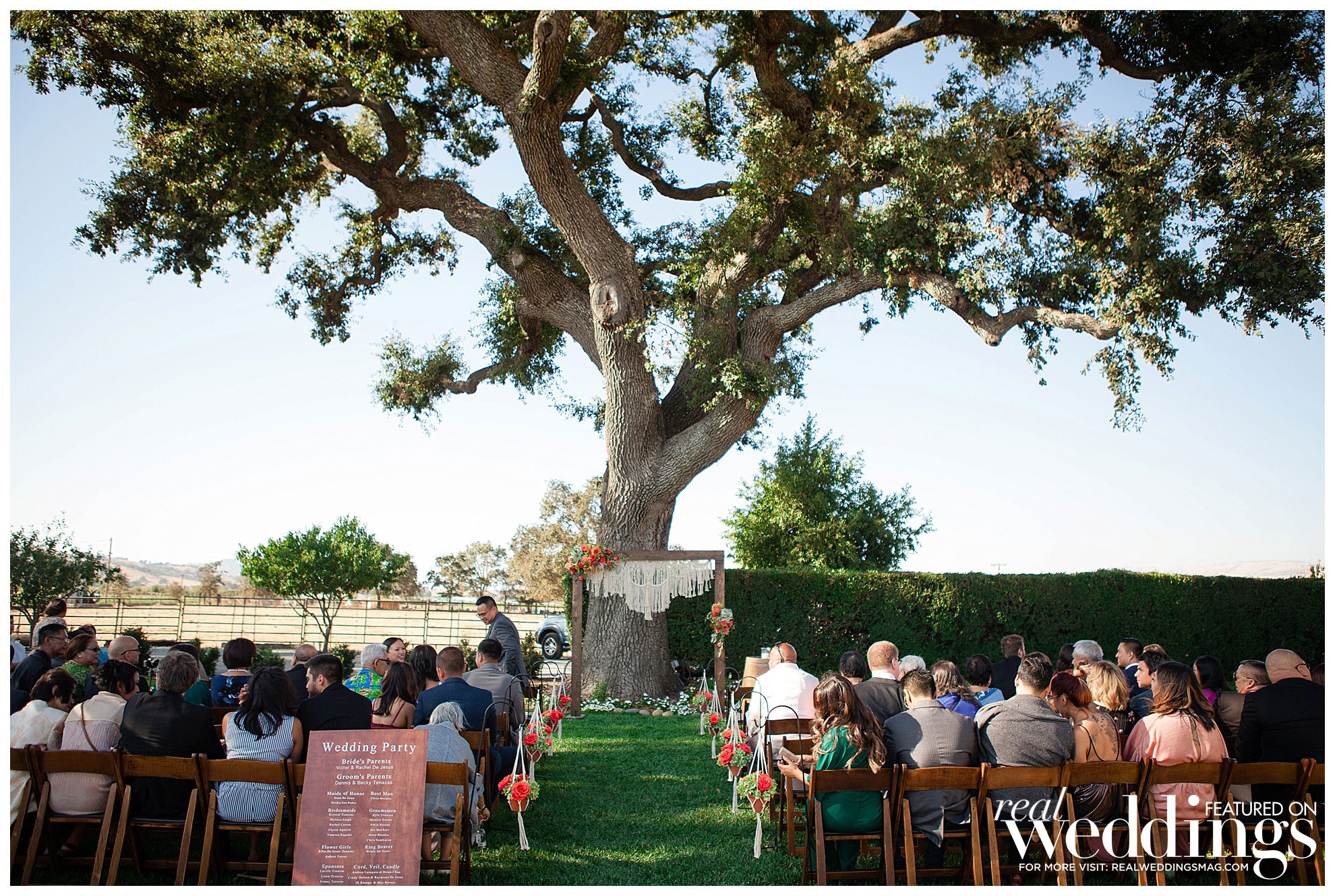 The laid back, Bohemian-themed ceremony was held under an old oak tree and included a guest appearance from Ellie, the couple’s maltipoo, and Brady, Katrina’s sister’s dog. They were both dressed to the nines in custom outfits handmade by Katrina’s mother.