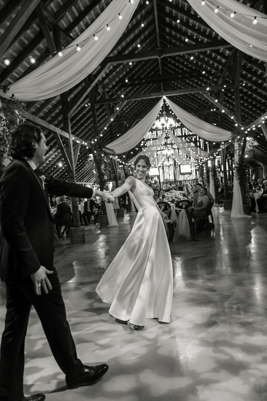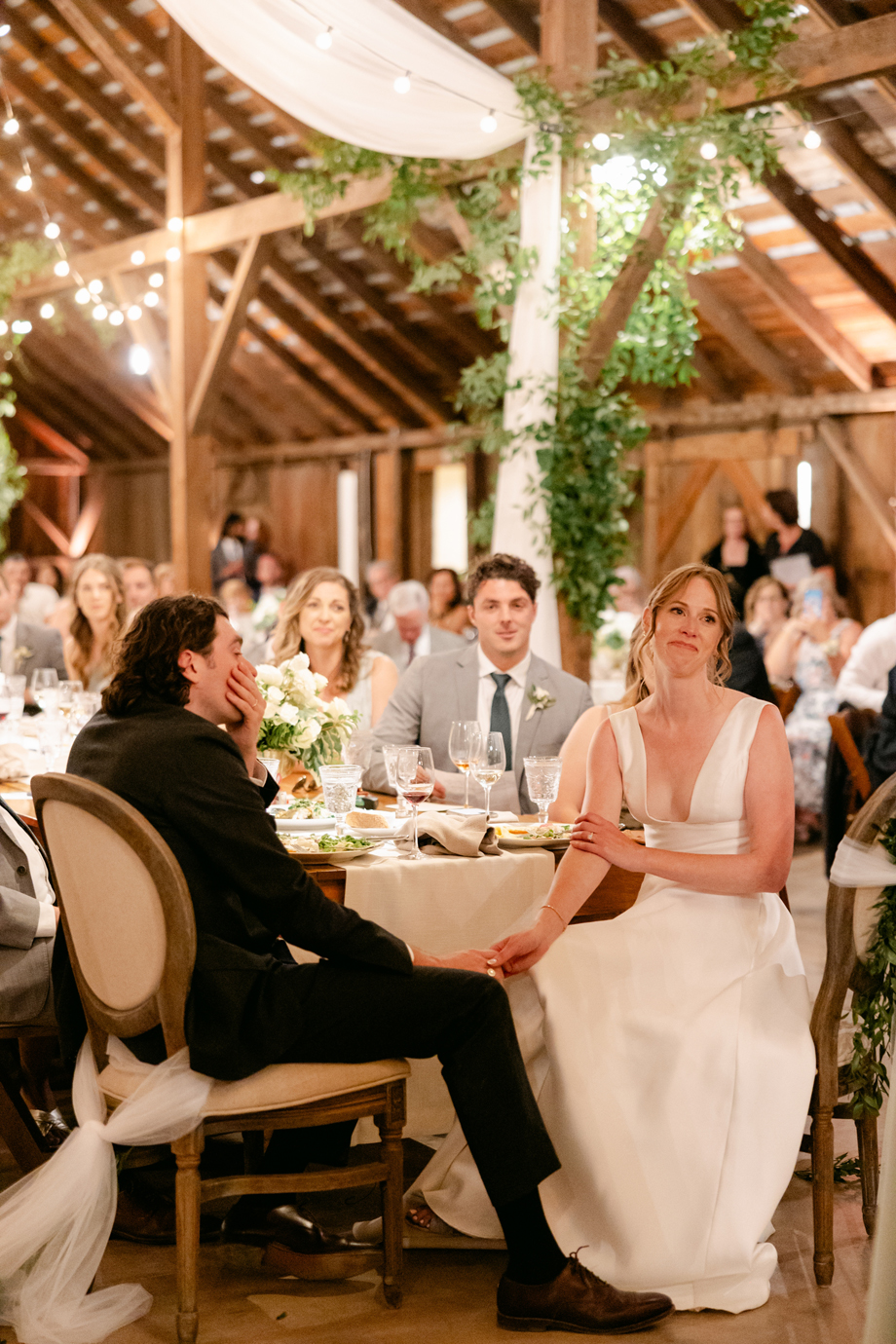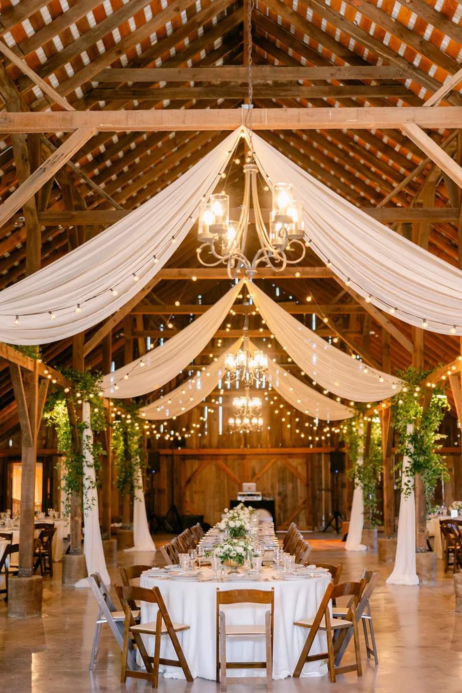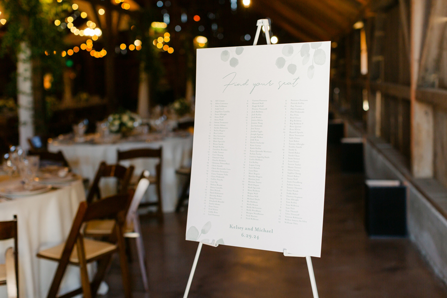 The barn just felt like a fairy tale. Our florist, Angella, did greenery on the posts to soften the barn and we just loved the way it looked with the market lights. Illuminate did an incredible job with the lighting as well, the entire evening.