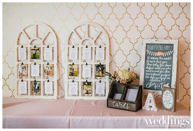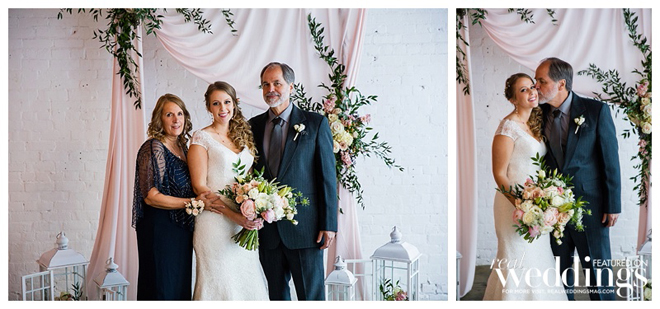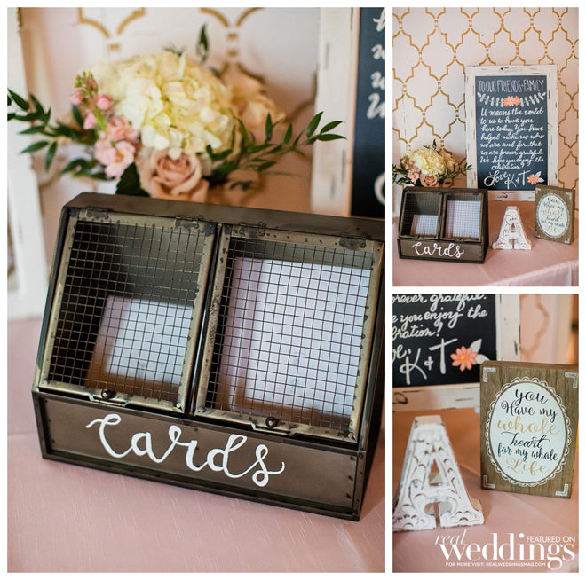 A year and a half later, they said their “I do’s” under a birch arch that was covered with flowers and draped with blush pink linen. Two large white lanterns filled with flowers were on each side of the arch. The décor also included chiavari chairs for the ceremony seating and welcome signs with wedding party information, including all of their grandparents’ names. The bride’s father made a wooden cake box, which matched the farmhouse dinner tables.