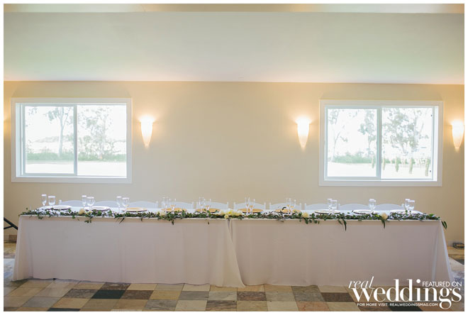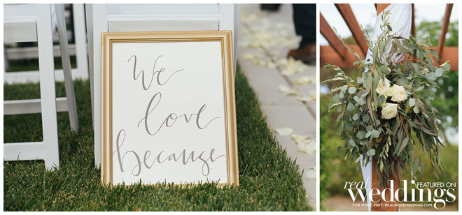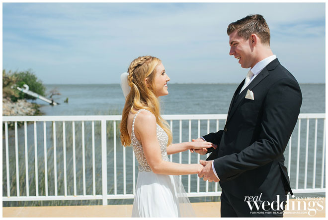 Kimberly laughs, recalling how troublesome her veil was on the windy day. During the first look, the veil flew out of her hair and into the air. “Thankfully our photographer snatched it before it was lost in the river,” she says, noting her sister had to hold onto the veil during the ceremony so it wouldn’t blow away.