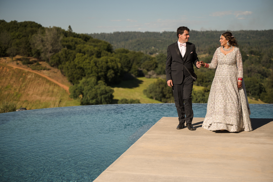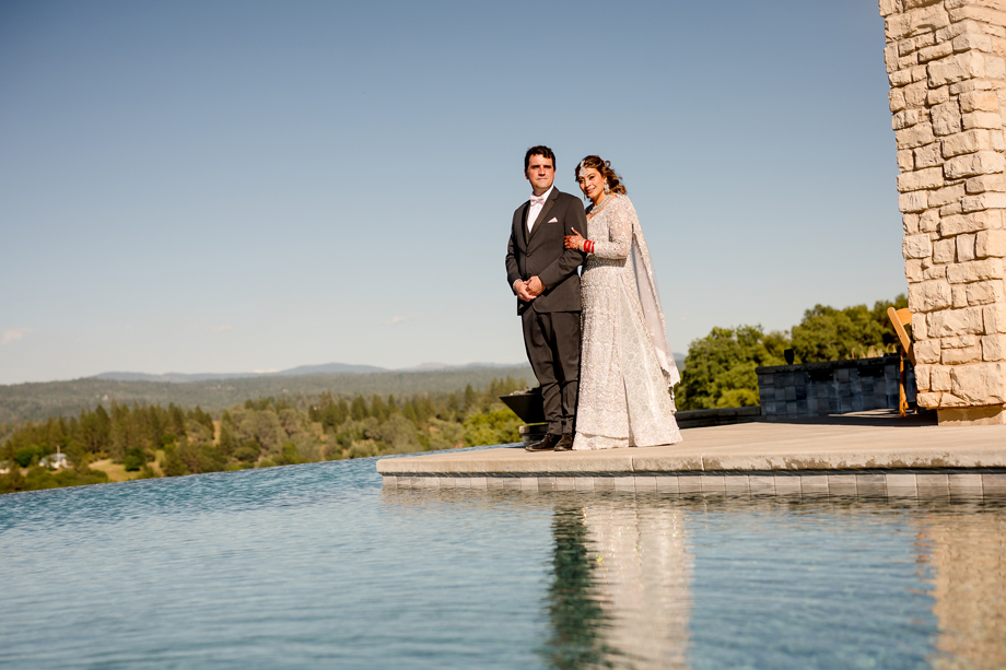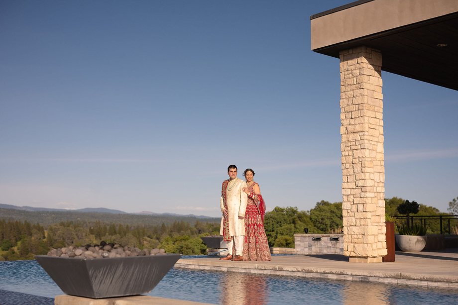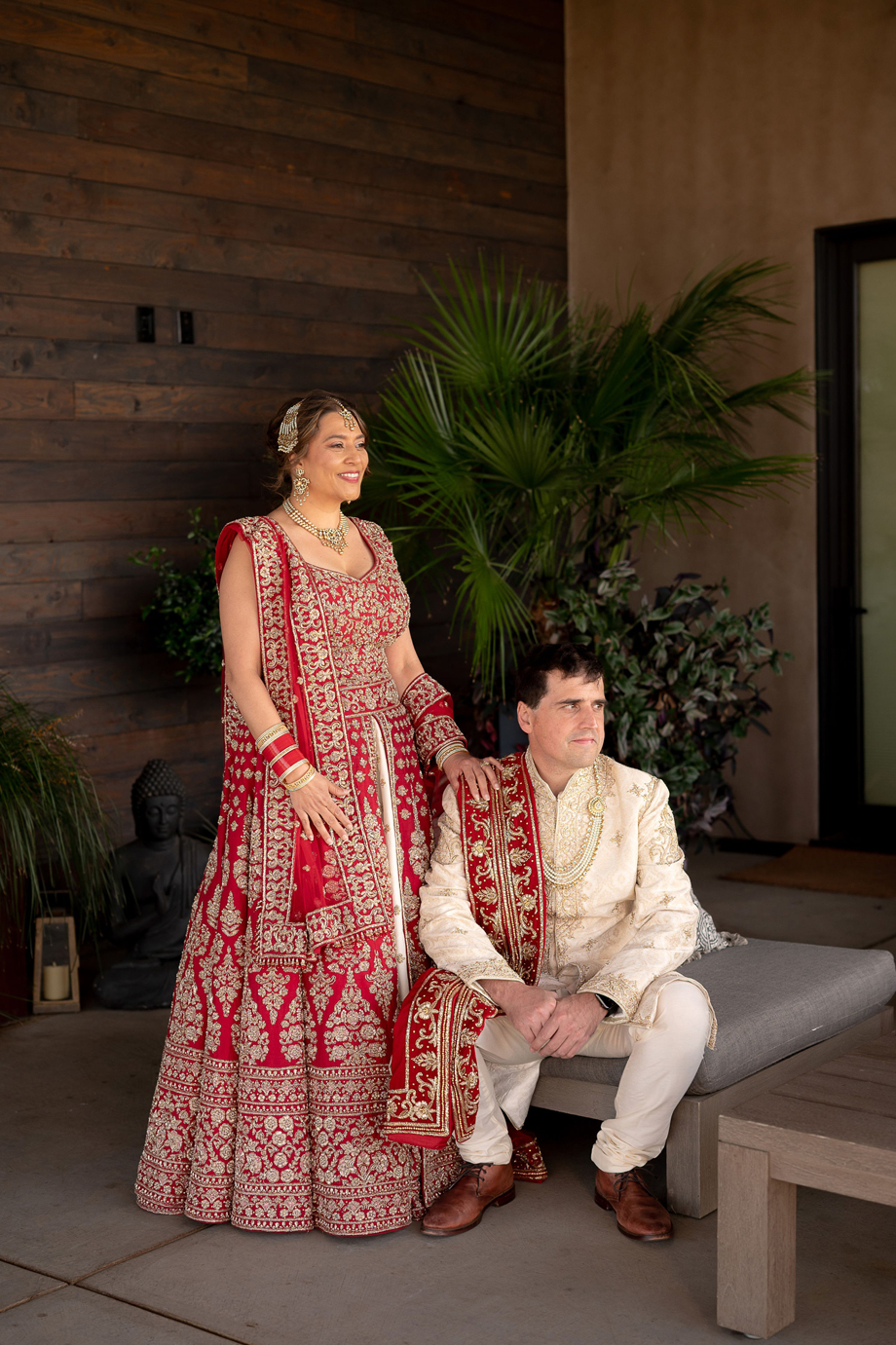 For the morning (Sikh) ceremony, Kiran wore a traditional red lehenga over a beautifully contrasted ivory underskirt that perfectly matched Tim’s ivory-colored kurta and rich red palla. During our photo shoot, the outfits popped so breathtakingly against the sparkling blue infinity pool that it looked positively regal.