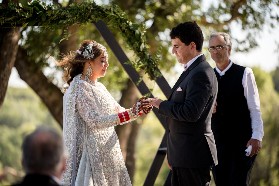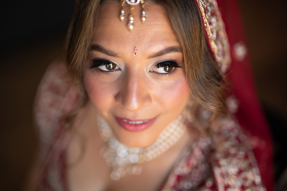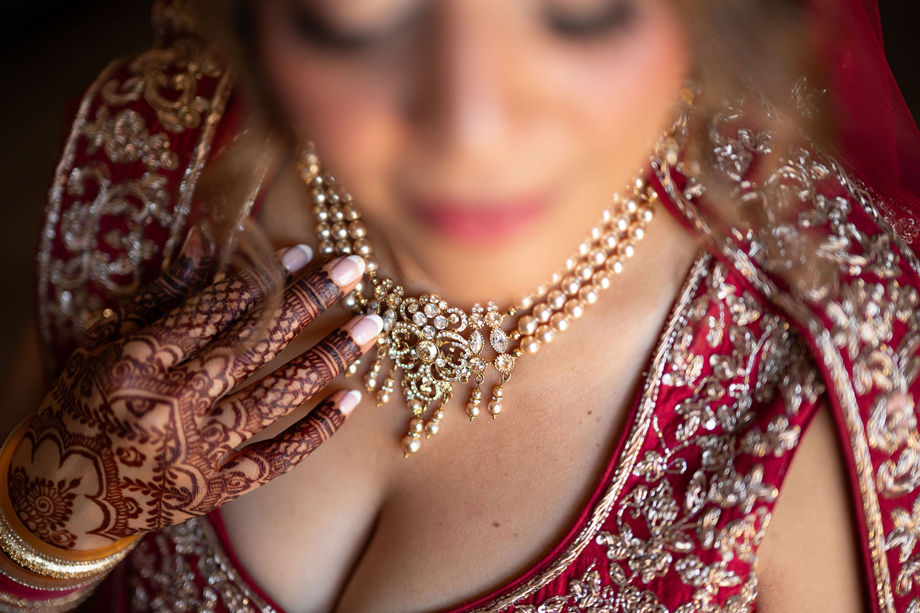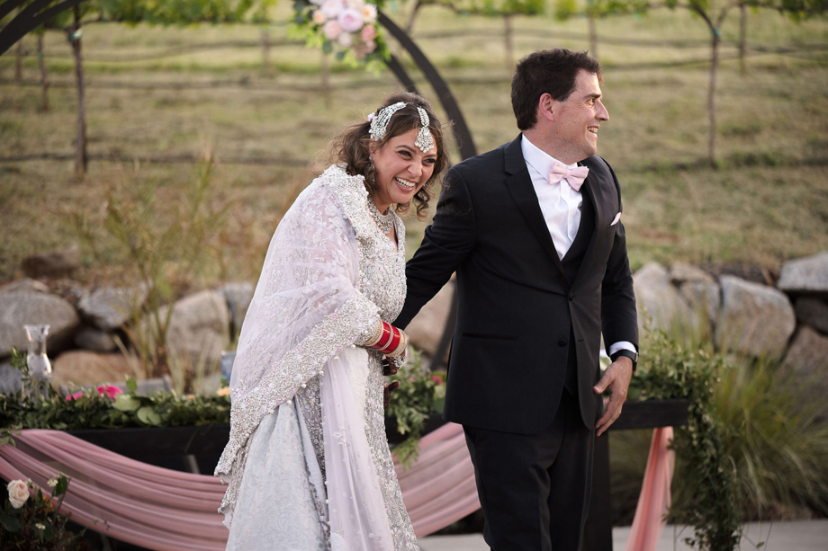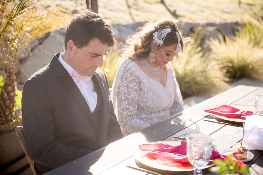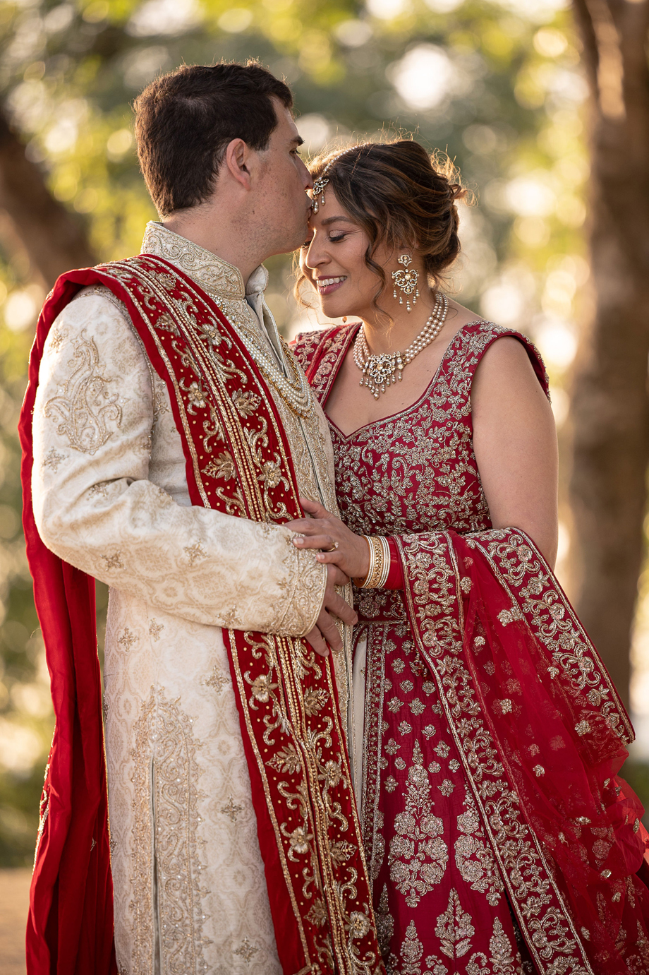 For the morning (Sikh) ceremony, Kiran wore a traditional red lehenga over a beautifully contrasted ivory underskirt that perfectly matched Tim’s ivory-colored kurta and rich red palla. During our photo shoot, the outfits popped so breathtakingly against the sparkling blue infinity pool that it looked positively regal.