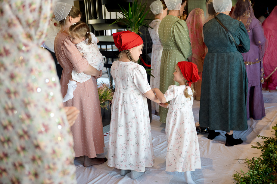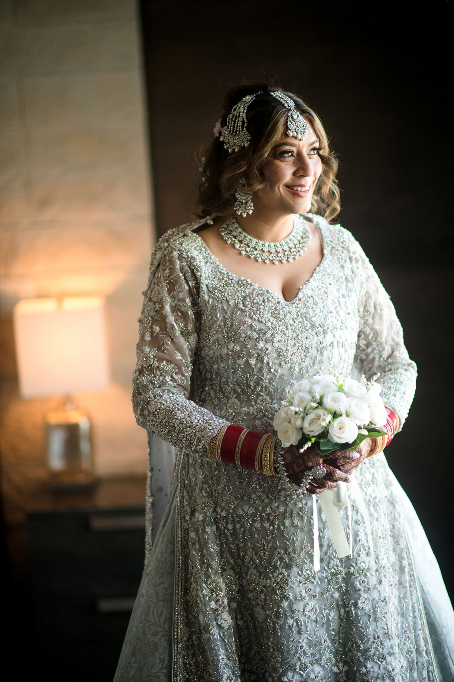 When Kiran learned that Amish brides traditionally wear plain gray dresses, she couldn’t help but think it was a little sad that, to an outsider, the bride looked just like everyone else, except in gray. So when we found Kiran’s dress in London, we knew we’d found the perfect blend—technically the right gray for an Amish wedding, but covered in 20 lbs of silver pearls and faux diamonds, giving it all the shimmer and splendor that made it totally Kiran! It was love at first sparkle.