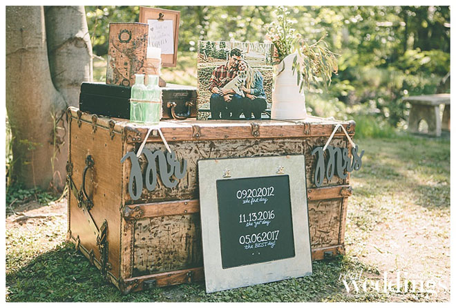 The couple symbolized their embarkation on this new adventure through their travel theme, which was reflected in décor details like maps, vintage suitcases and cameras, and a globe for guests to sign as a guestbook.