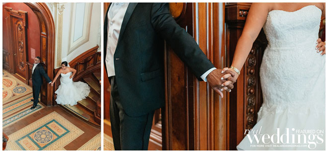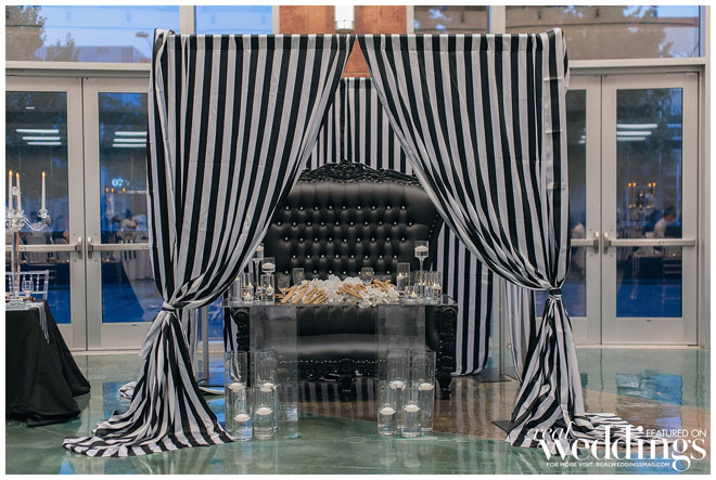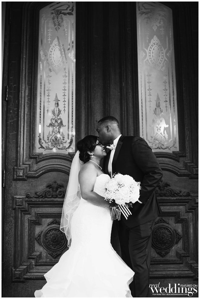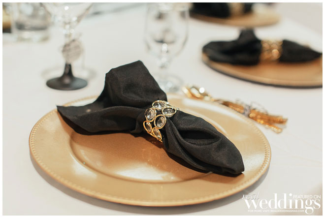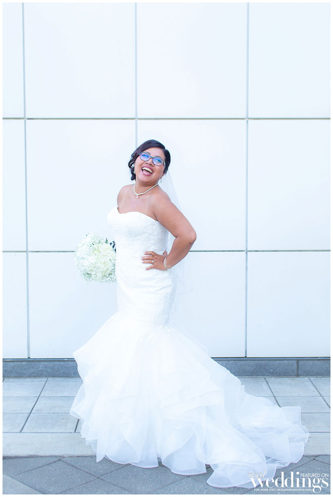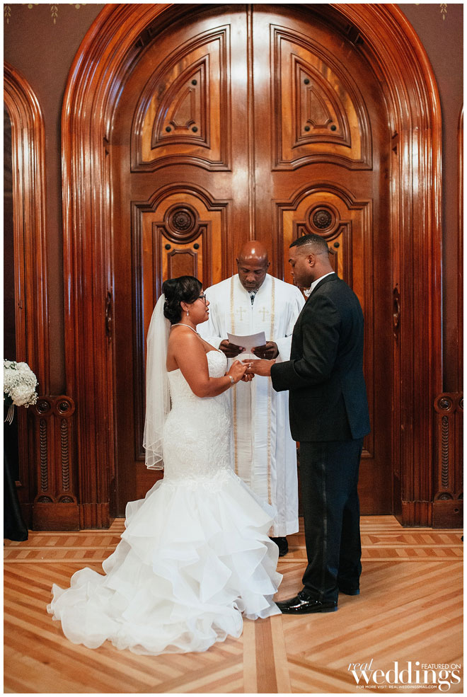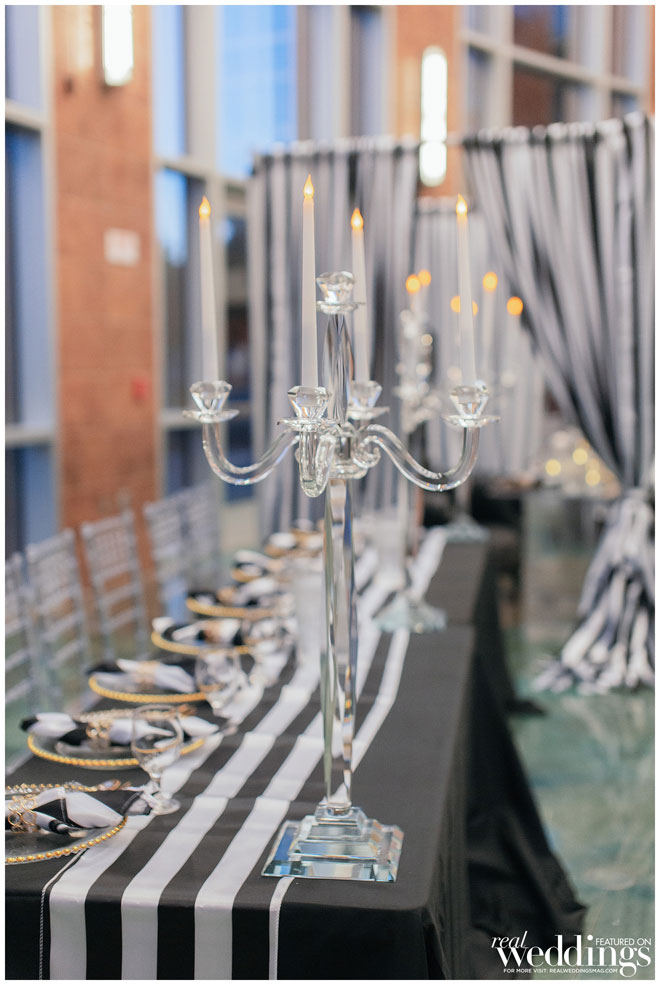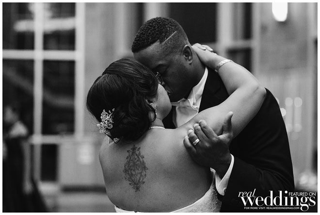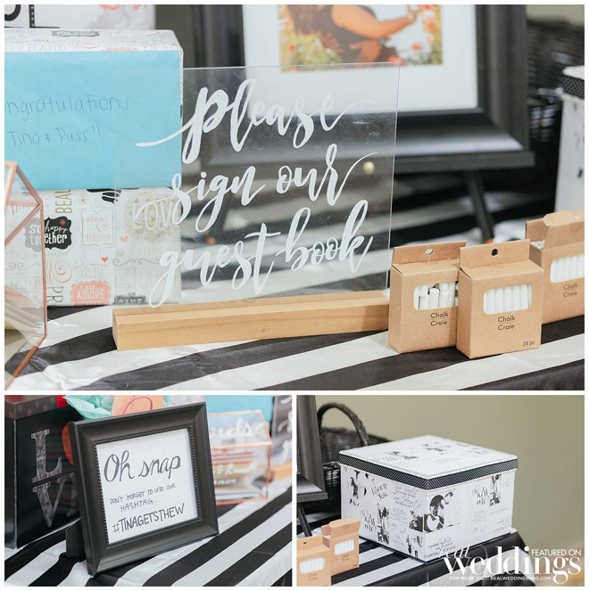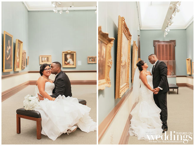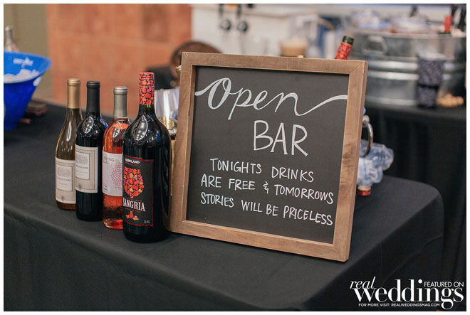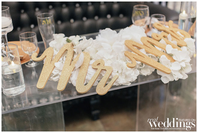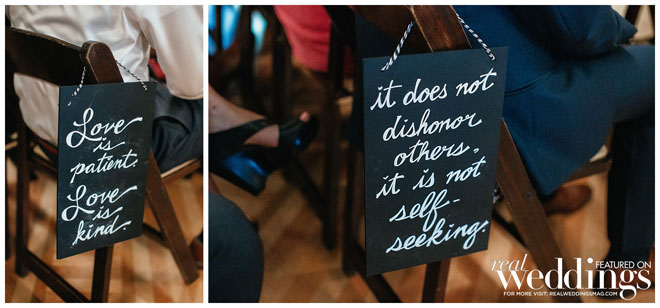 Though the gallery itself provided plenty of gorgeous décor for photos, Tina and her bridesmaids made a few DIY items to use during the ceremony and reception, including an unplugged ceremony sign, seating arrangement sign and hand-dipped wine glasses as favors.