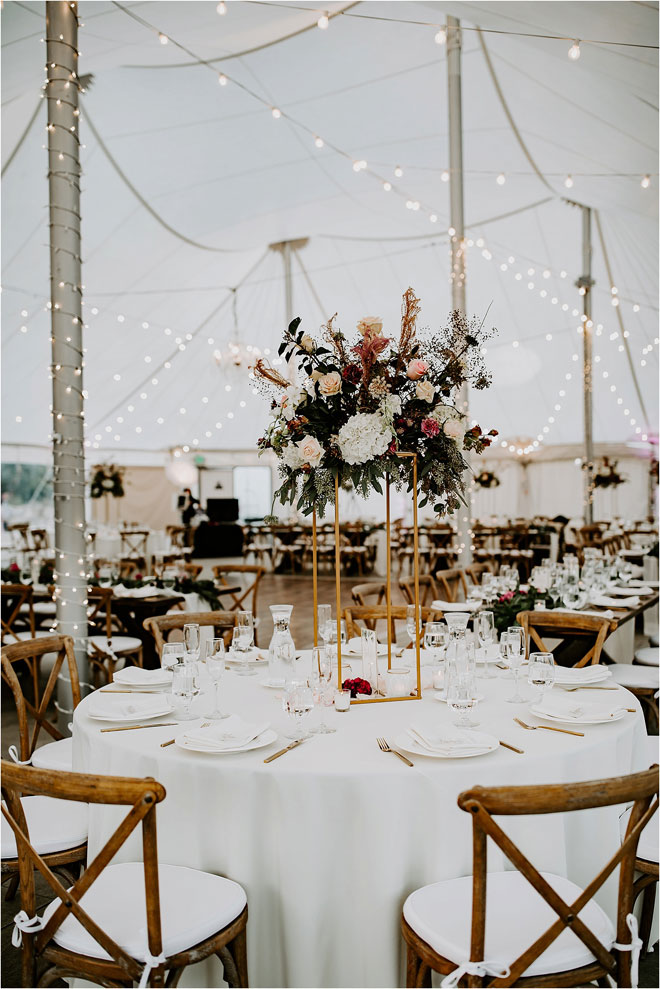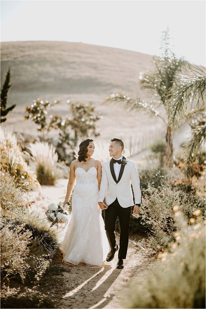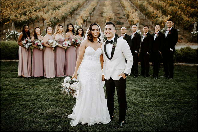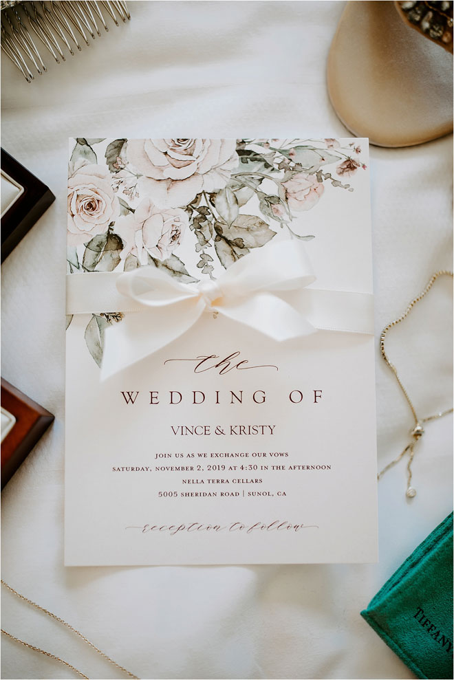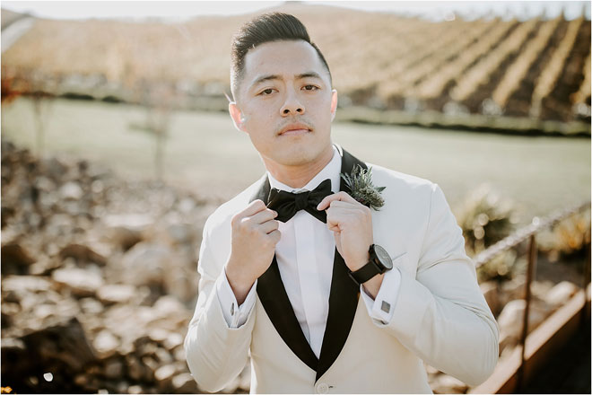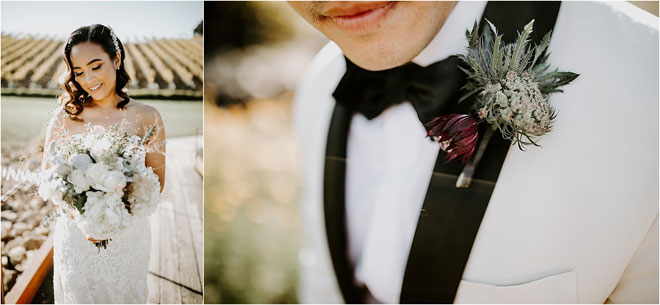 The two got married on a warm day in November, opting for an elegant winery celebration rather than a heavily decorated event hall. “I am such a minimalist. I wanted to go for a simple and romantic look with a touch of color,” says Kristy. “I feel that sometimes having less goes a long way.” The venue’s bocce ball courts, rows of vines and earthy shrubs and greenery provided the perfect backdrop for photos. “They were all so good,” says Kristy. “I cry looking back at all of them!”