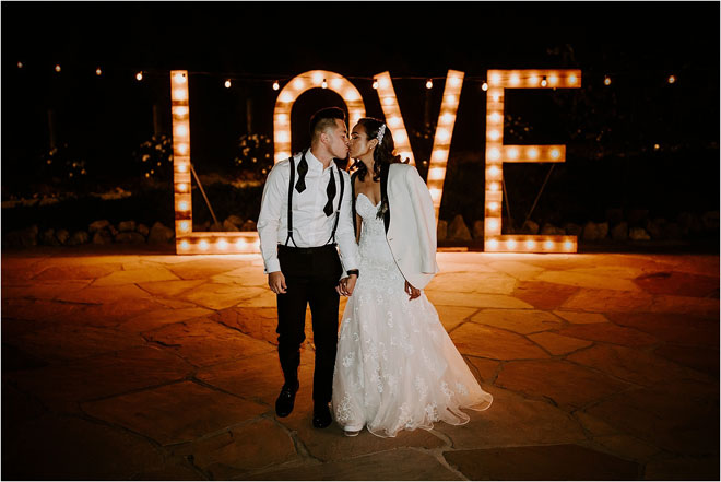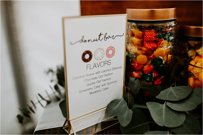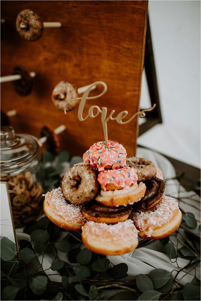 To keep the energy high, Kristy and Vince tempted their guests with a sprawling dessert bar. In addition to featuring a two-tiered cake (matcha raspberry and coffee cake with caramel buttercream!), they also offered a candy station and donut wall along with San Francisco-based It’s-It ice cream sandwiches, in homage to their hometown.