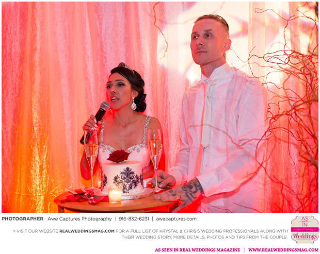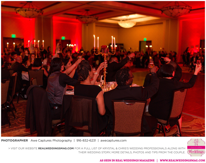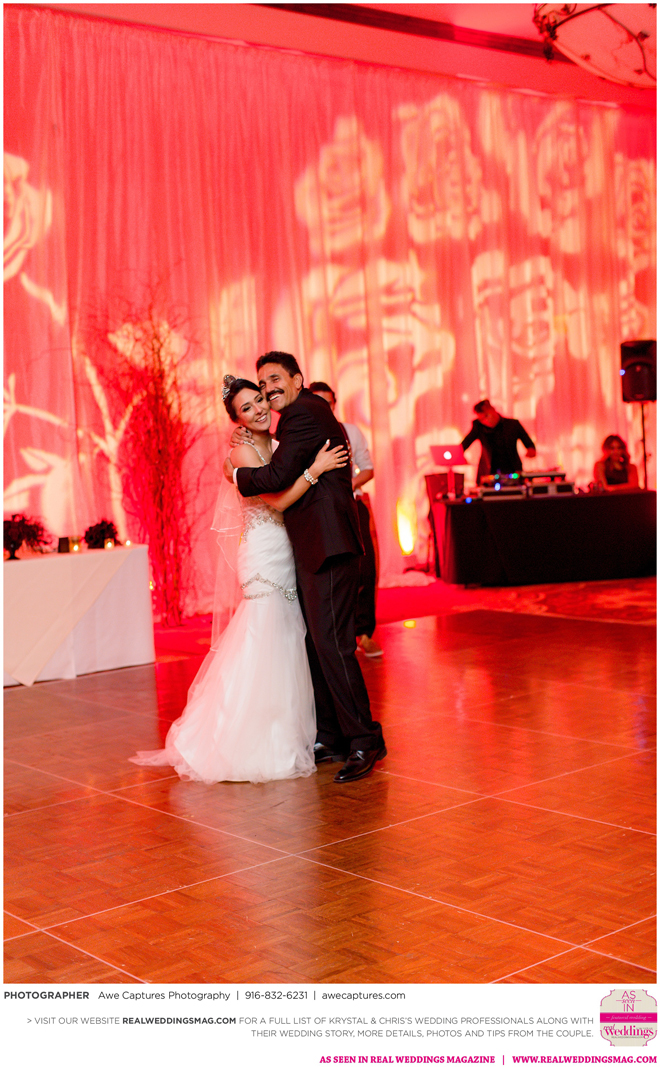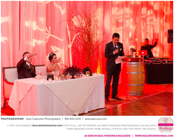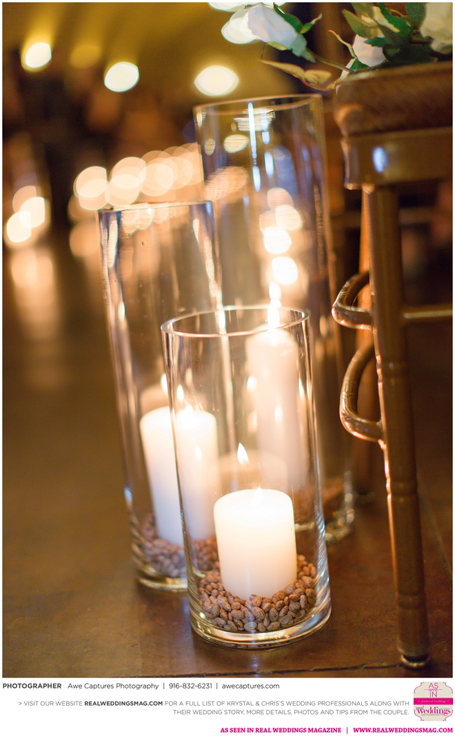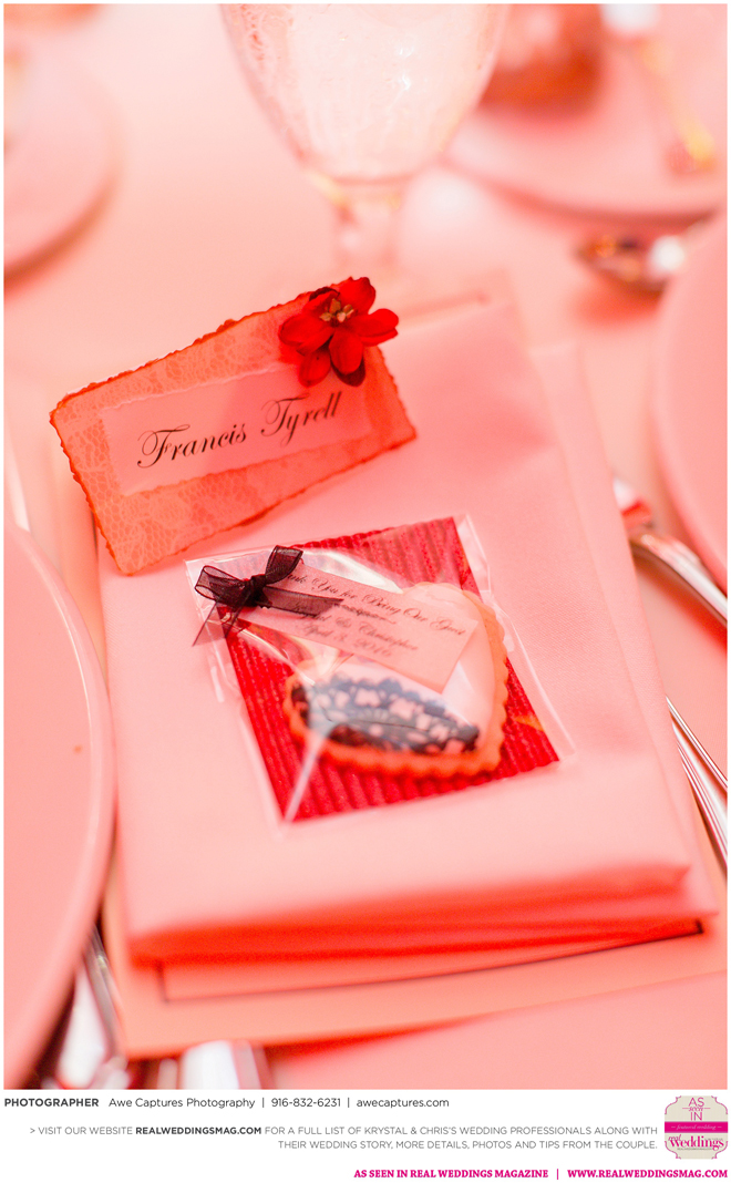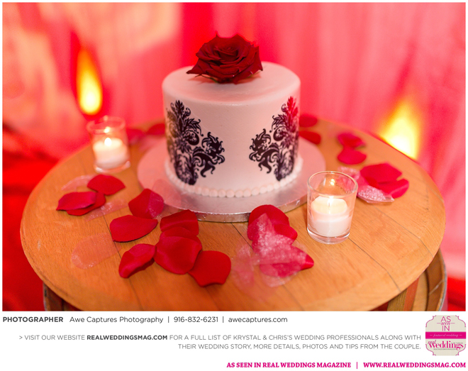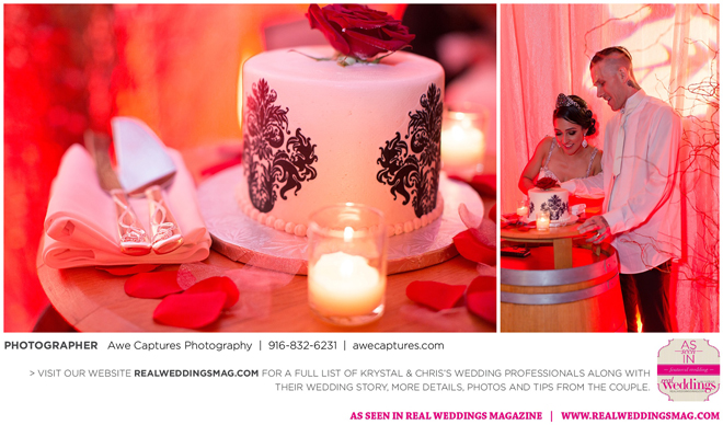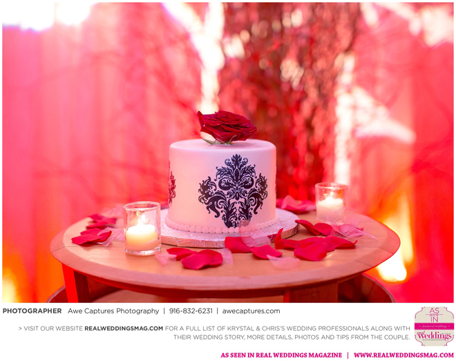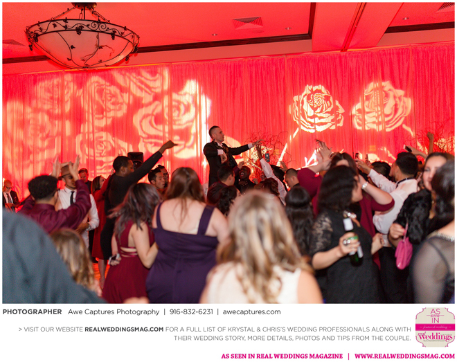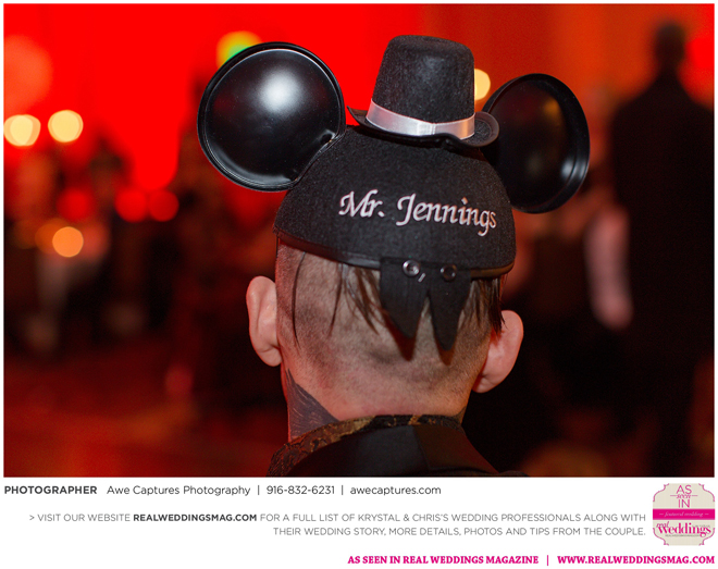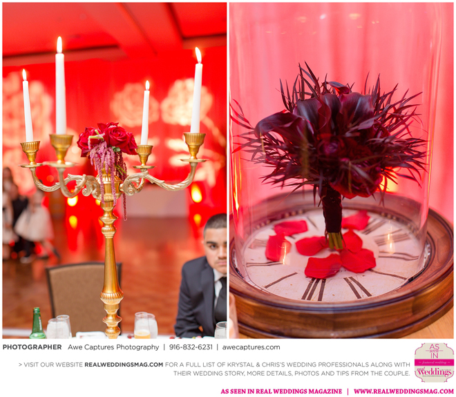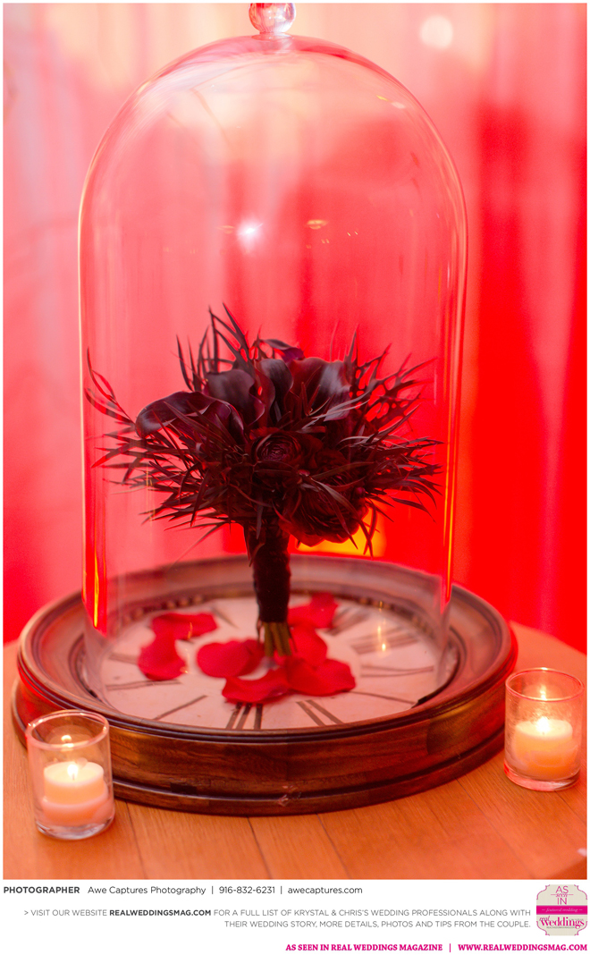 The reception followed in the resort’s Carneros Ballroom. The Beauty and the Beast theme was complete with candelabra centerpieces; yellow and red uplighting and a single rose in a bell jar. The DJ played “Be Our Guest” as guests entered the ballroom and “Beauty and the Beast” for the newlywed’s first dance.