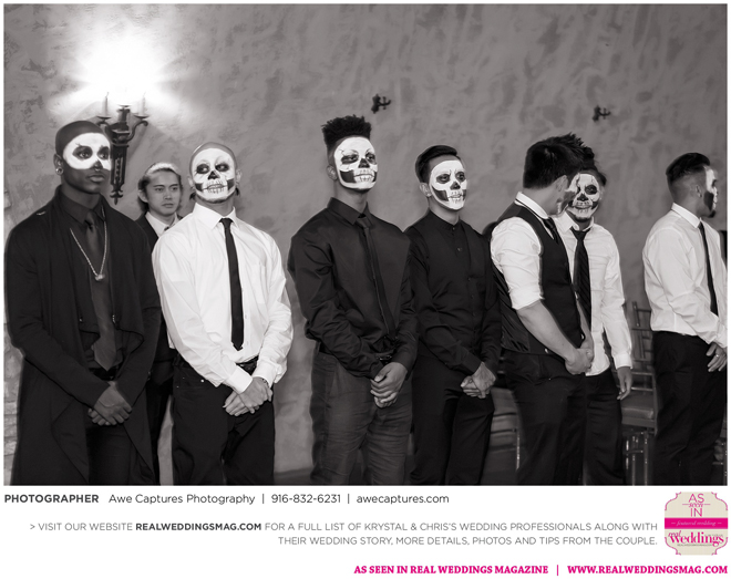 Guests entering the ceremony heard the Haunted Mansion theme song and some guests, who are members of the couple’s dance company, wore signature face paint. “Our company is known for theatrics so we thought it would be fun to go all out and have them usher our guests in,” says Krystal, noting the wedding’s black and champagne color scheme was “dark and classy.”