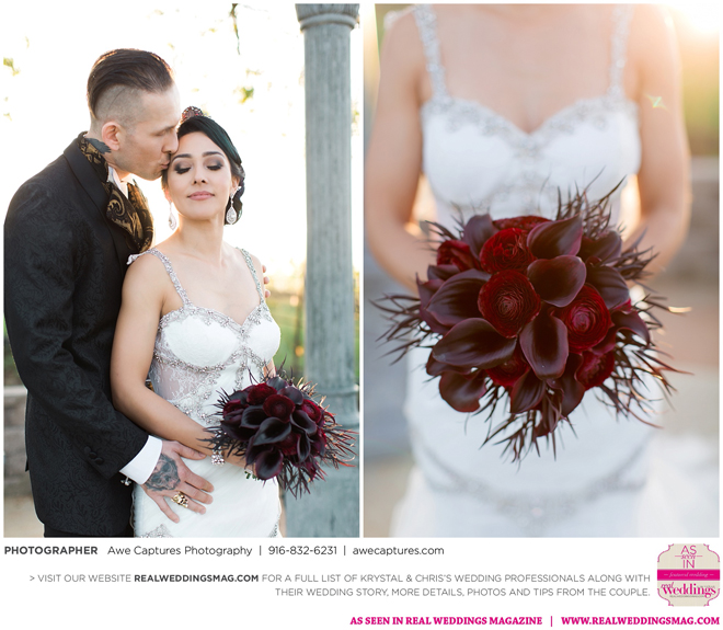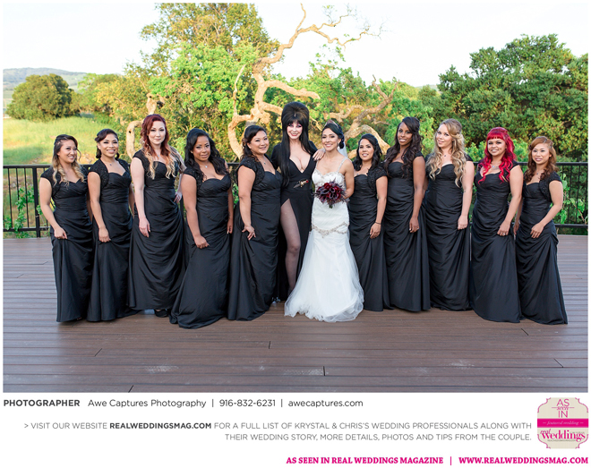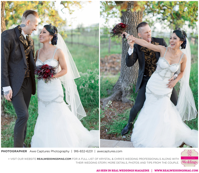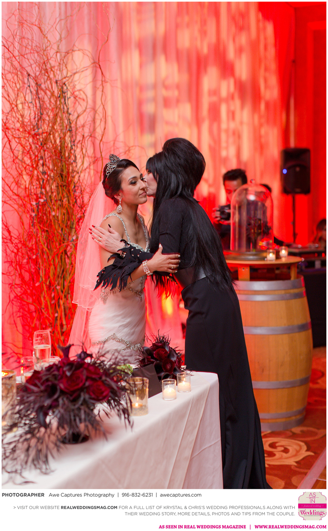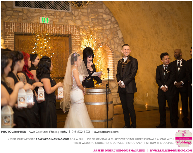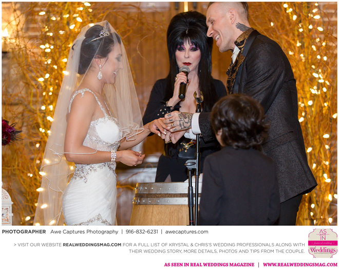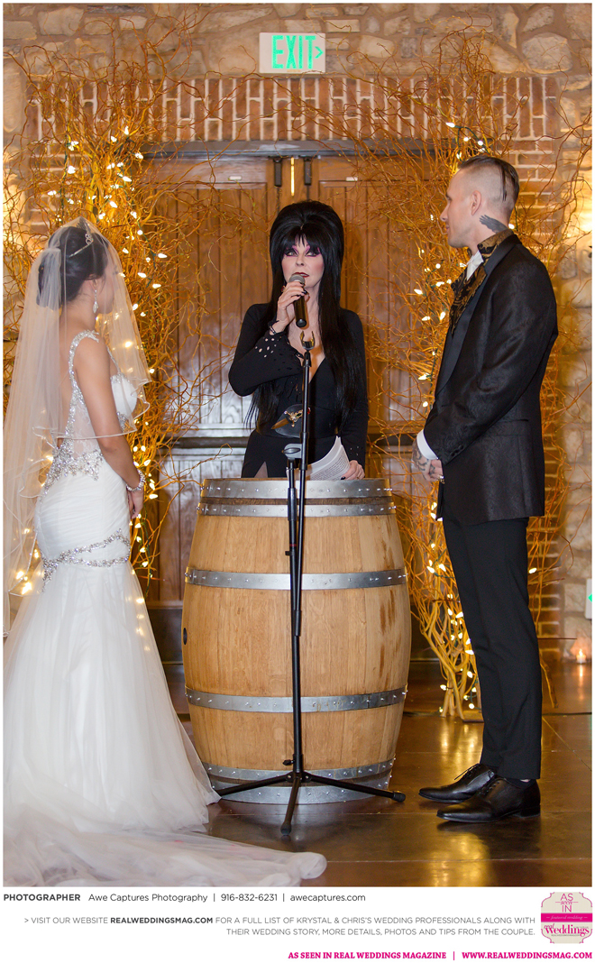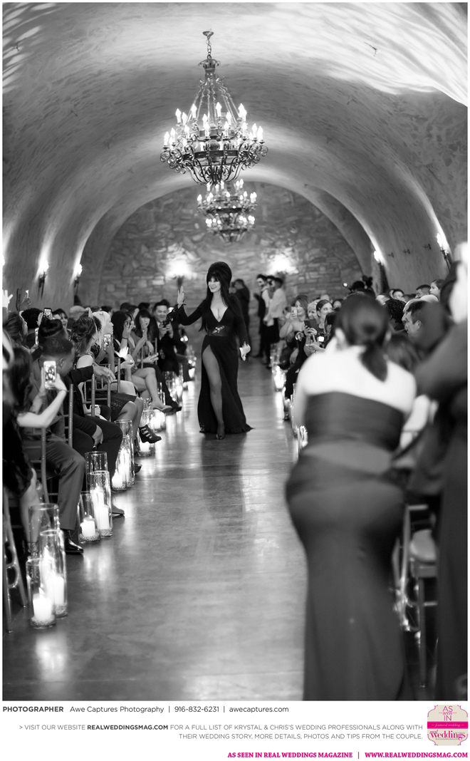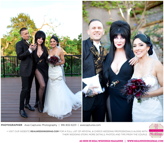 Elvira, Mistress of the Dark, a good friend of the couple, officiated the wedding, which took place in a cave at the resort. “We kept it a surprise so everyone was in complete awe when she made her entrance,” says Krystal, who worked on the vows with Elvira. “She made it fun and exciting. Not a dull moment. Definitely out of the ordinary.”