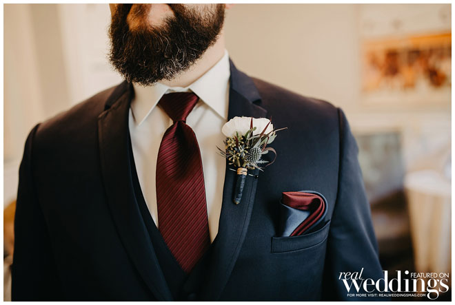 Groom’s Boutonniere was white ranunculus with blush, burgundy and navy accents.