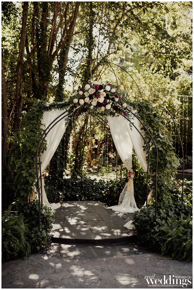 Bouquets and Ceremony Arch – Eucalyptus greenery, Roses, Lisianthus, Dahlias, thistle and succulents. Blush and burgundy colors with navy thistle.