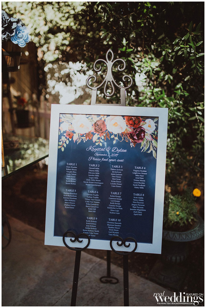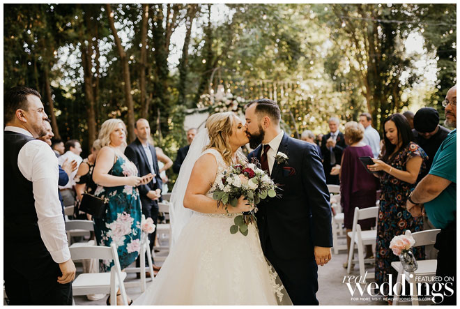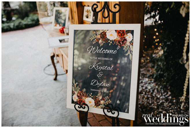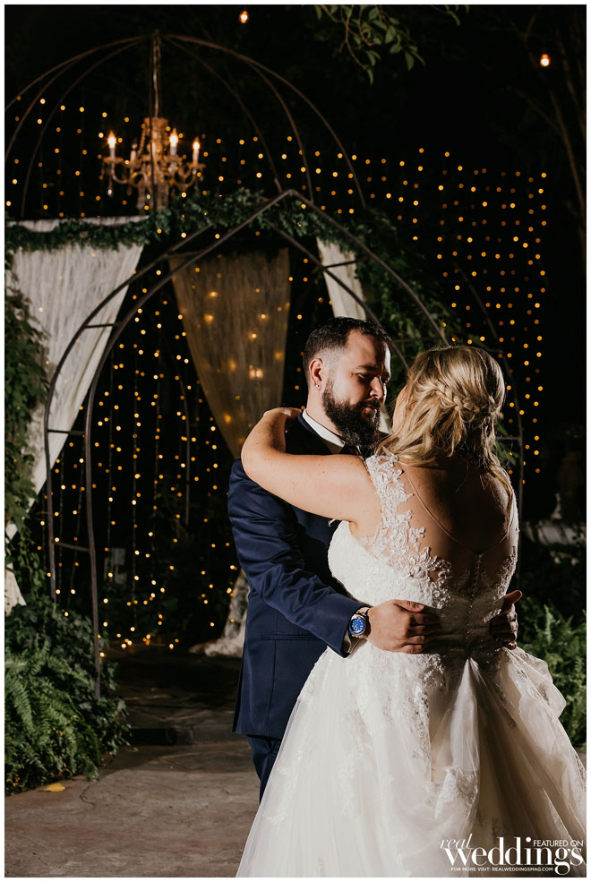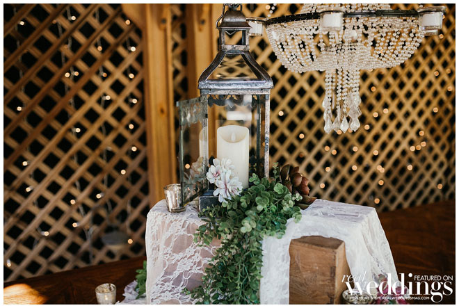 The ceremony was truly a family affair. Krystal’s uncle officiated the ceremony, and her brothers took the honor of walking her down the aisle, as her father had passed away. “I also made sure to have a sign in the first chair on my side, just for him that said, ‘reserved for the father of the bride who celebrated with us in heaven.’” She also placed a boutonnière on the chair for him. All three of the couple’s children also participated as flower girl and ring bearers. “Our vows were very heartfelt and had most everyone in tears, including our two oldest children,” says the bride. This reception followed, decked with greenery and flowers, lights and draping crystals. “Our first dance was one of my favorite parts of the reception,” says Krystal, “And finally getting to mingle with all the guests as much as possible. Also, my matron of honor’s speech was epic.”