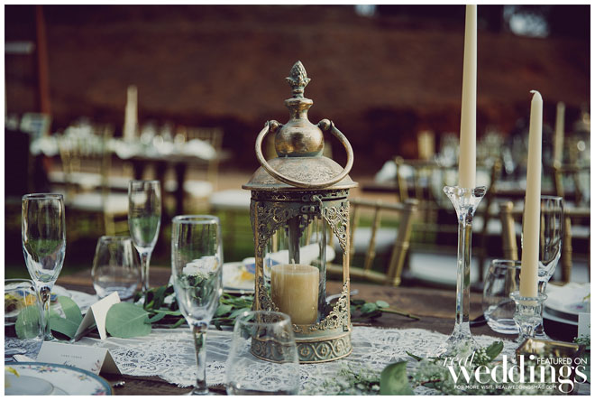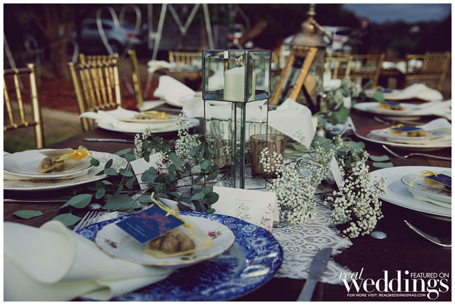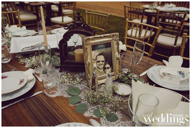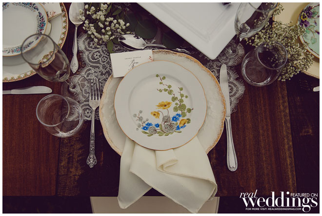 The couple desired a vintage-style wedding. “We wanted our wedding to be magical and dreamlike,” shares Lara. They decided early on to do everything themselves to save some money. “Together we had a blast getting all the decorations,” says the bride. “We shopped at Goodwill multiple times a week to collect all the plates, utensils and table decorations to give it that vintage feel. We needed 120 so it took a lot of trips to all different locations but it was tons of fun.”