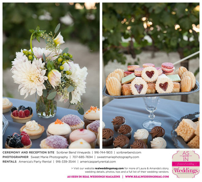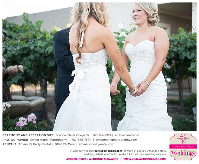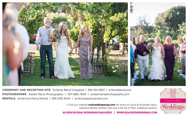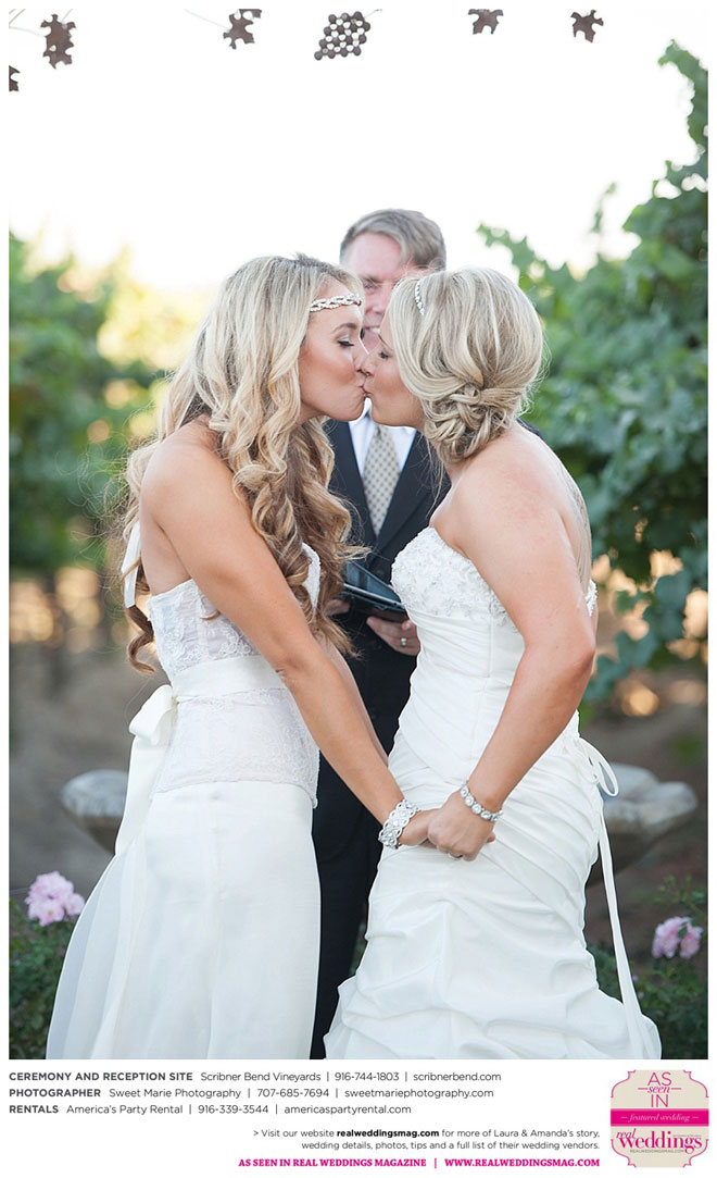 The guest list included 90 people, with about a third of them from out of state, including Laura’s family from Missouri and Florida. They exchanged “I Dos” on a grassy area in the vineyards, and because there wasn’t a wedding party, “everyone’s eyes were focused on us,” says Amanda. “We were escorted by both of our parents—holding the hands of our mothers (best friends) and through the arms of our fathers (our guardians).” Amanda was so excited that she “ended up kissing Laura before the officiant gave [them] the go ahead.”