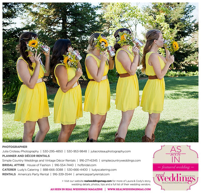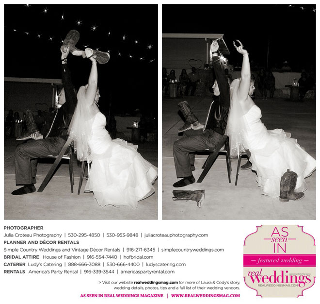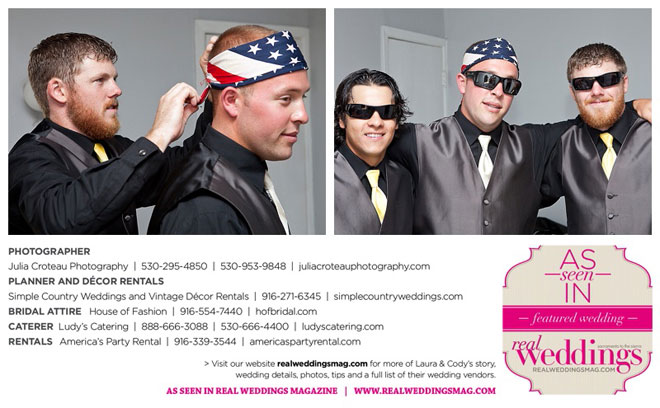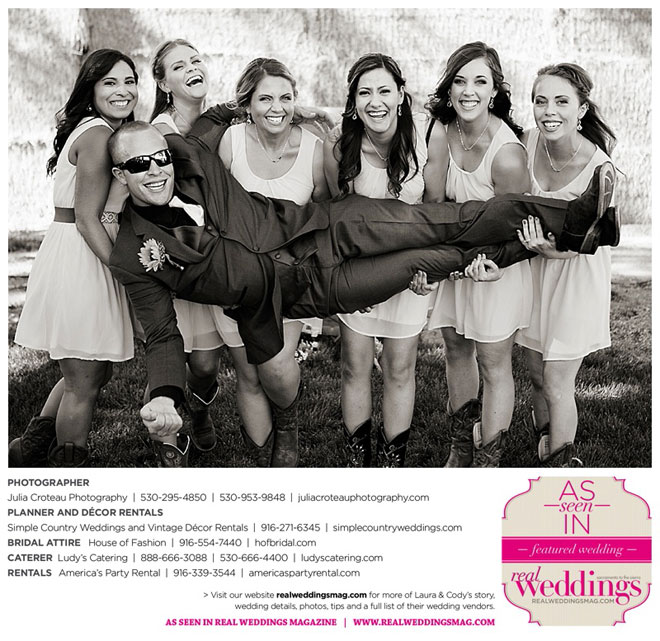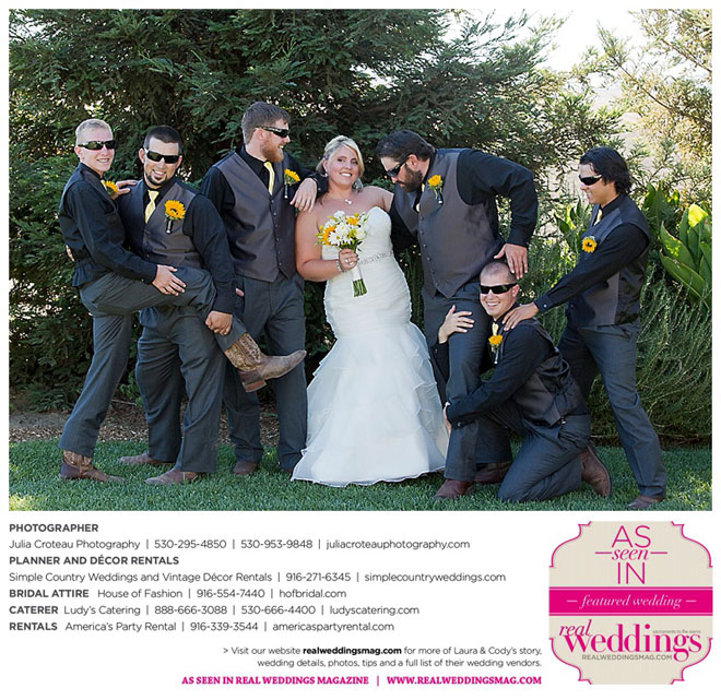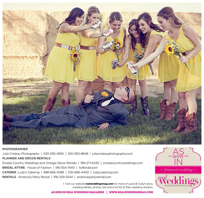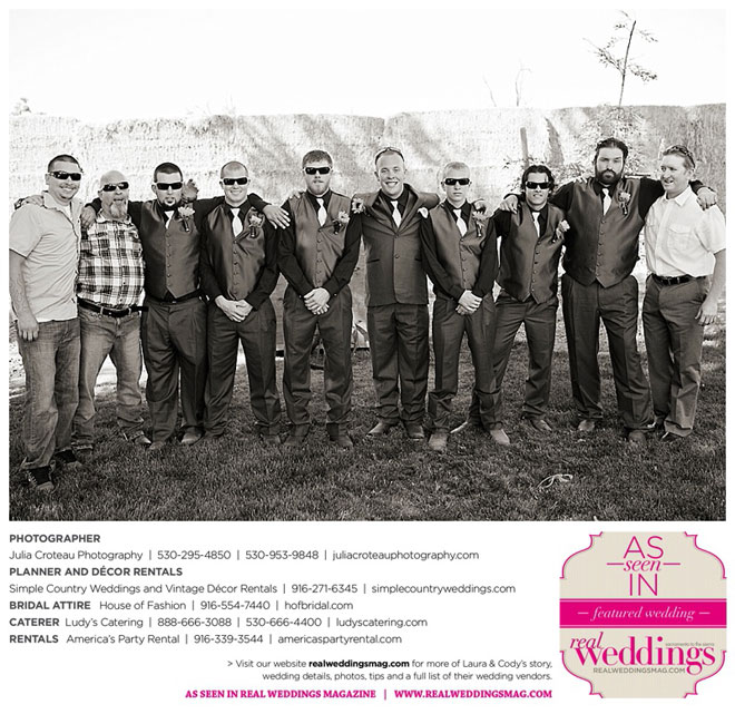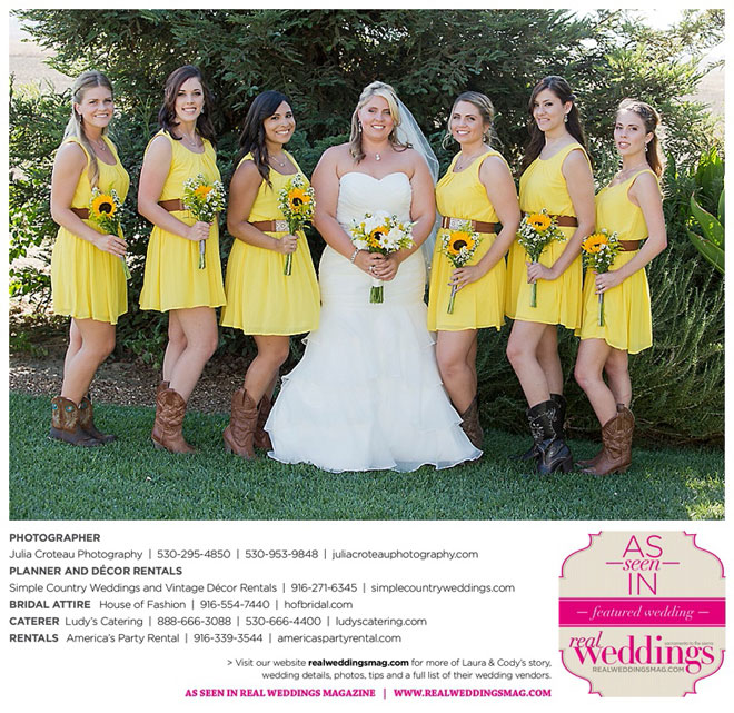 Cody wore a tuxedo, and his personal touches were the Oakley sunglasses and cowboy boots that he and all the groomsmen wore. In fact, the bride and bridesmaids wore cowboy boots, too.