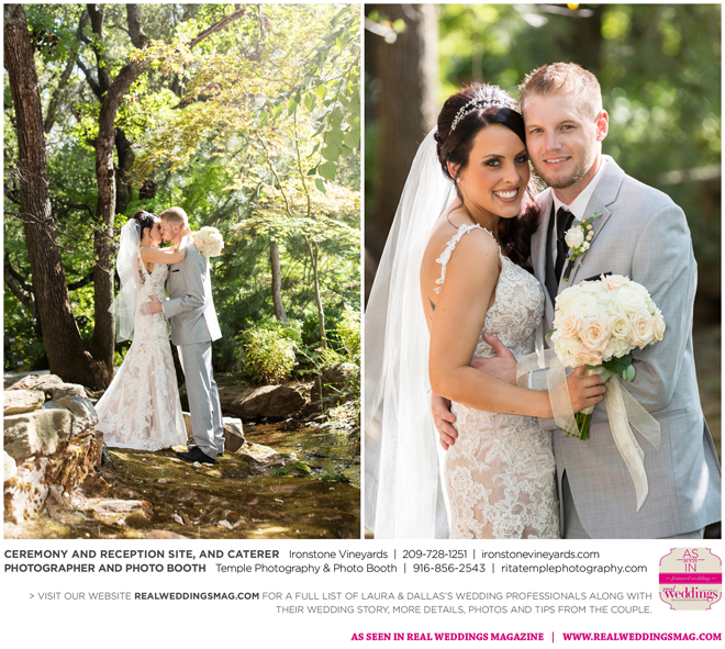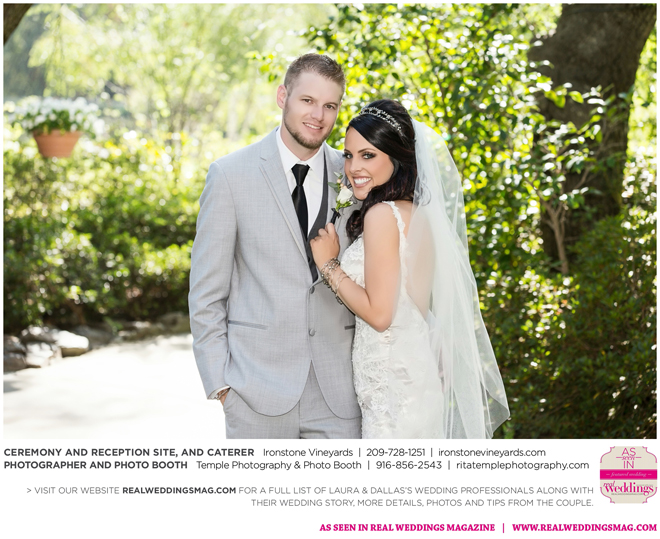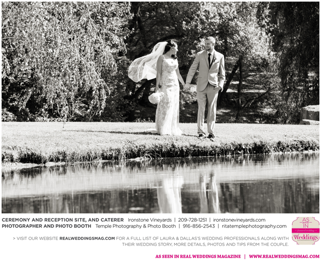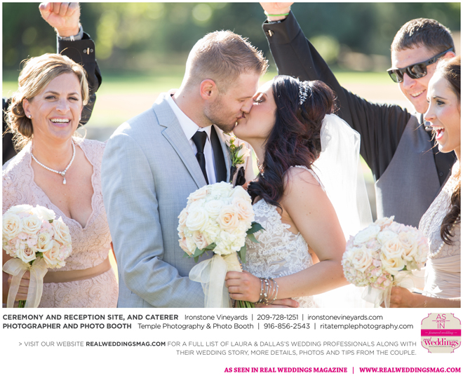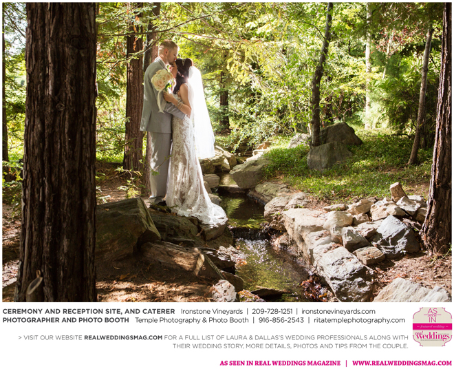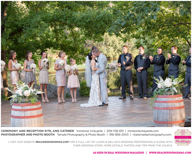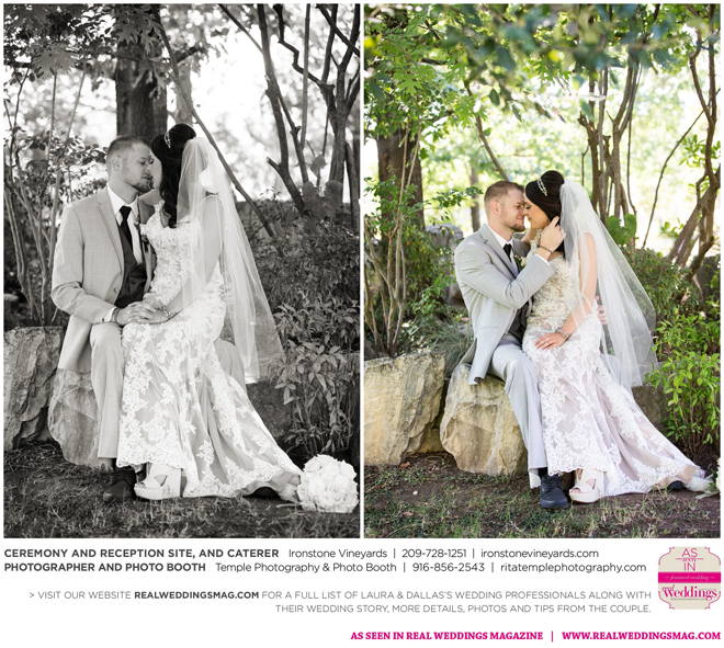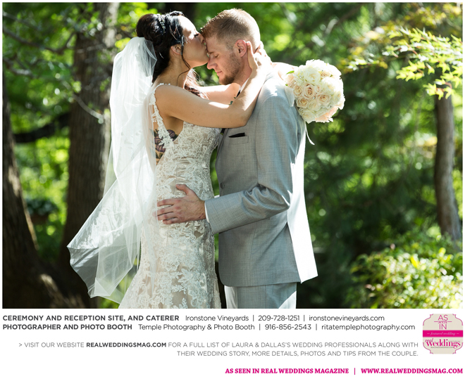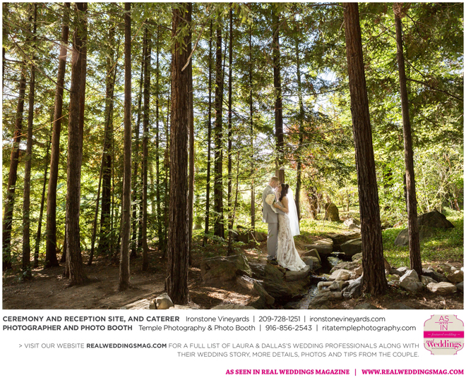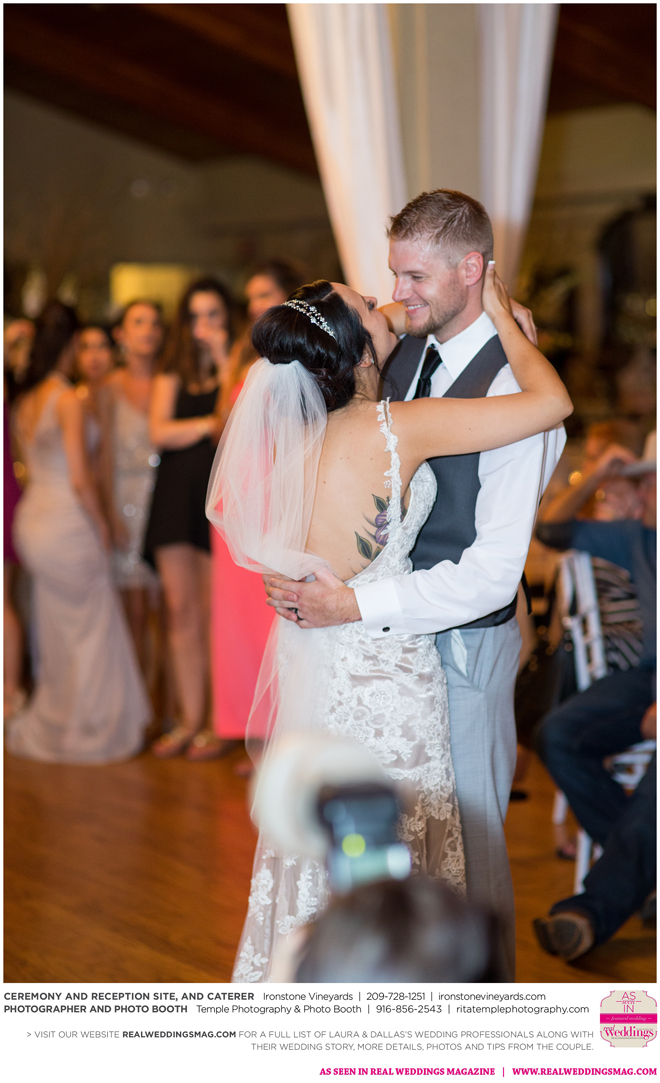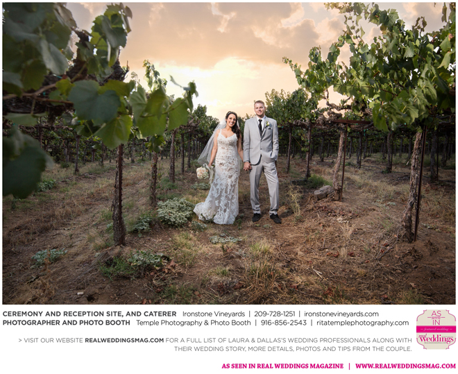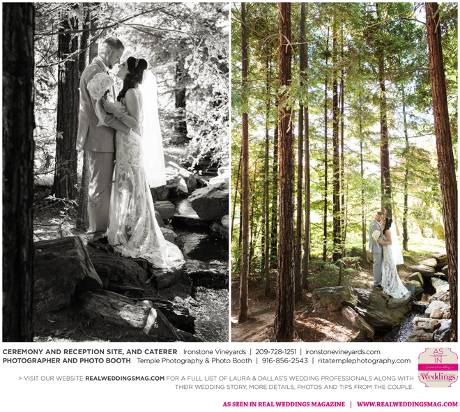 They married eight months later in a simple ceremony at Ironstone Vineyard in Murphys, CA. They love the atmosphere at the winery, which they go to often. They took photos all over the lush vineyard and celebrated their reception at the venue too.