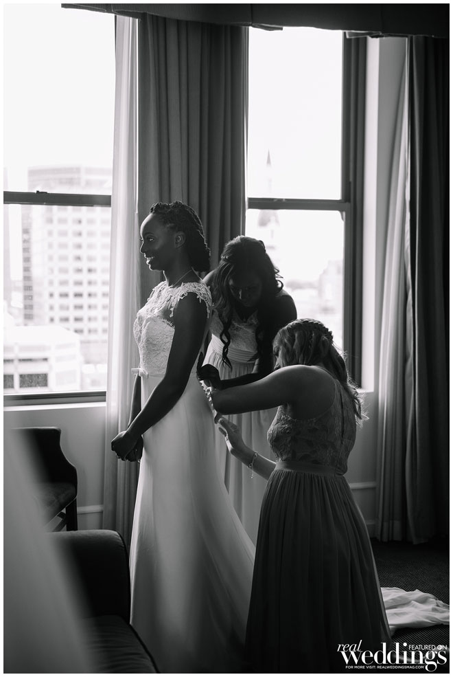 Lauren and Bryce are both easygoing, chill people who love food. “We expected to have an easy wedding day with delicious food and cake to eat,” says the bride. With the help of Lauren’s mom and their wedding planner, the vision for the wedding came together perfectly without much stress. “My favorite time was finding my dream dress in my small hometown, Elmira, New York,” she says. “My dress was one of the few things I had a vision for.”