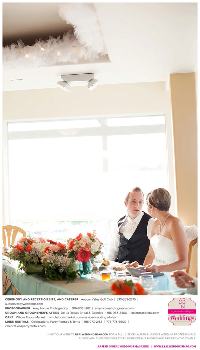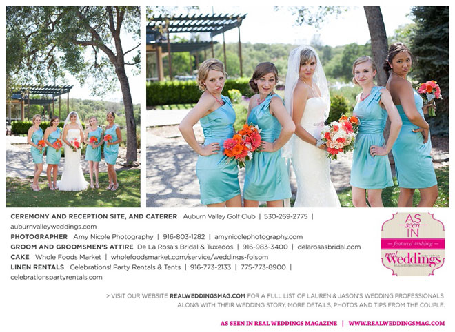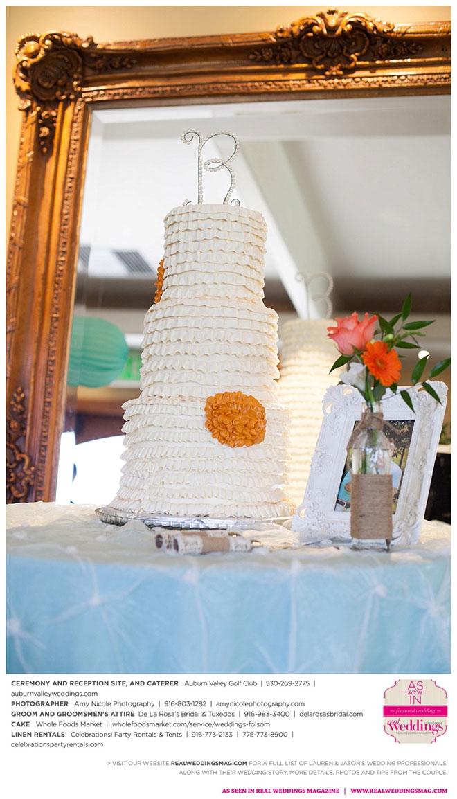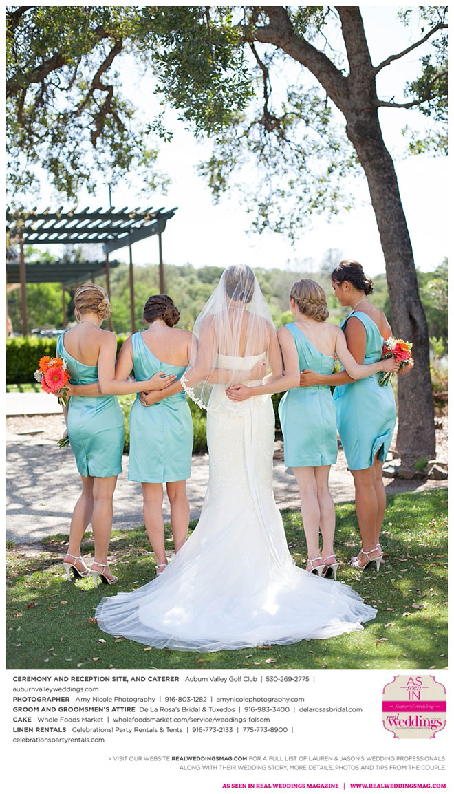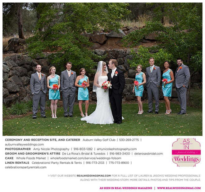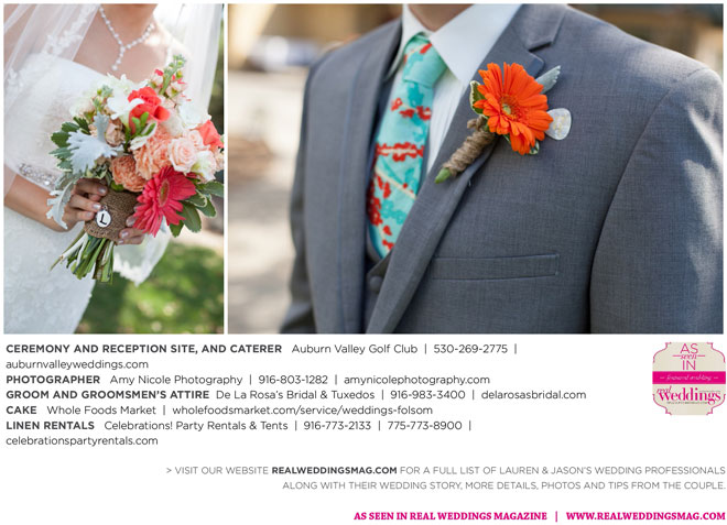 The color scheme of tangerine, coral, Tiffany blue and turquoise was perfect for the summer wedding. Lauren honored family in her wedding attire, tucking her grandmother’s blue floral handkerchief into the garter for her “something old” and “something blue.” Her mother-in-law made her “something new,” a headband.