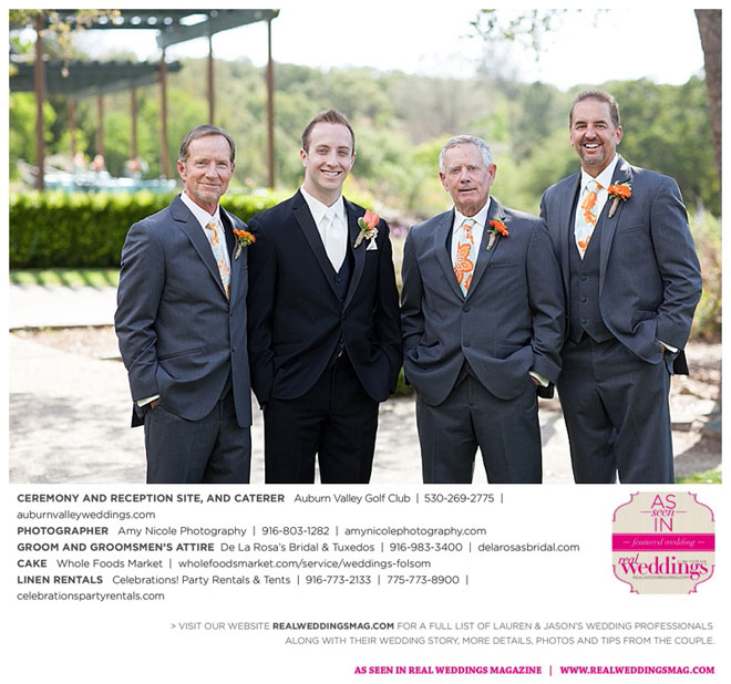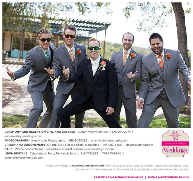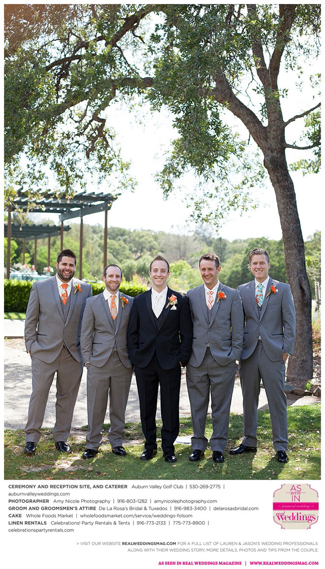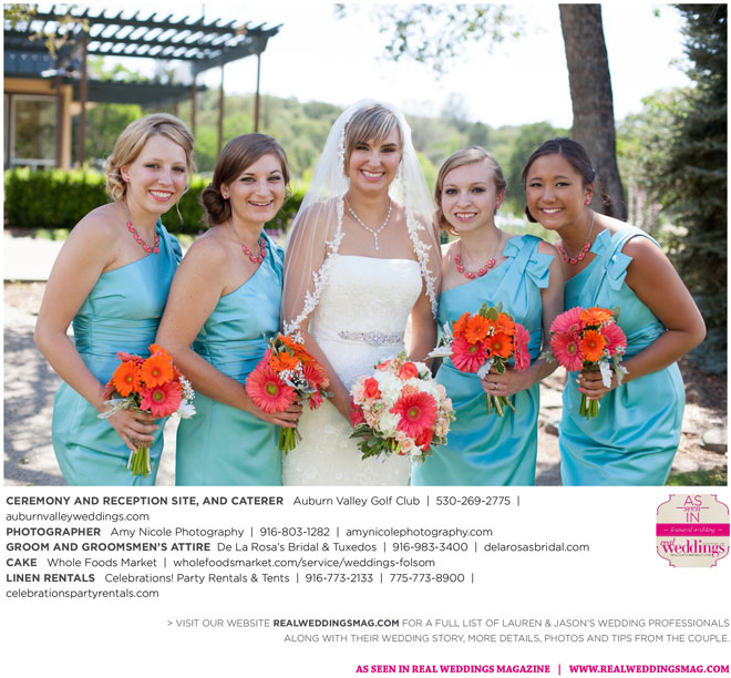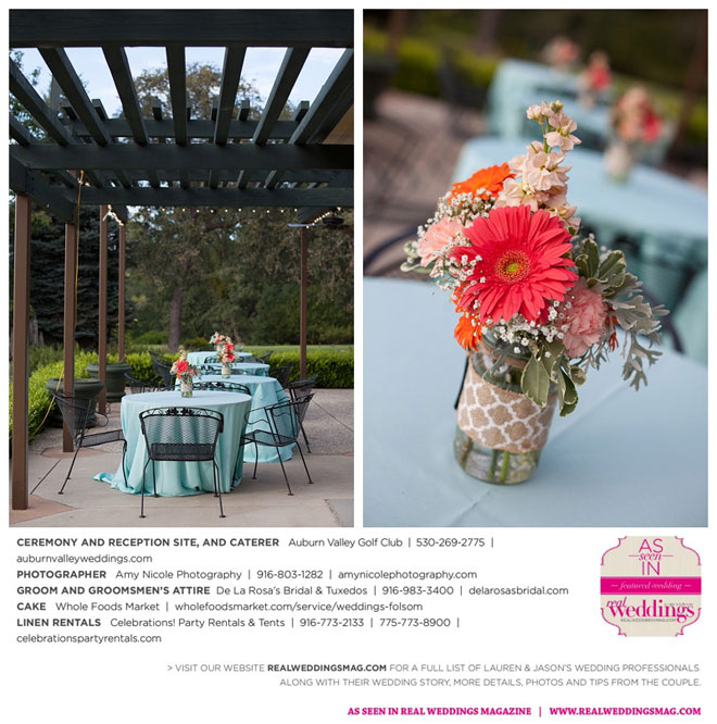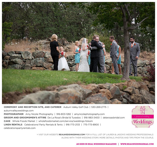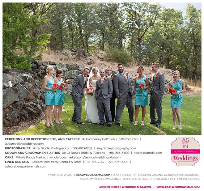 The color scheme of tangerine, coral, Tiffany blue and turquoise was perfect for the summer wedding. Lauren honored family in her wedding attire, tucking her grandmother’s blue floral handkerchief into the garter for her “something old” and “something blue.” Her mother-in-law made her “something new,” a headband.