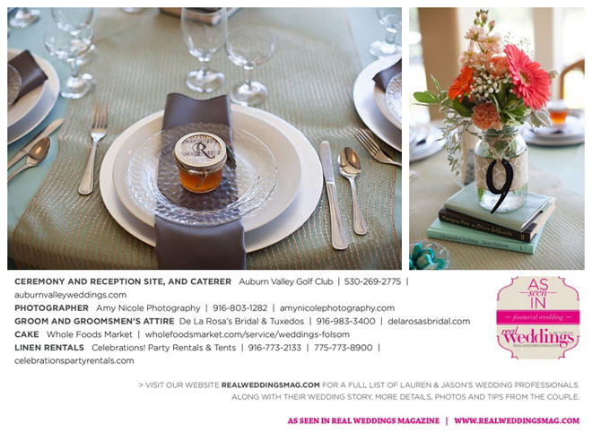 Jason’s favorite wedding detail was the homemade peach jam in four-ounce crystal-quilted jelly jars. Wedding favors featured tea-stained sheet music cut to fit the jelly jar lids, which were stamped in black ink with “R,” the initial of the couple’s last name. Tiffany blue cardstock tags finished the favors with the words, “Let’s Jam.”